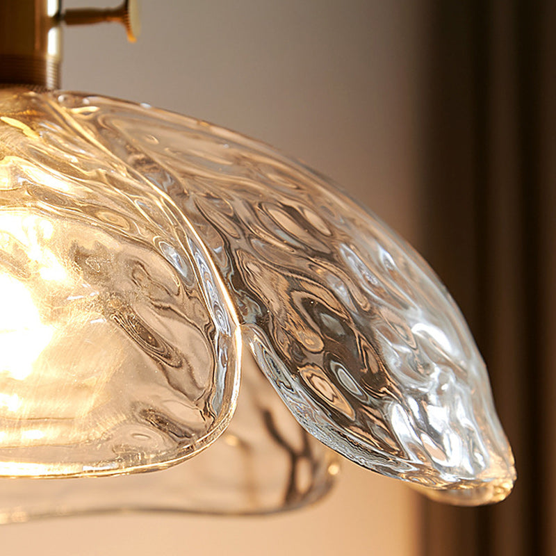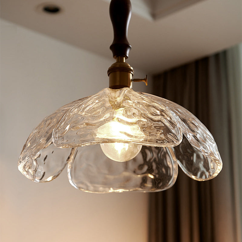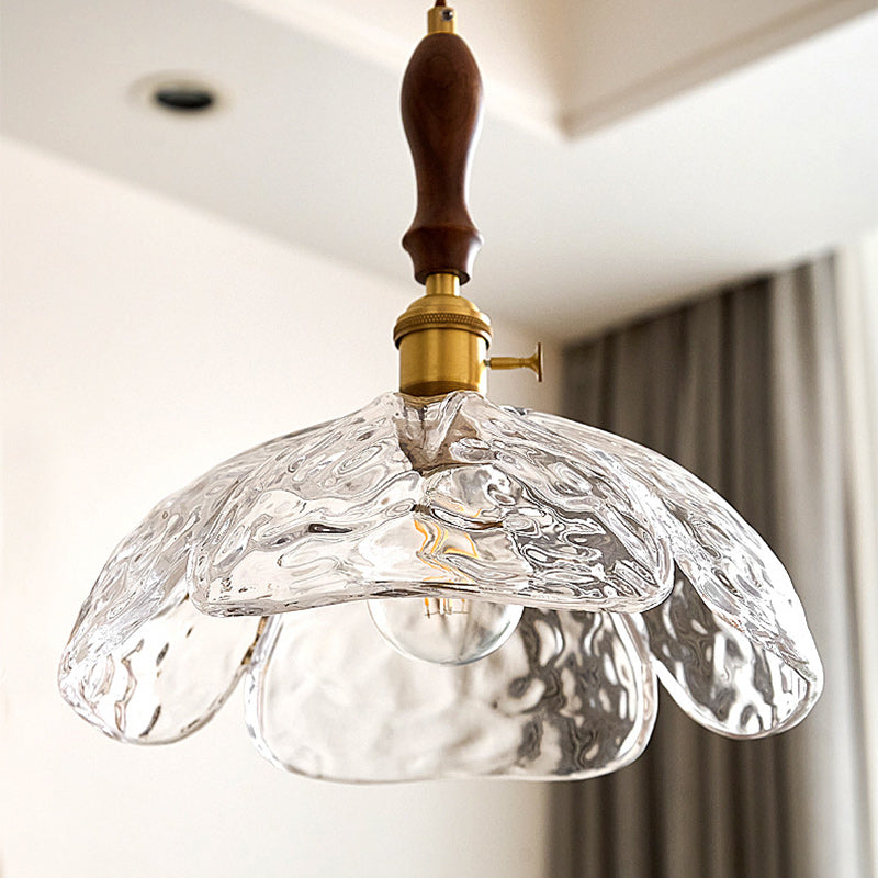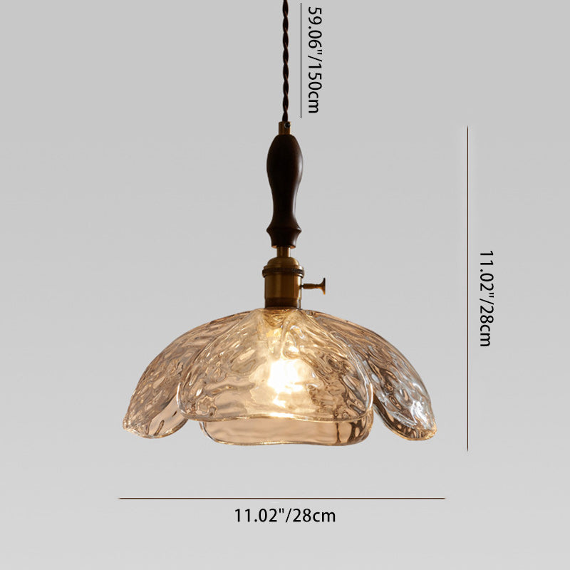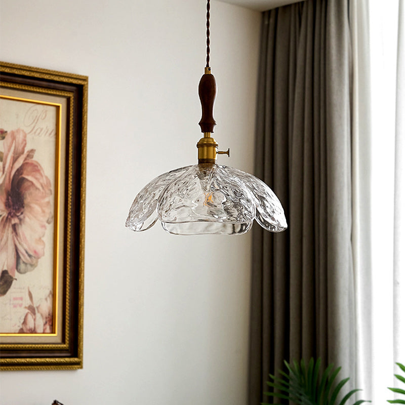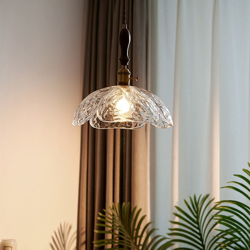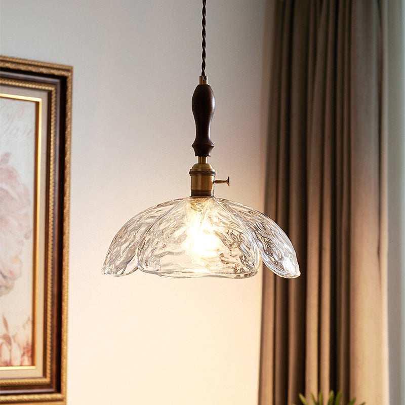 Traditional Japanese Flower Copper Wood Glass 1-Light Pendant Light For Living Room
