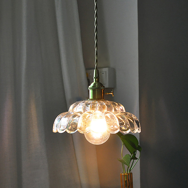 Traditional Japanese Flower Round Glass Brass 1-Light Pendant Light For Living Room