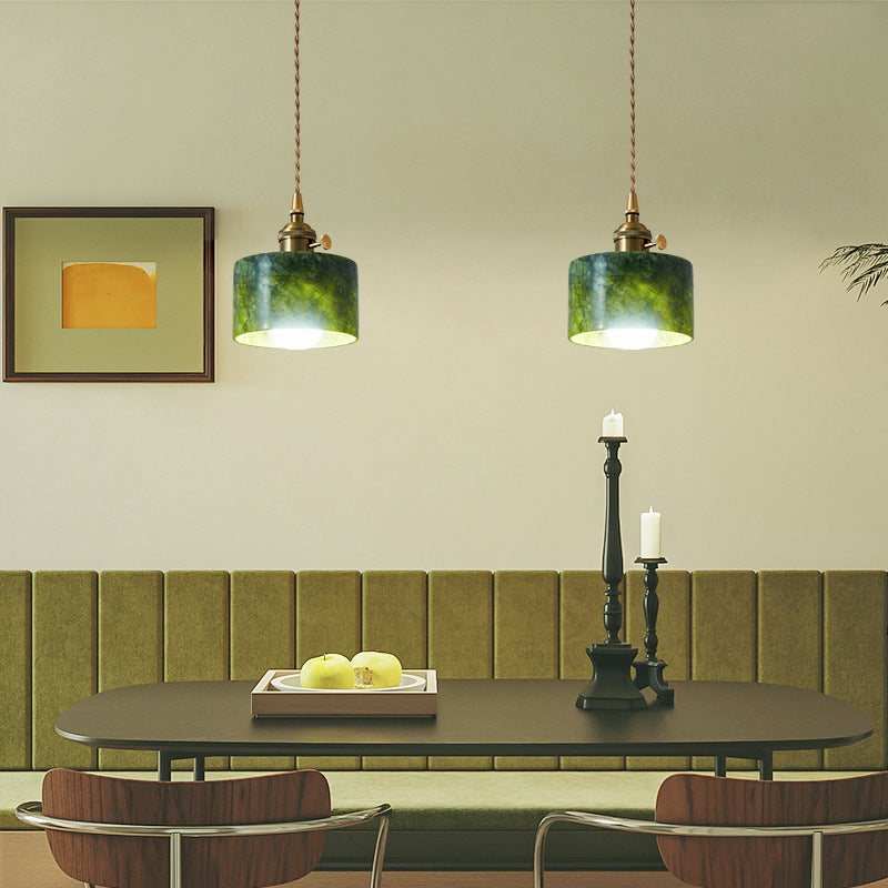 This traditional Japanese pendant light features a globe, cylinder, and semi-dome silhouette, crafted from green jade-textured stone and durable metal. Ideal for bedrooms and living rooms, its elegant form adds a serene, vintage charm to any space.