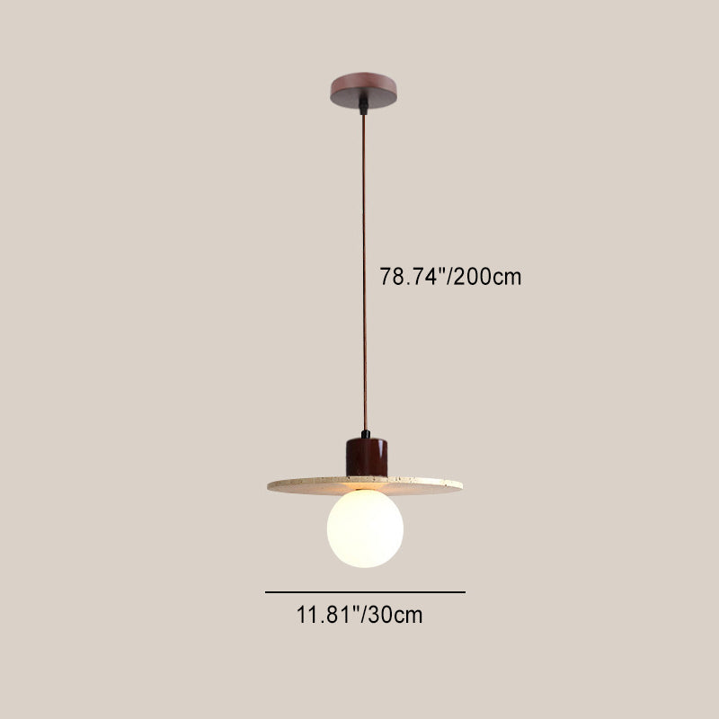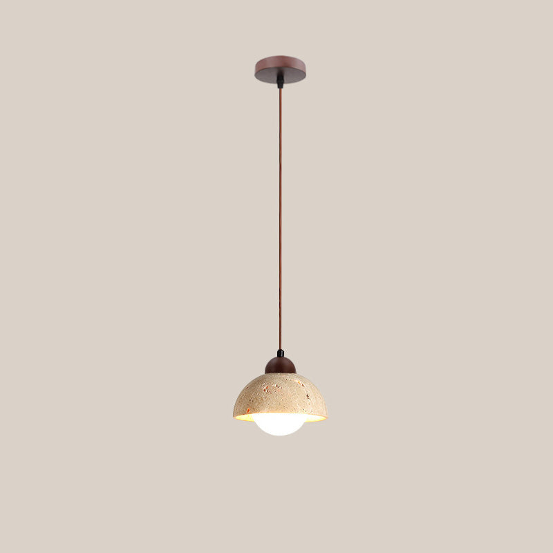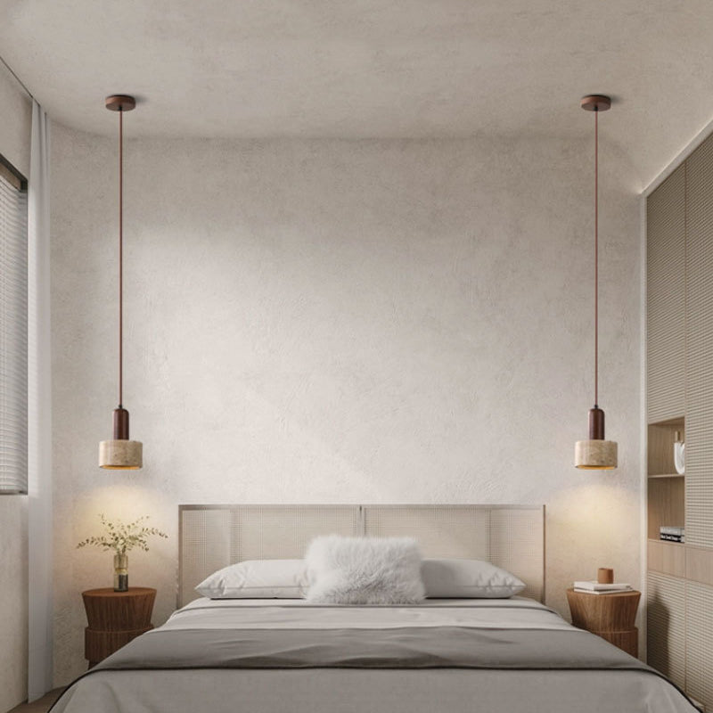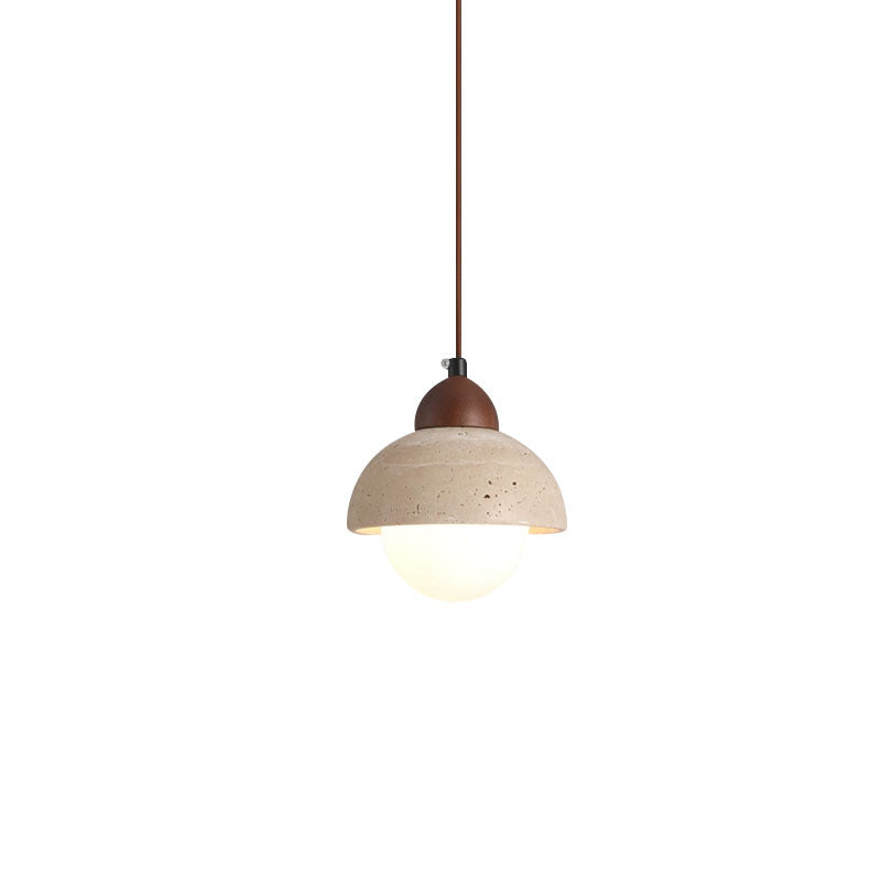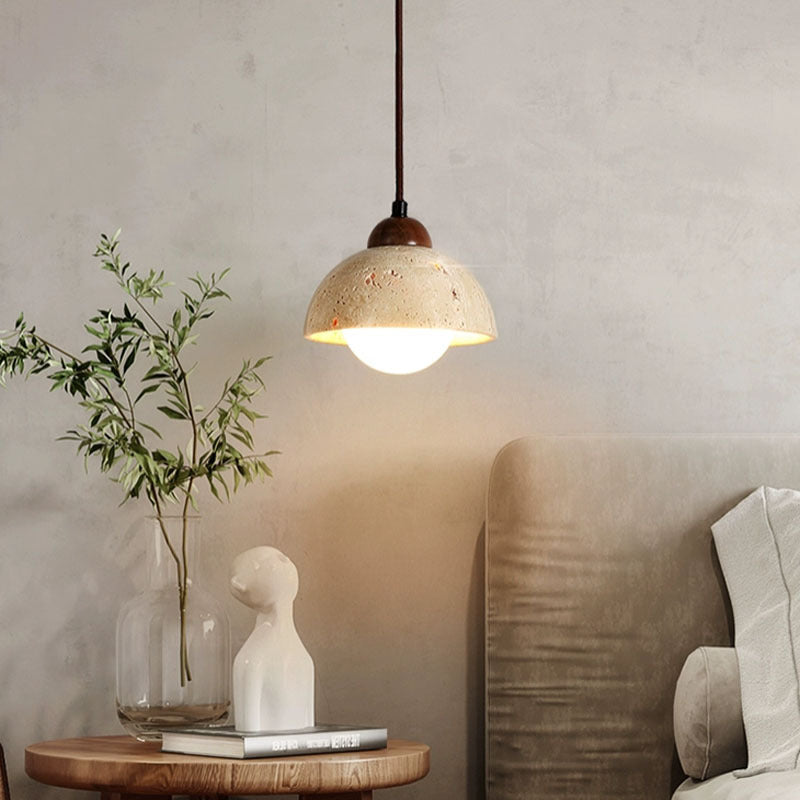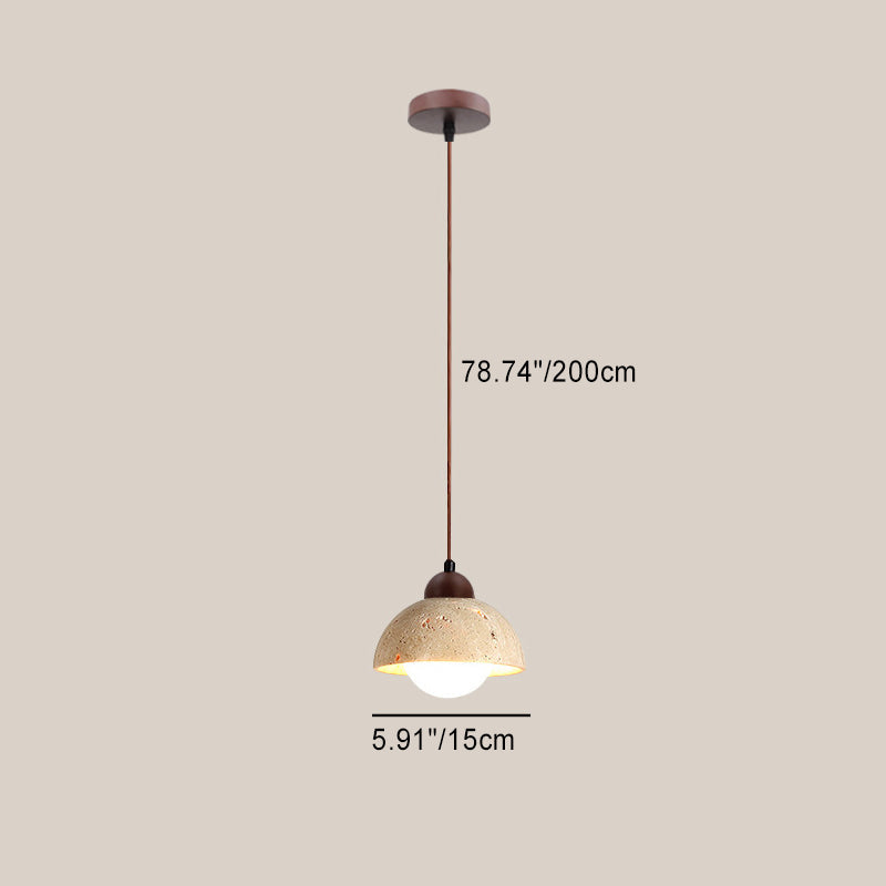 Traditional Japanese Travertine Wood Cylinder Round Bowl Ball 1-Light Pendant Light For Bedside