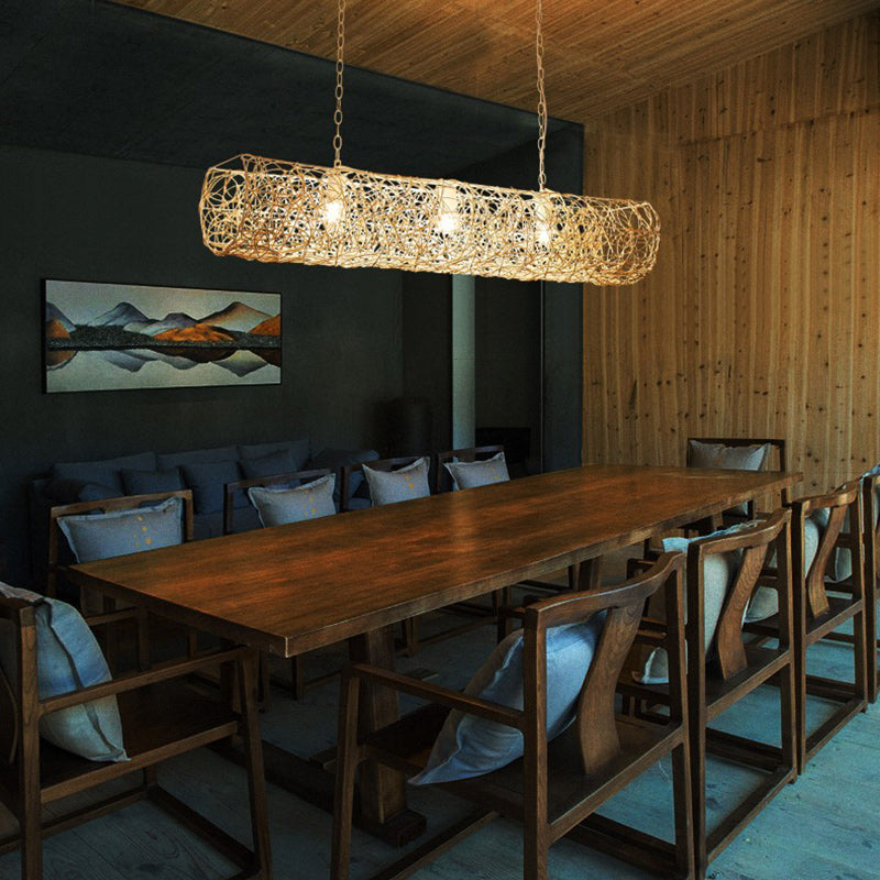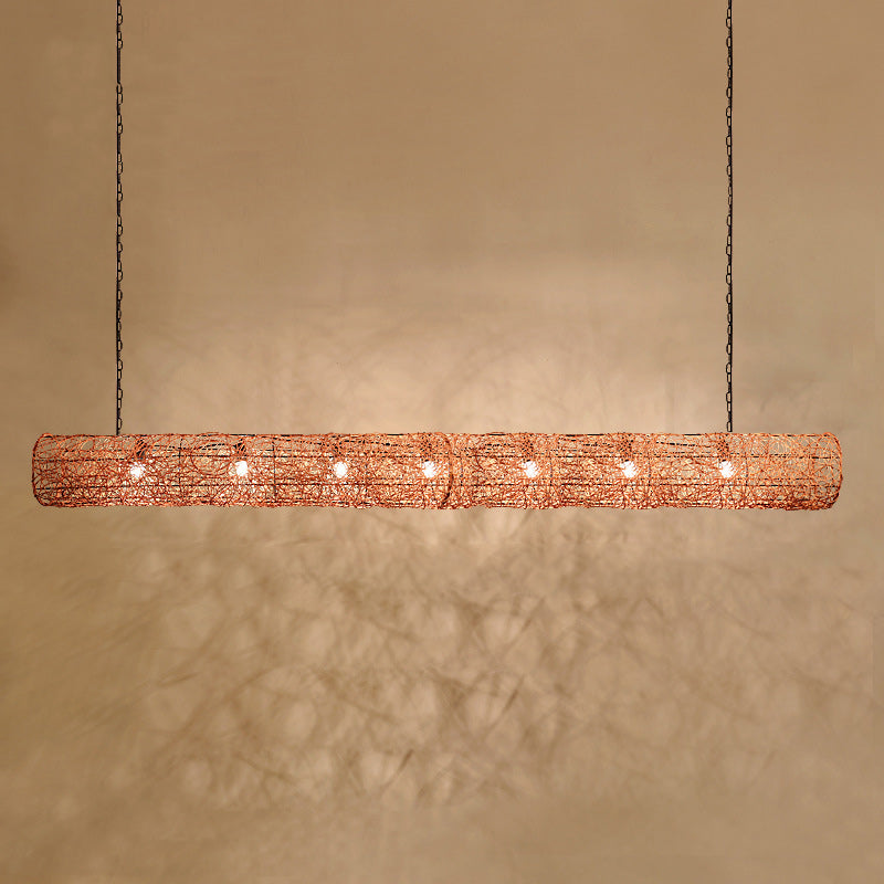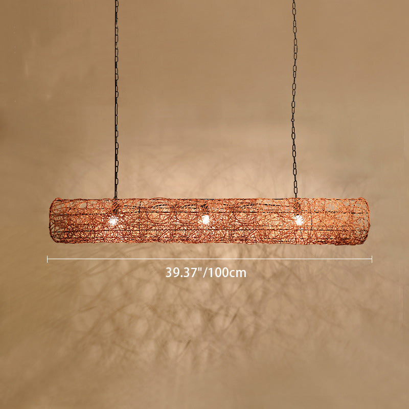 Traditional Japanese Weaving Rattan Metal Cylinder Long Barrel 2/3/4/6/7/9 Light Chandeliers Island Light For Dining Room