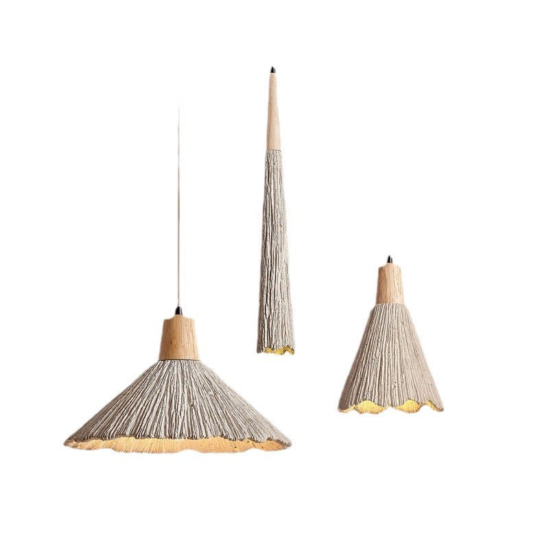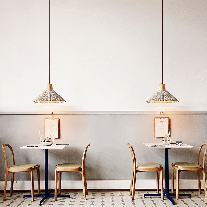 Traditional Japanese Wood Cement Conic Strip Grain 1-Light Pendant Light For Dining Room
