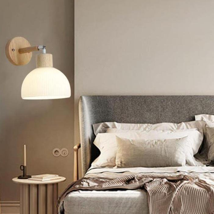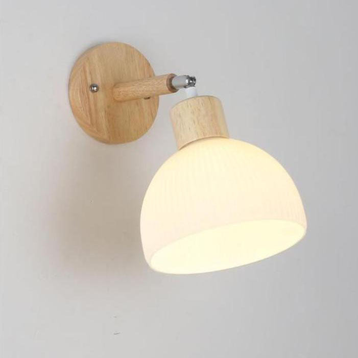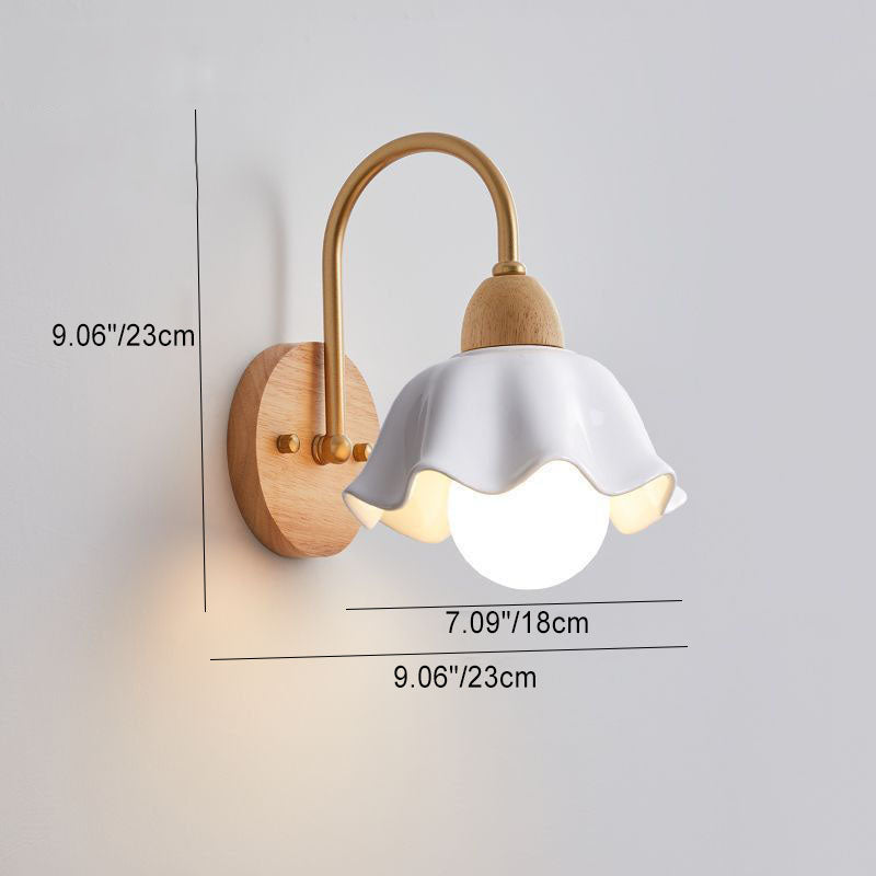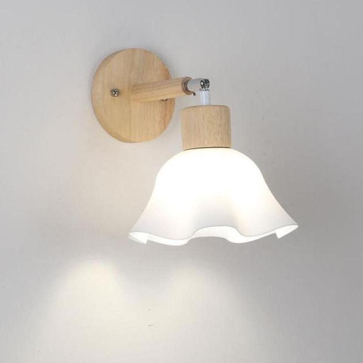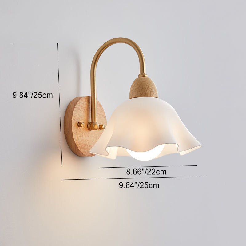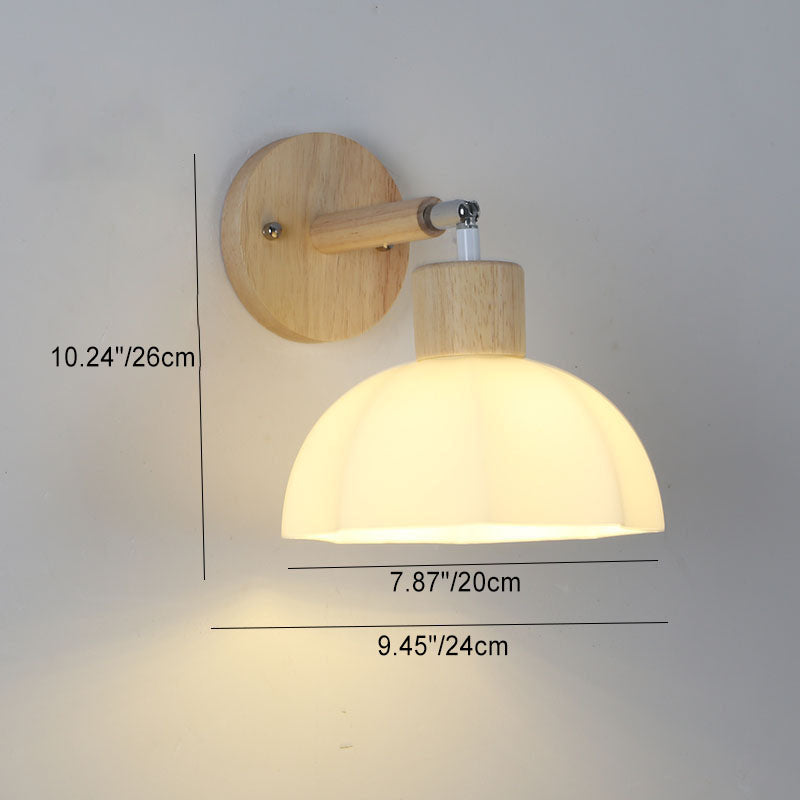 Traditional Japanese Wood Glass Paper Dome Hemispheric Flower Pleated 1-Light Wall Sconce Lamp For Bedside