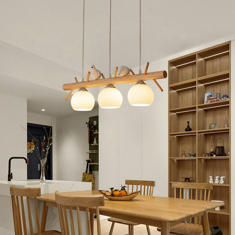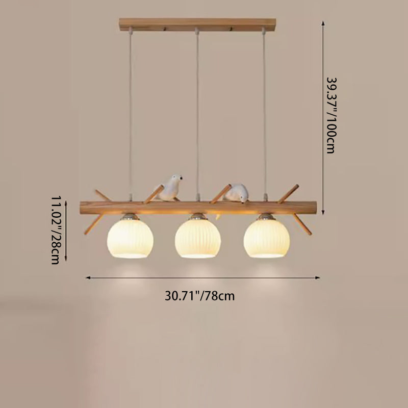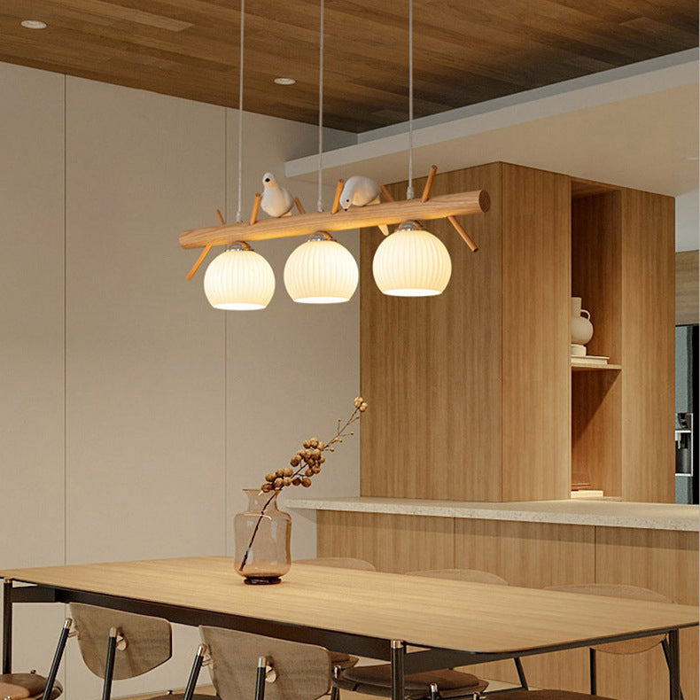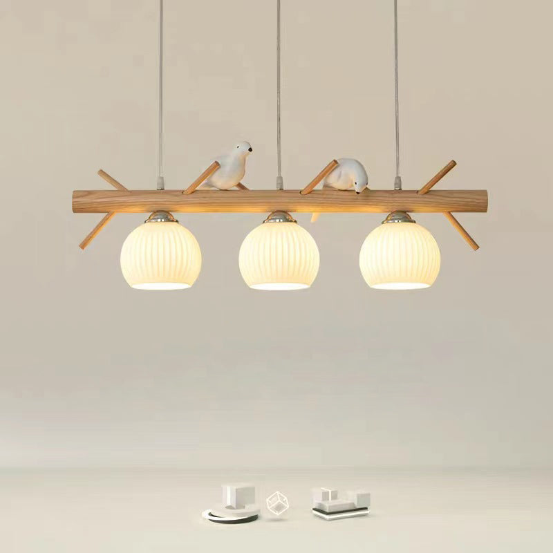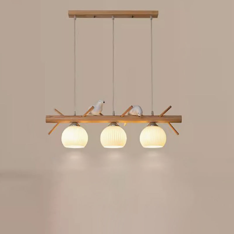 Traditional Japanese Wood Strip Glass Round Shade 3-Light Chandelier Island Light For Living Room