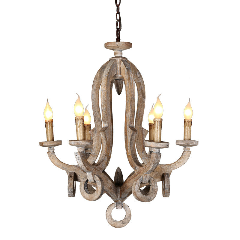 Traditional Rustic Candle Shape Full Wood 6 - Light Chandeliers For Dining Room