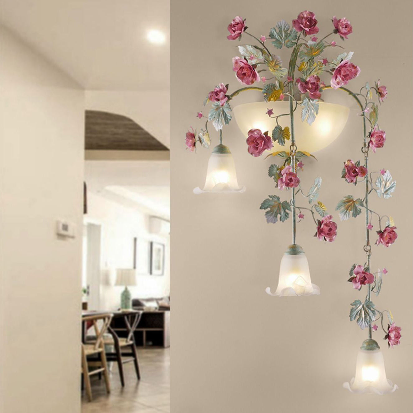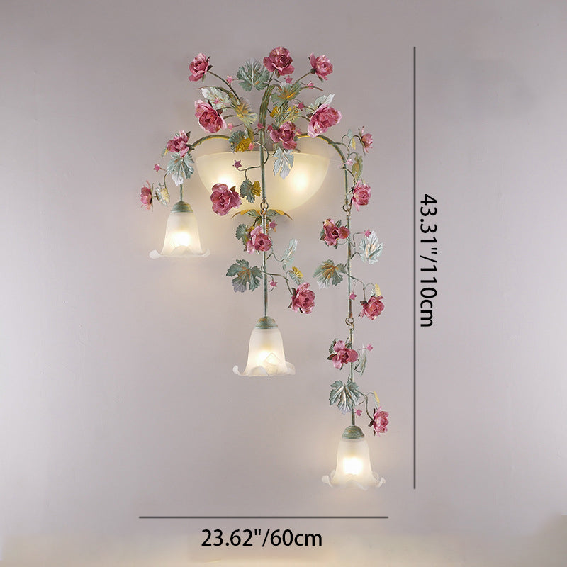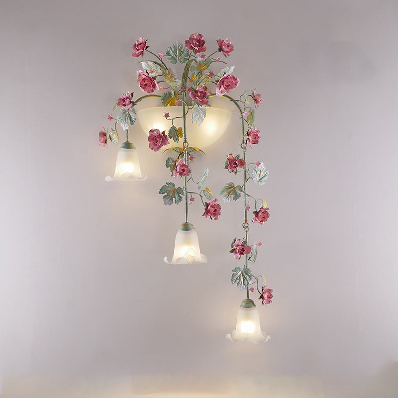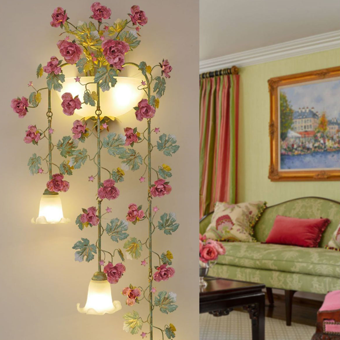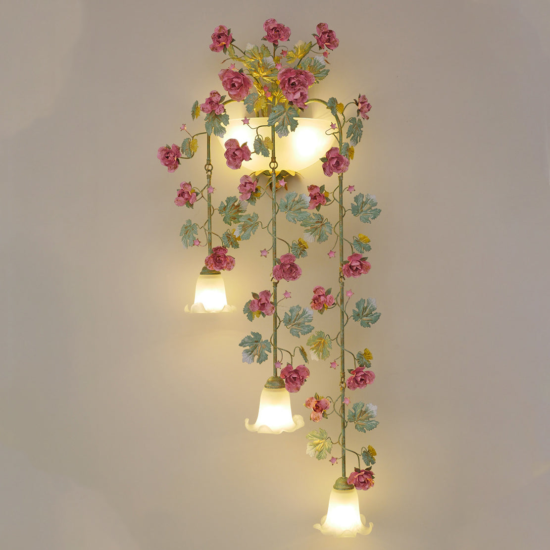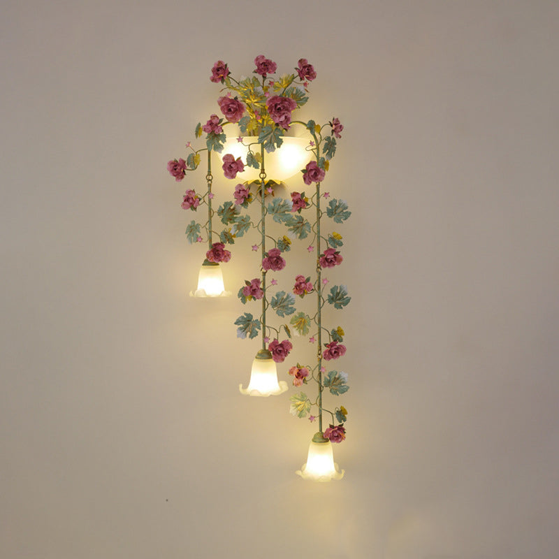 Traditional Rustic Floral Leaf Iron Glass 5-Light Wall Sconce Lamp For Living Room