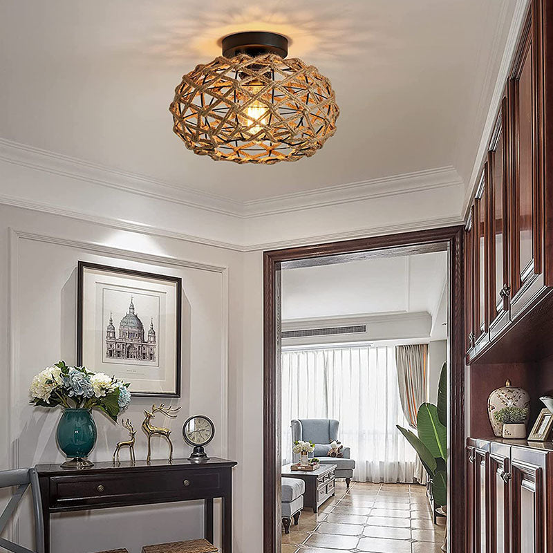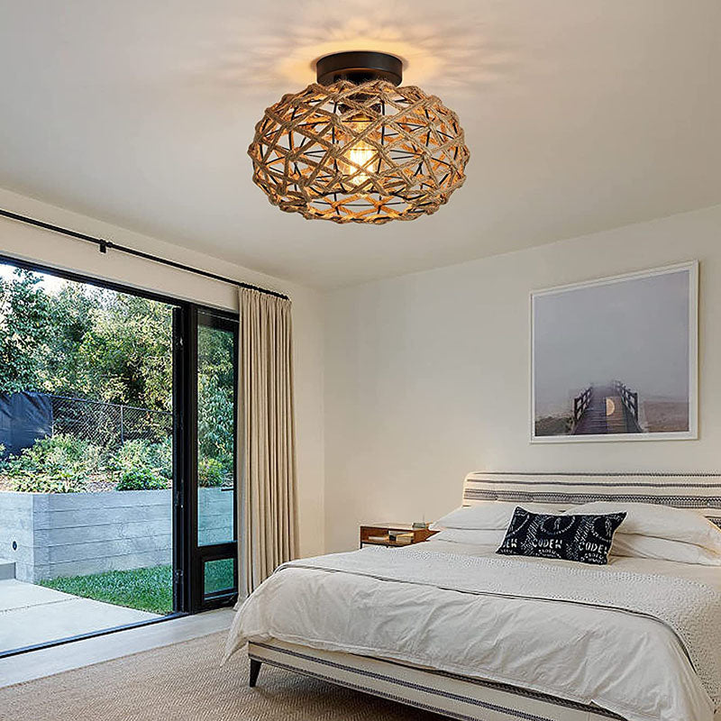 Traditional Rustic Hemp Rope Weaving Iron Cage 1-Light Semi-Flush Mount Ceiling Light For Bedroom