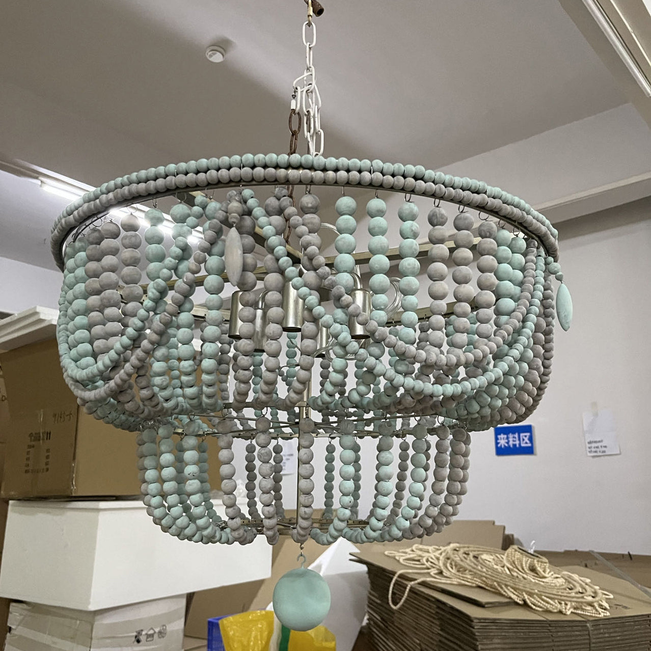 Traditional Rustic Lantern Spherical Iron Wood Bead 4-Light Chandeliers For Living Room
