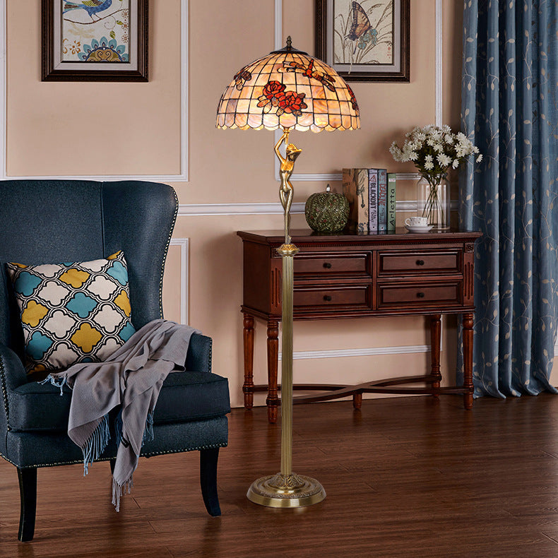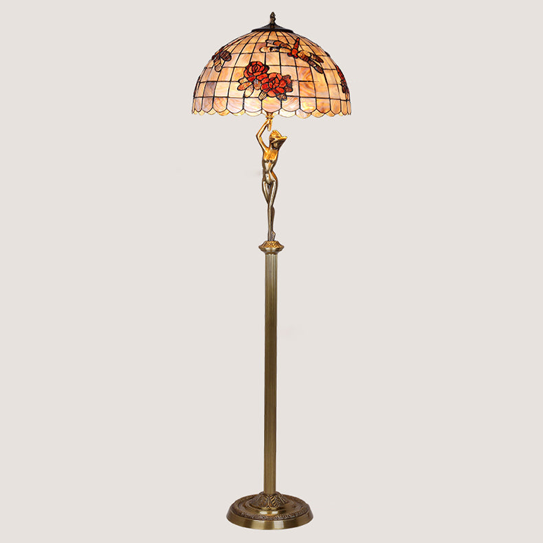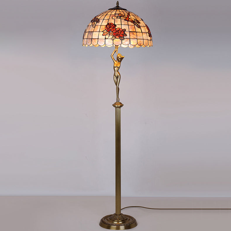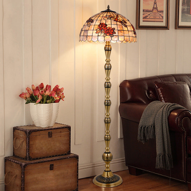 Traditional Tiffany Brass Shell Dome Rose Dragonfly 3-Light Standing Floor Lamp For Living Room