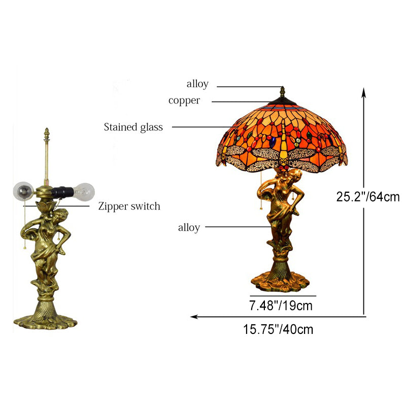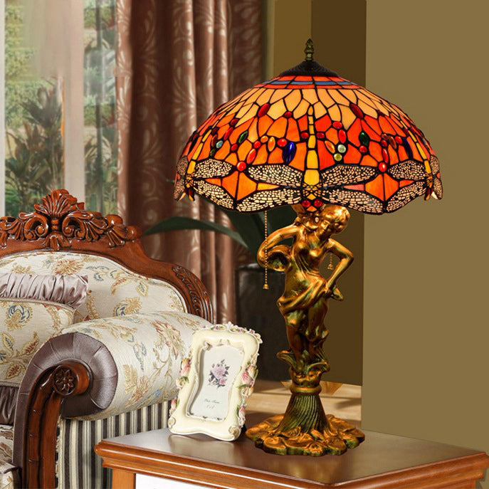 Traditional Tiffany Dragonfly Conical Copper Alloy Stained Glass 3-Light Table Lamp For Bedroom