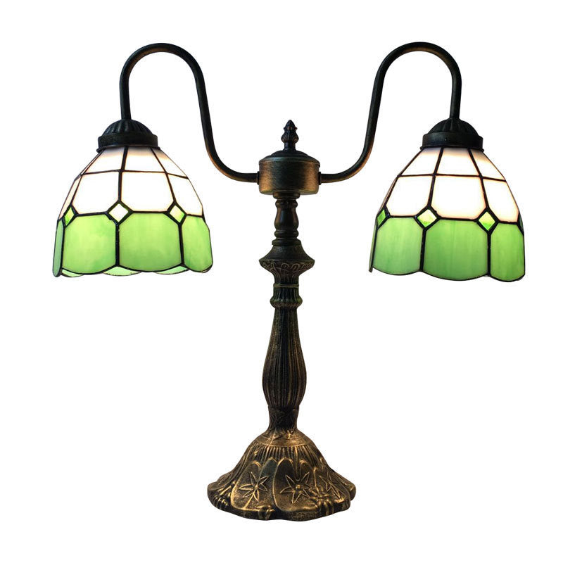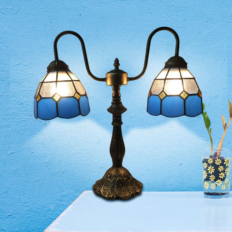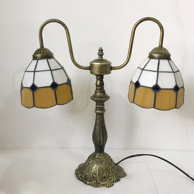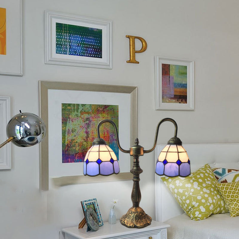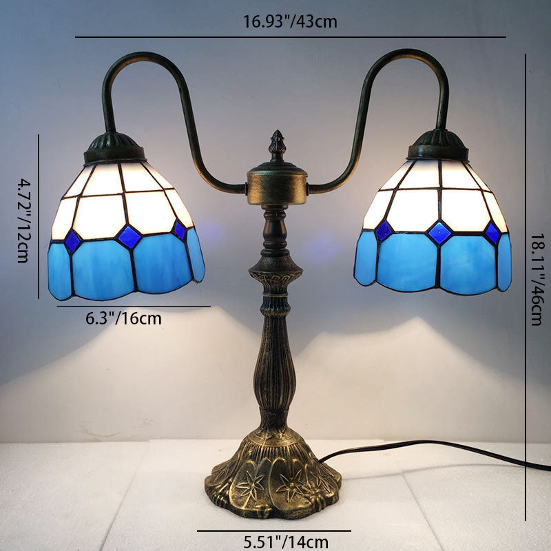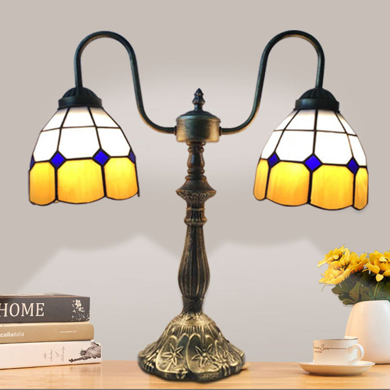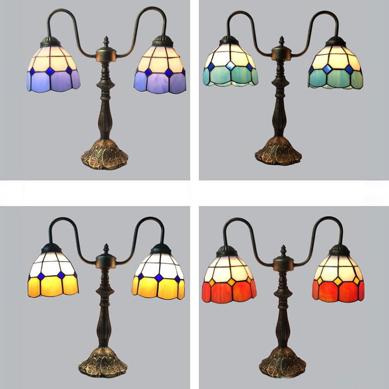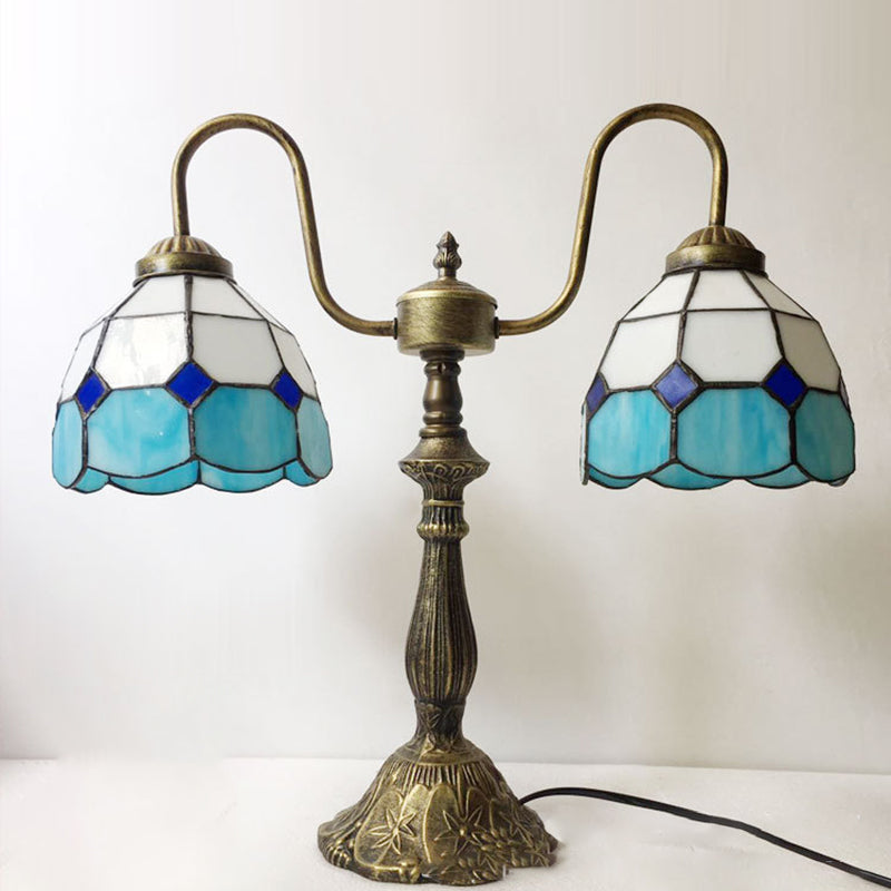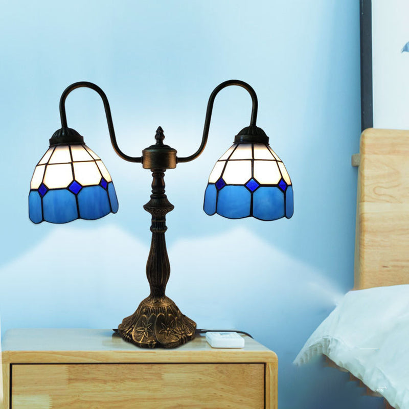 Traditional Tiffany Glass Iron Resin Swan Neck Dome Beads 2-Light Table Lamp For Bedside