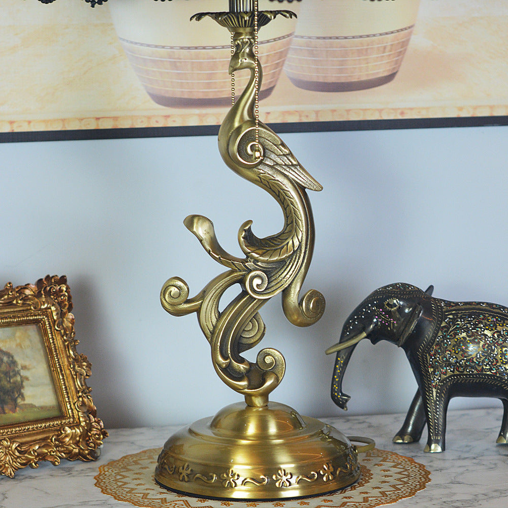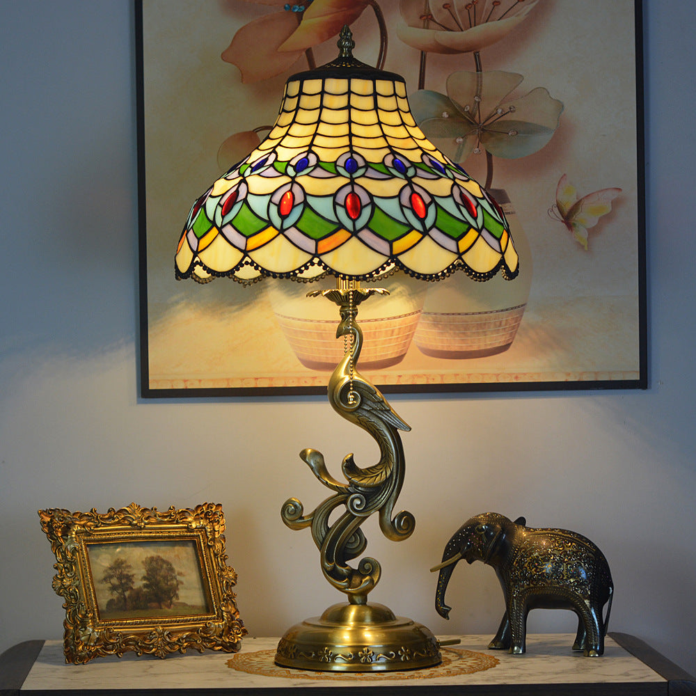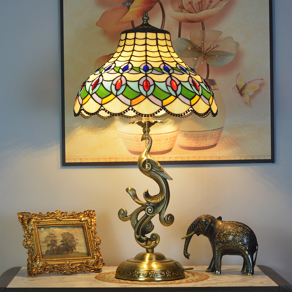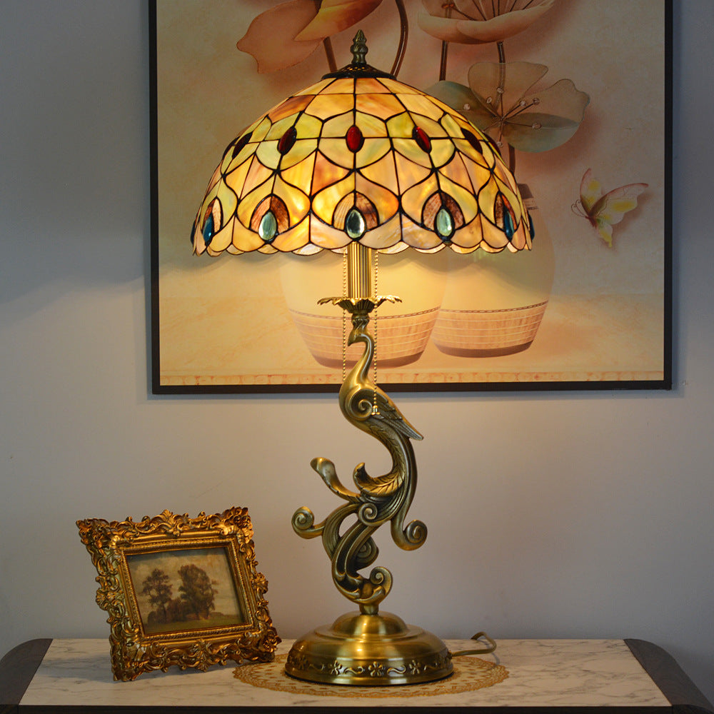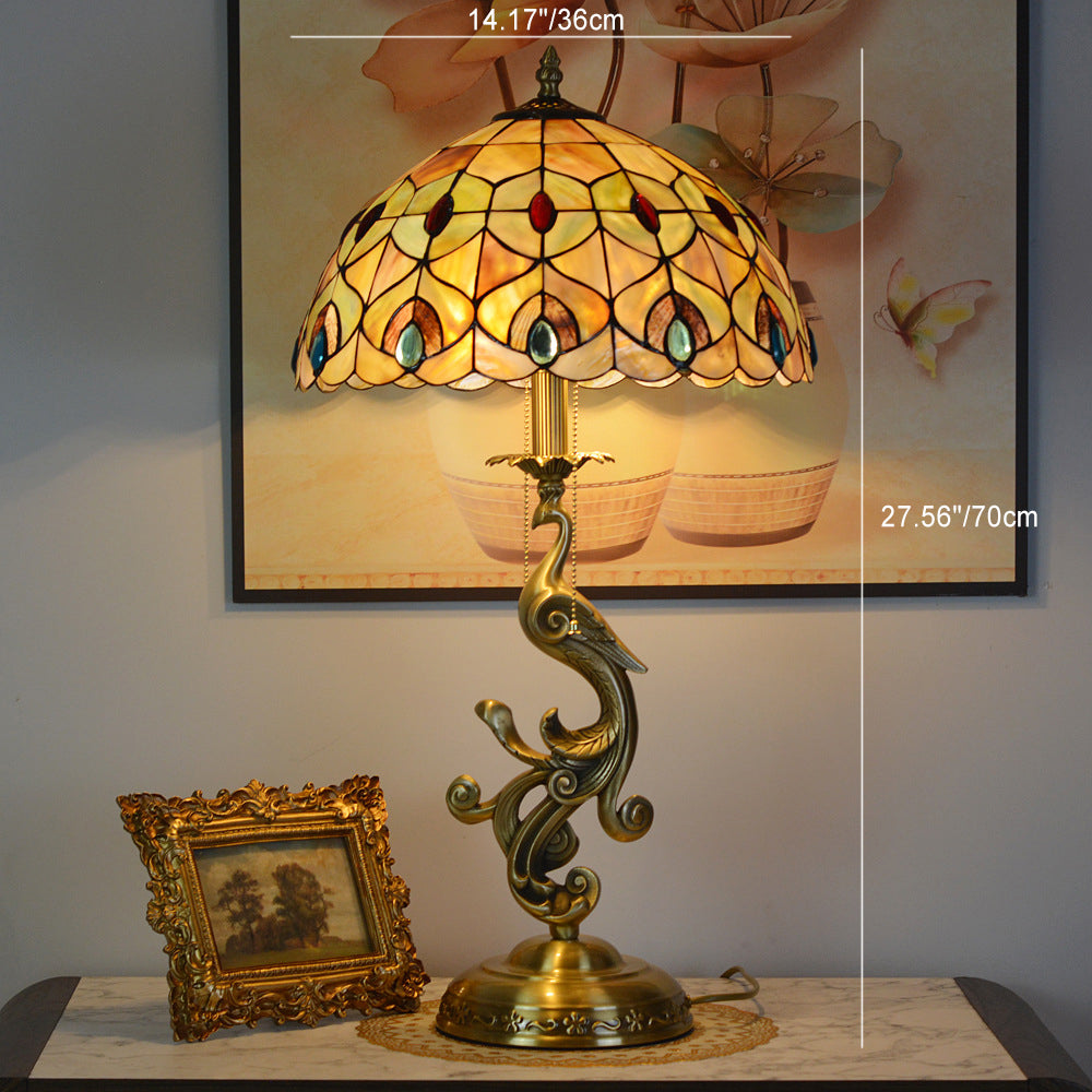 Traditional Tiffany Peacock Dome Copper Glass 1-Light Table Lamp For Bedroom