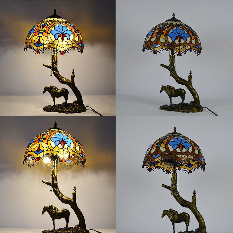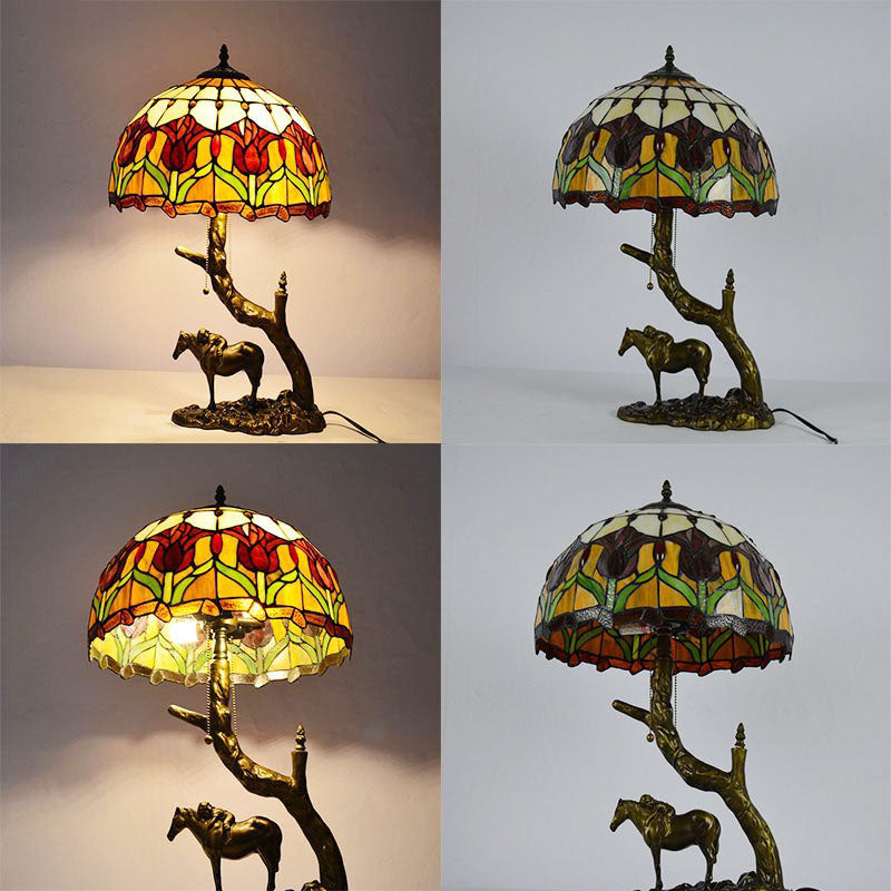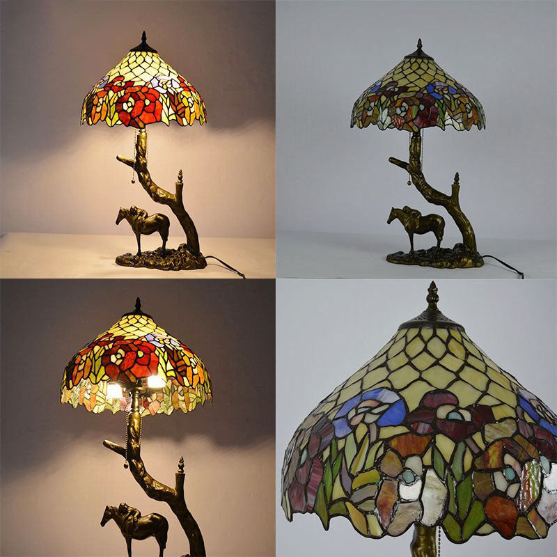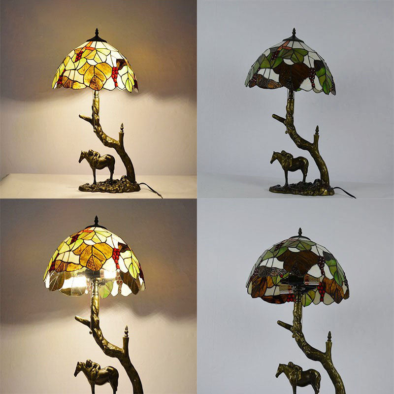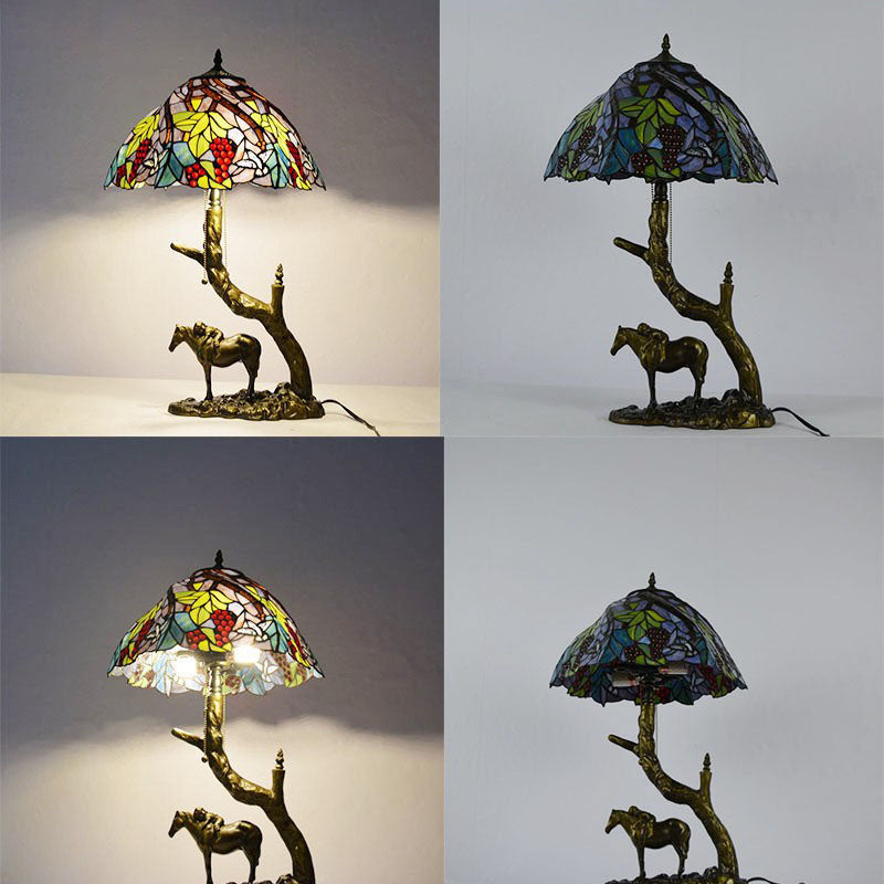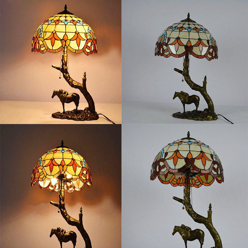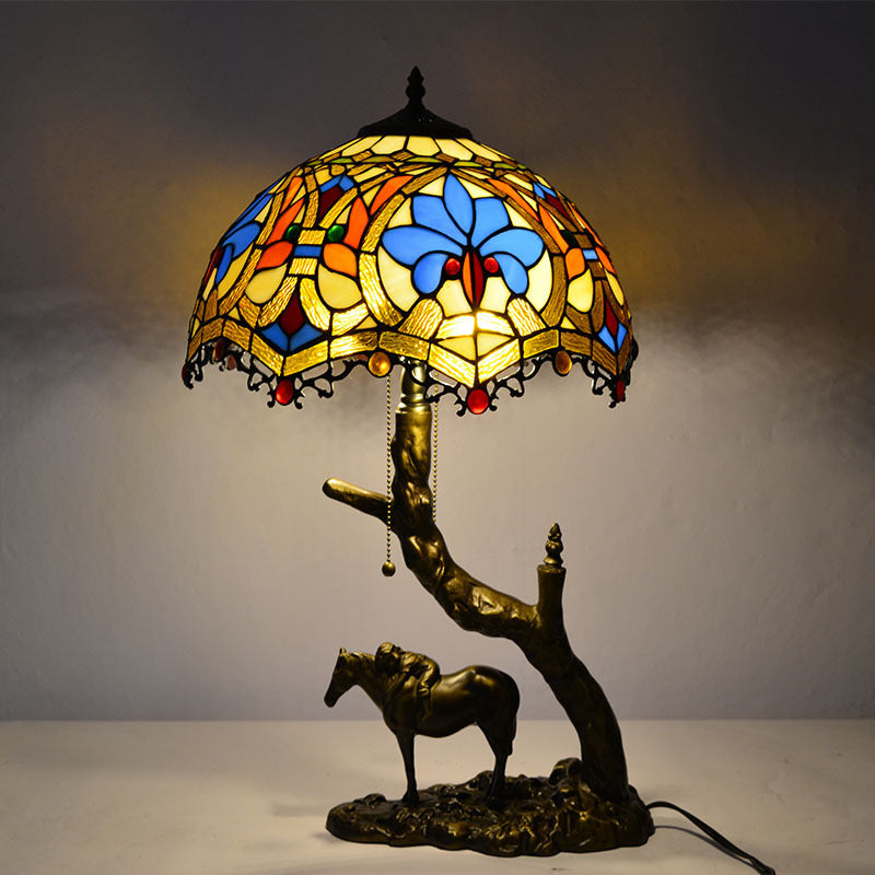 Traditional Tiffany Resin Glass Dome Conic Hemispheric Branch Horse Base 2-Light Table Lamp For Study