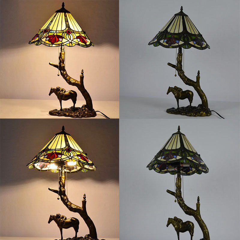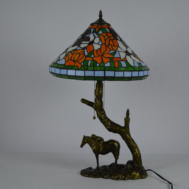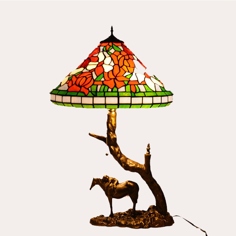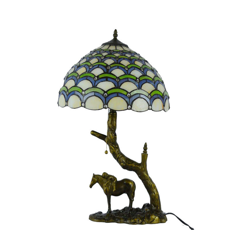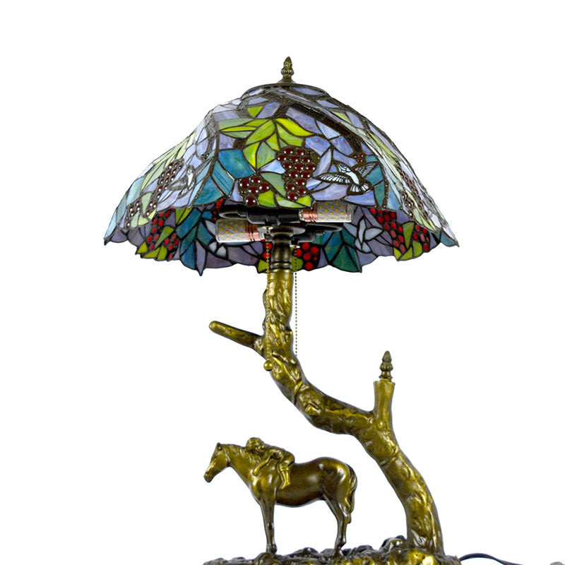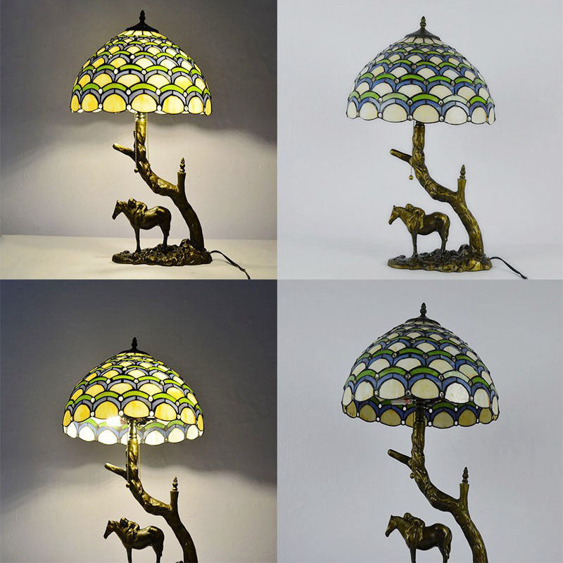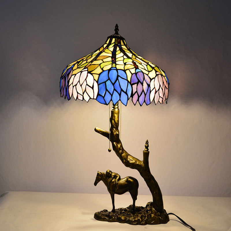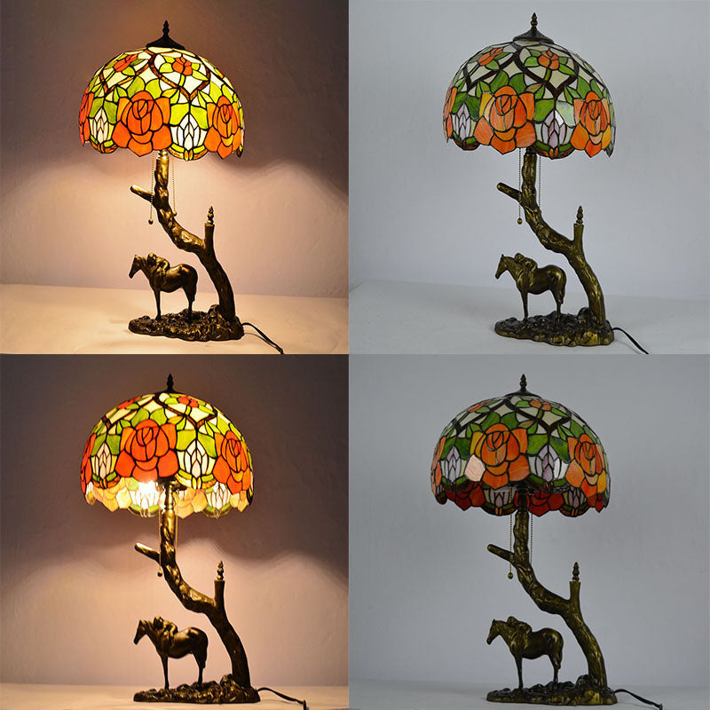 Traditional Tiffany Resin Glass Dome Conic Hemispheric Branch Horse Base 2-Light Table Lamp For Study