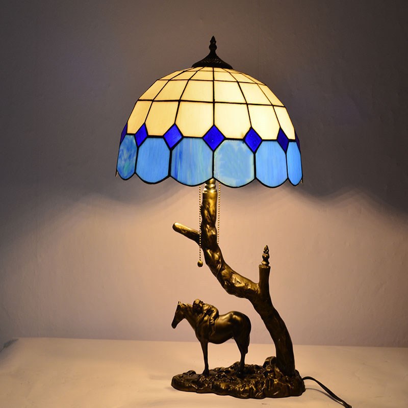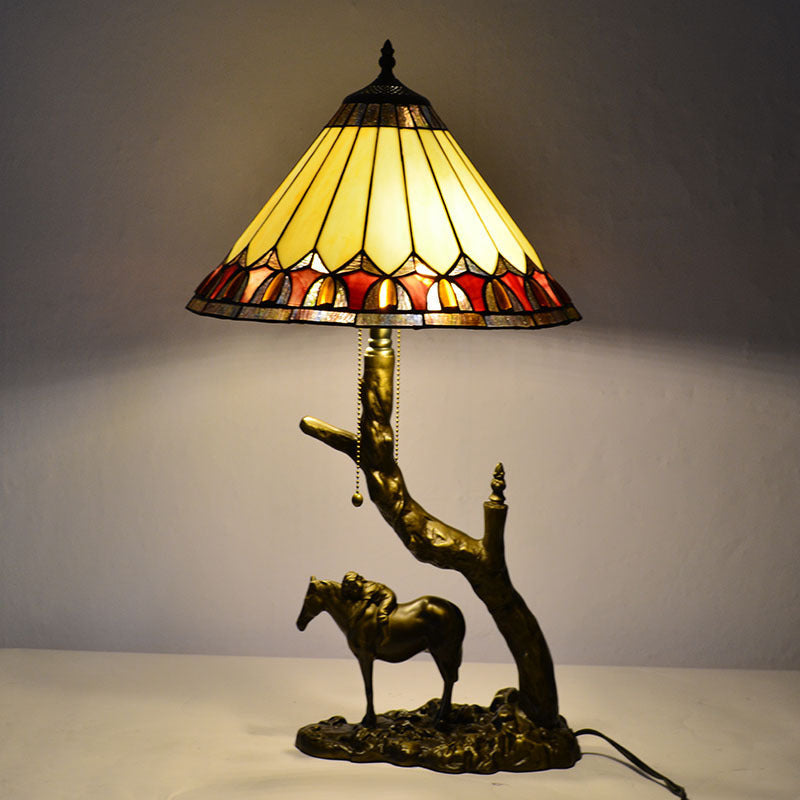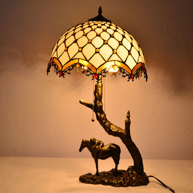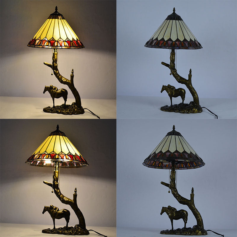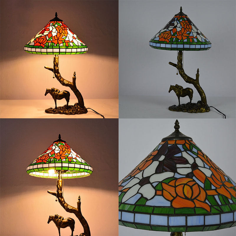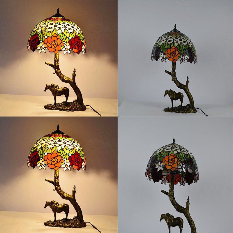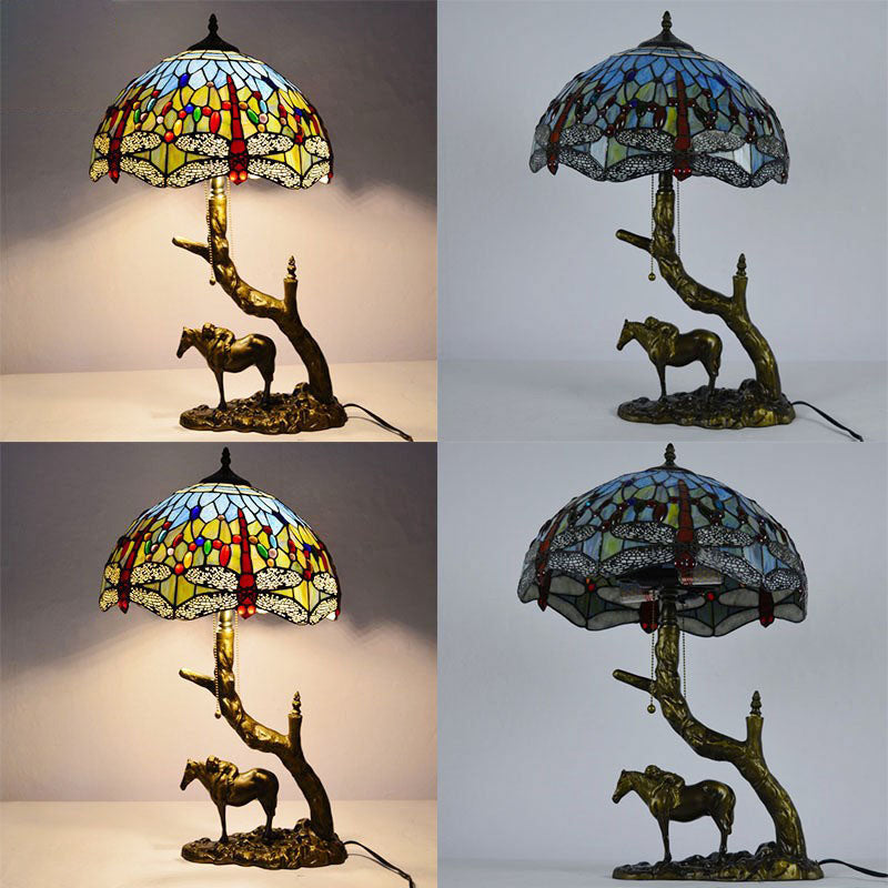 Traditional Tiffany Resin Glass Dome Conic Hemispheric Branch Horse Base 2-Light Table Lamp For Study