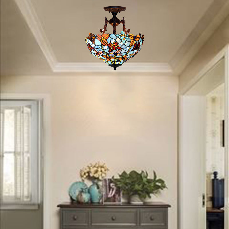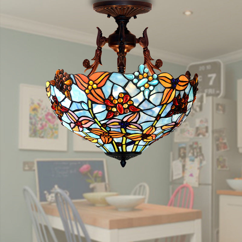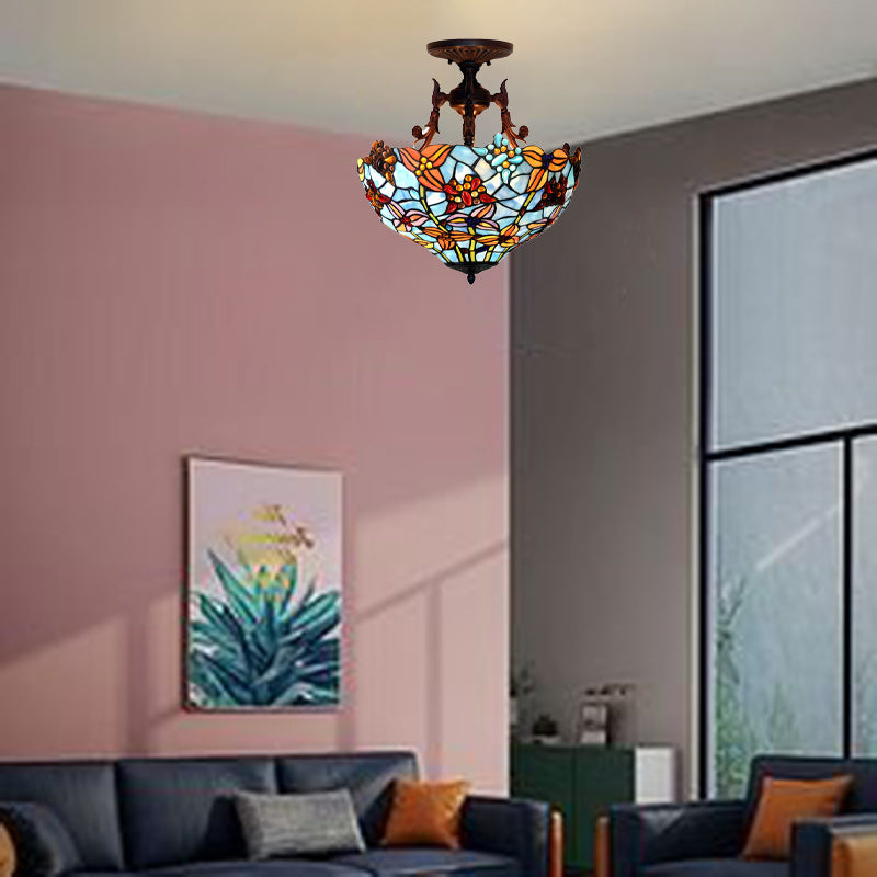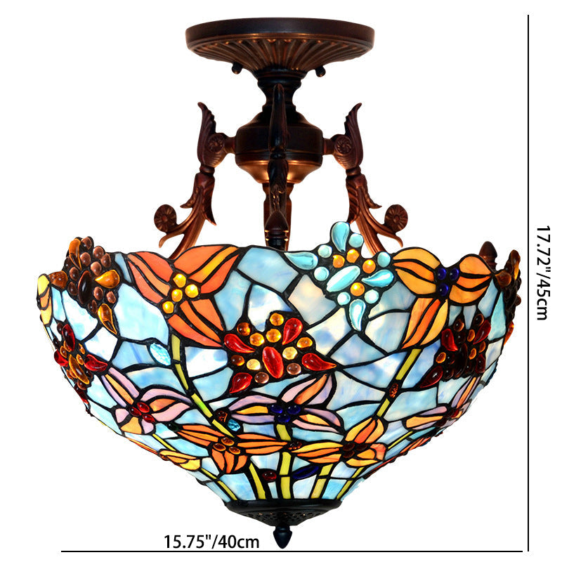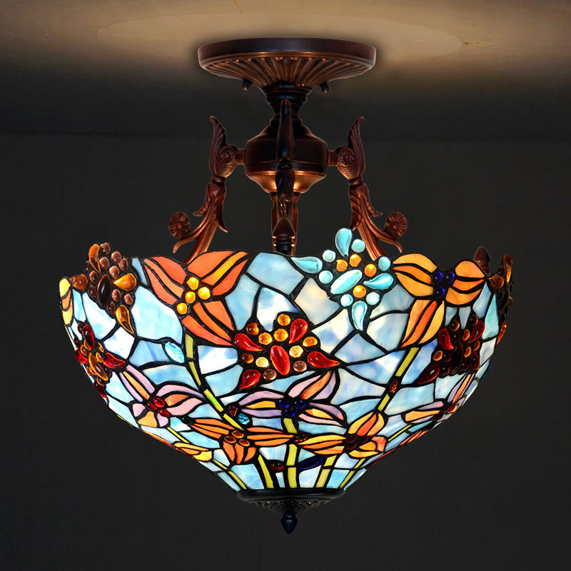 Traditional Tiffany Round Iron Stained Glass 3-Light Semi-Flush Mount Ceiling Light For Bedroom