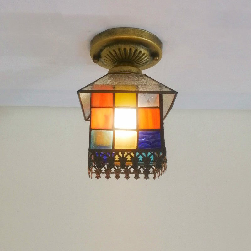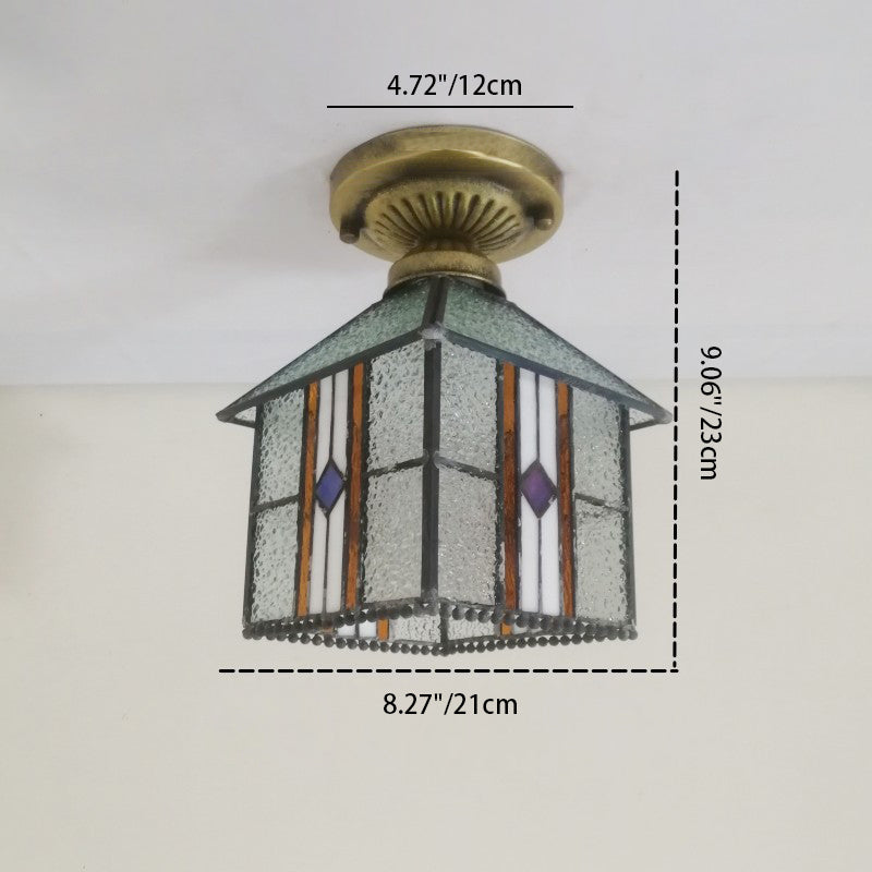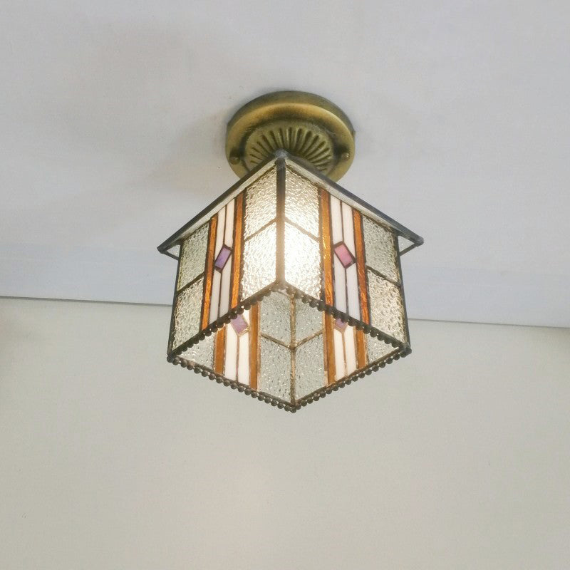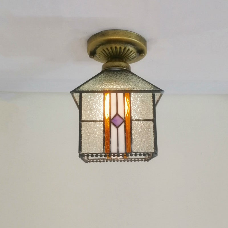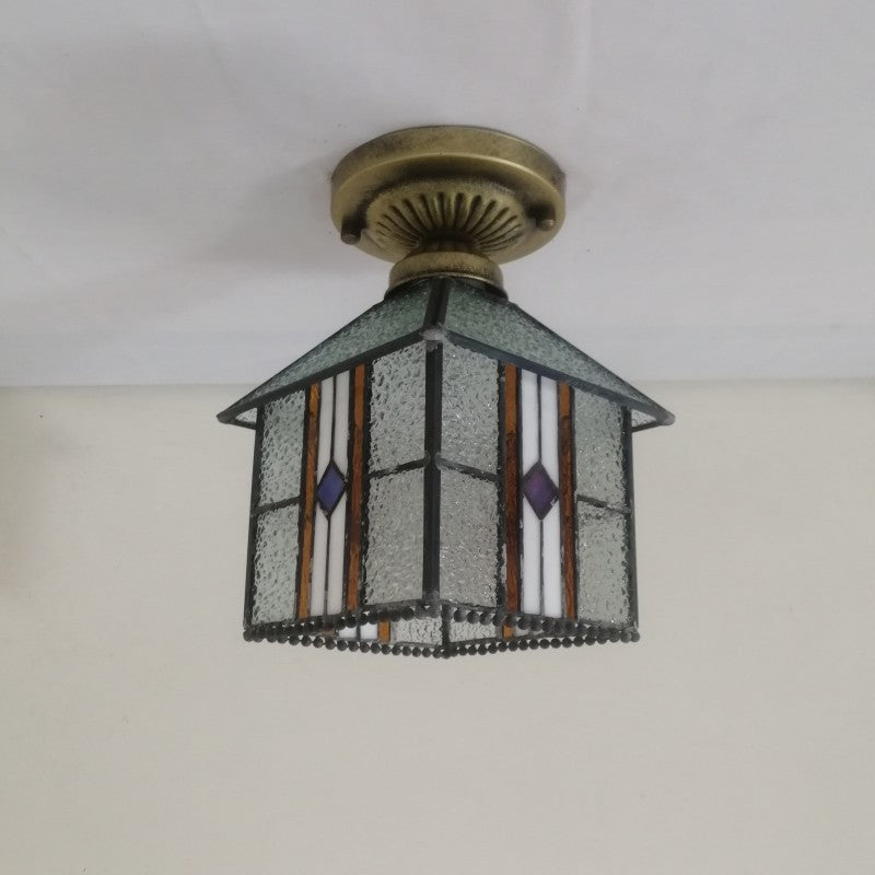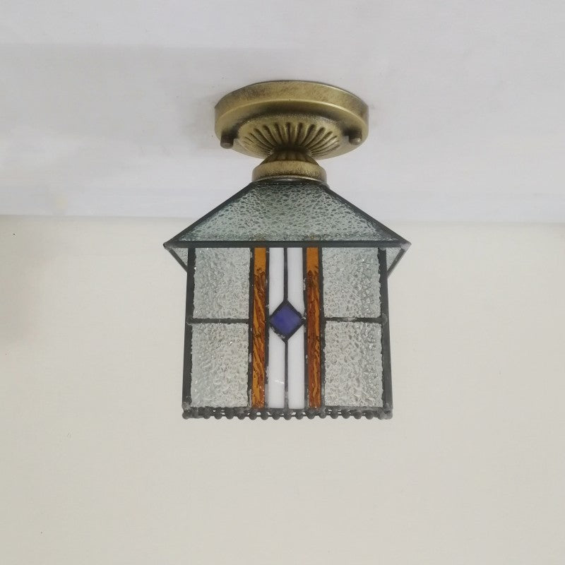 Traditional Tiffany Water Rippled Stained Glass Hardware Square 1-Light Semi-Flush Mount Ceiling Light For Hallway