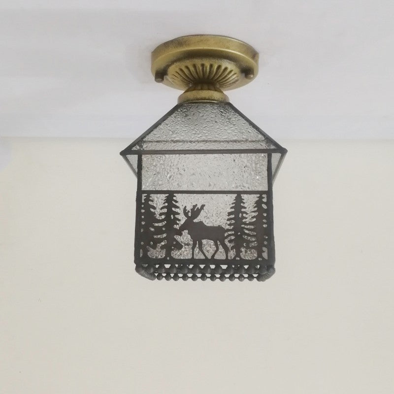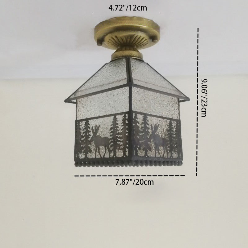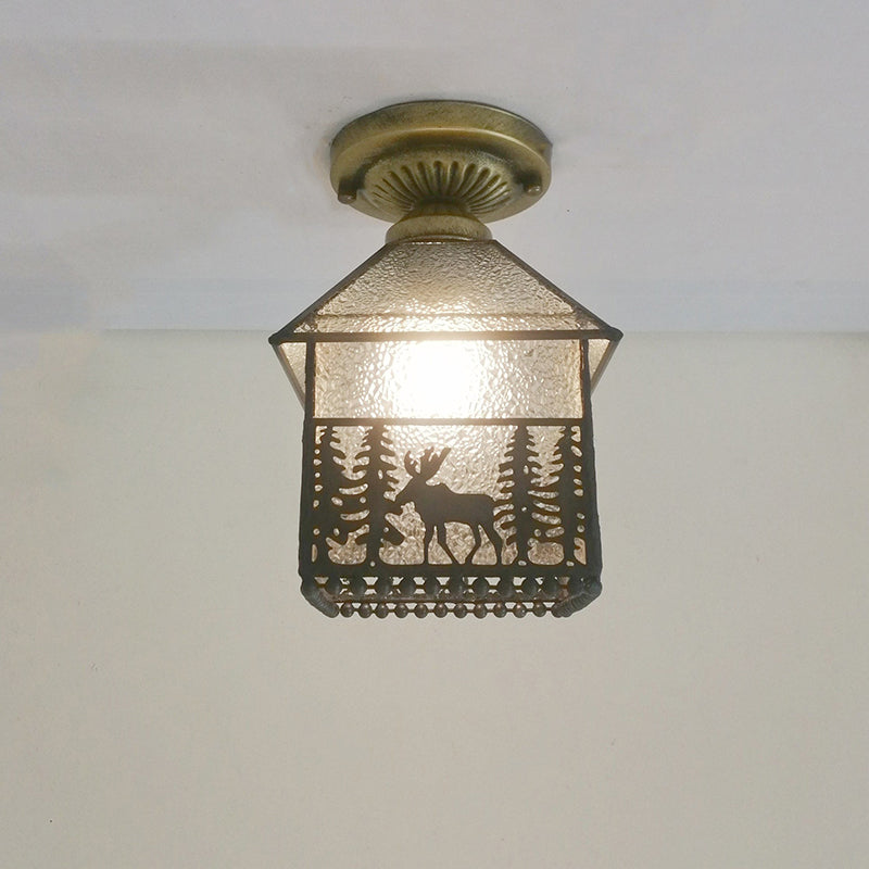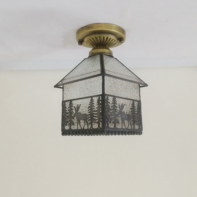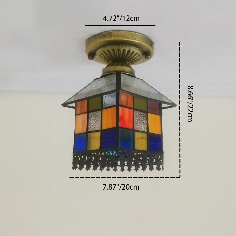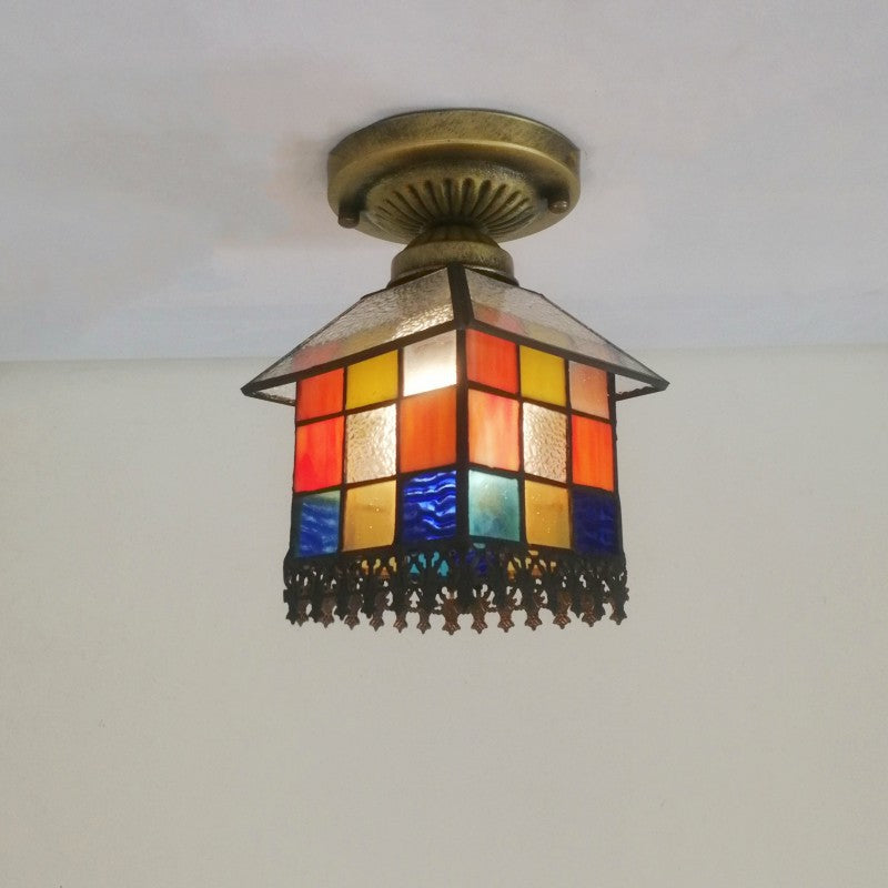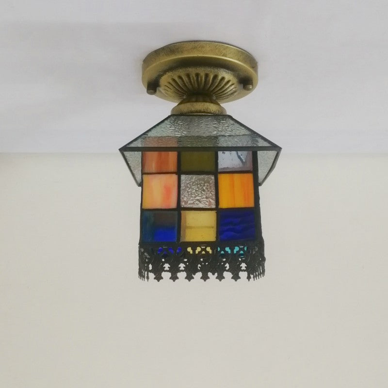 Traditional Tiffany Water Rippled Stained Glass Hardware Square 1-Light Semi-Flush Mount Ceiling Light For Hallway