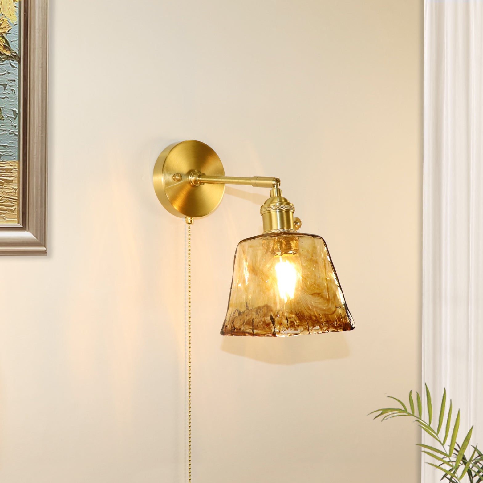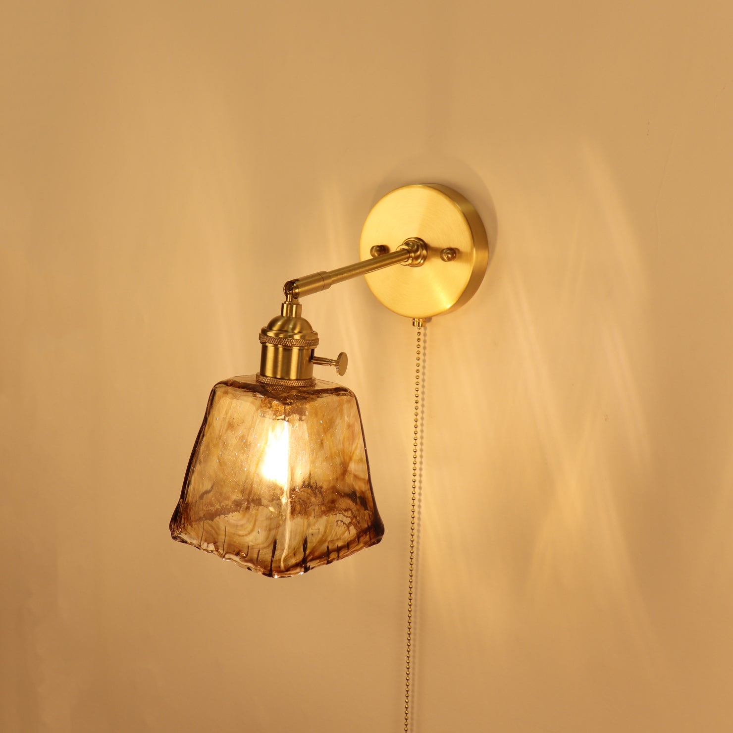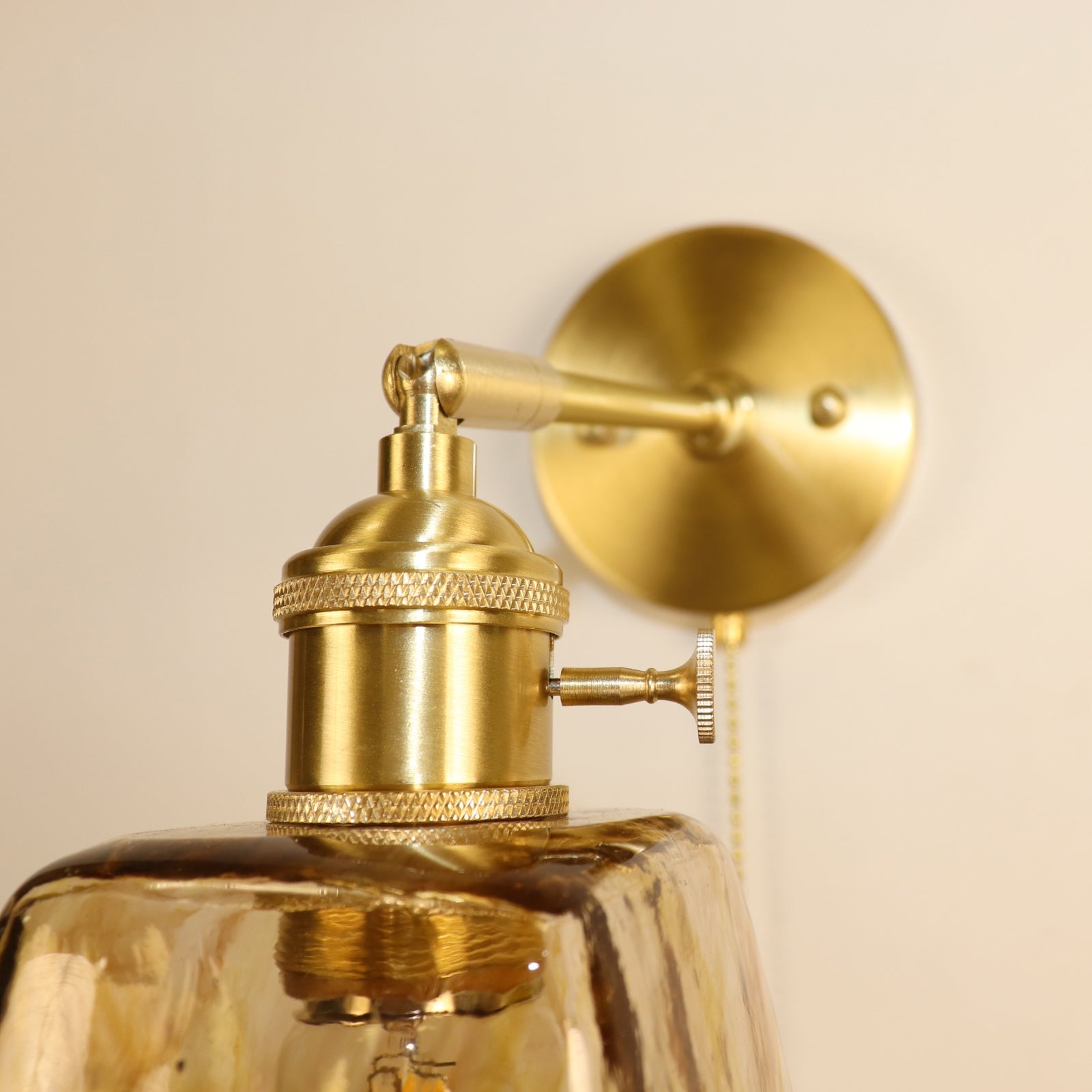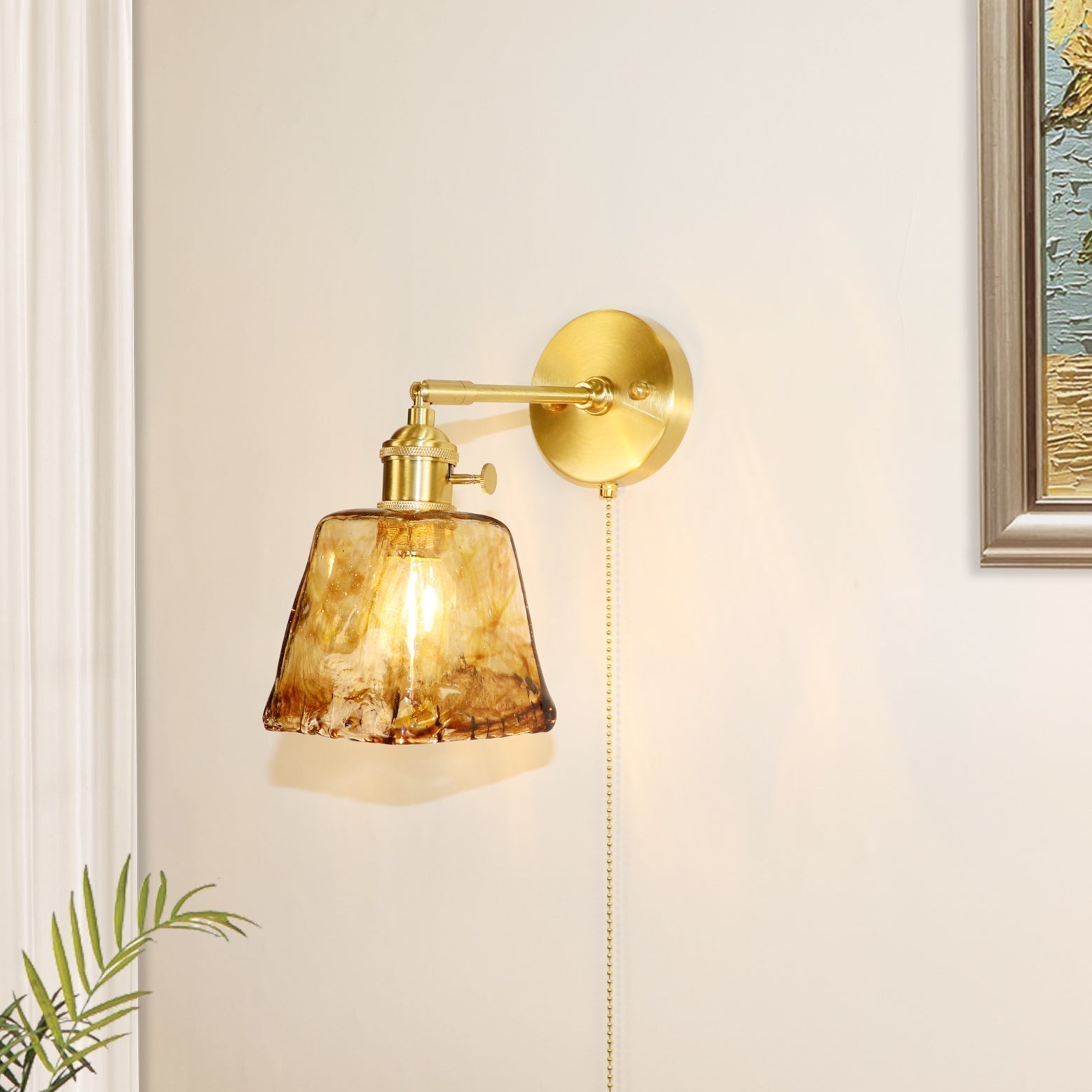 Traditional Vintage Brass Amber Square Glass Shade 1-Light Wall Sconce Lamp For Living Room