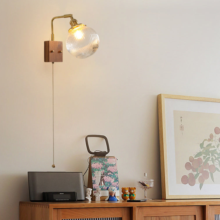 Elevate your space with this 1-light wall sconce lamp, featuring a ribbed globe glass shade, pure brass and walnut wood construction, and an adjustable angle. The Japanese-inspired design blends light luxury, vintage, and Nordic aesthetics—perfect for bedrooms or living rooms seeking warm, artistic lighting.