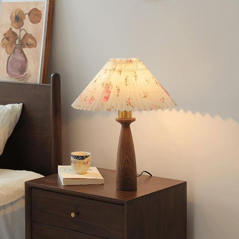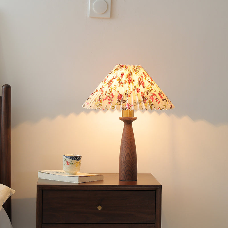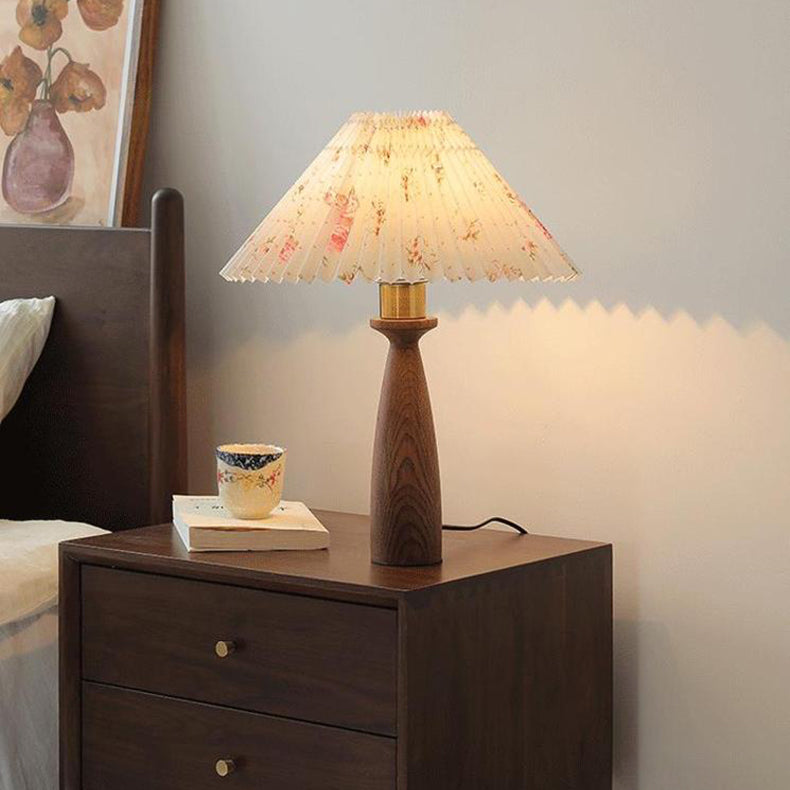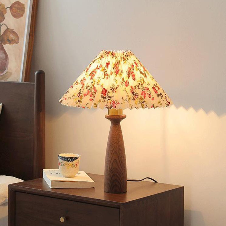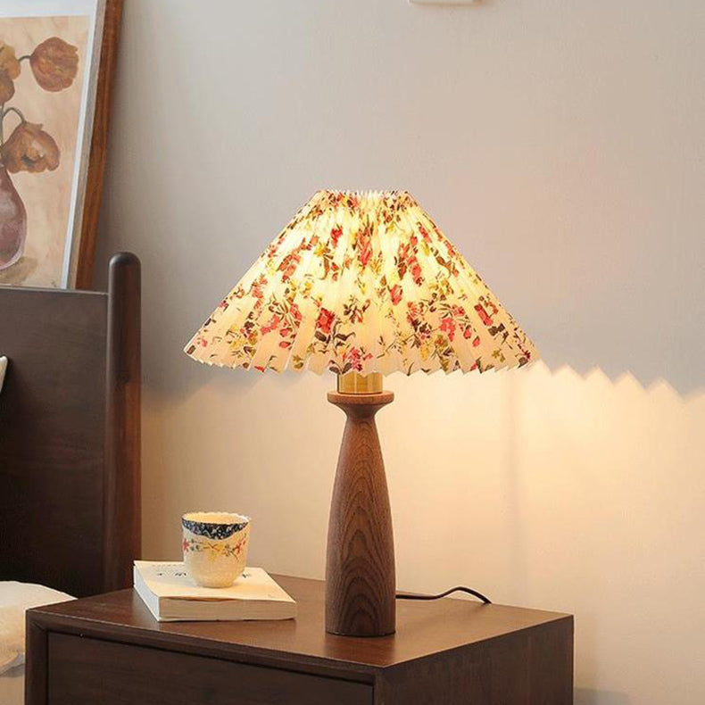 Traditional Vintage Conical Floral Wood Fabric 1-Light Table Lamp For Bedroom