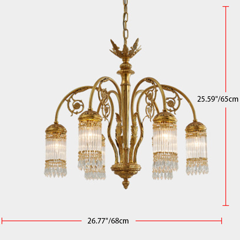 Traditional Vintage Cylinder Branch Feather Copper Glass Crystal 6-Light Chandelier For Living Room