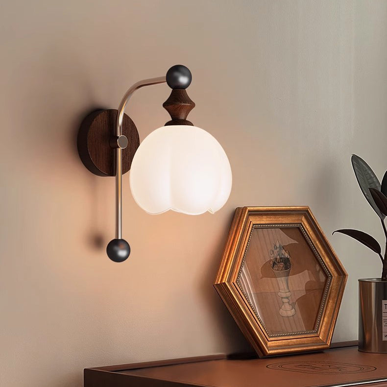 Traditional Vintage Floral Round Cone Wood Iron Glass LED Wall Sconce Lamp For Bedroom
