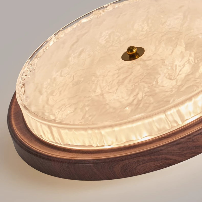This traditional vintage flush mount ceiling light features a water ripple glass shade and sturdy iron frame in a walnut finish. Its LED lighting delivers a soft, eye-friendly glow with even texture—ideal for cozy bedroom ambiance.