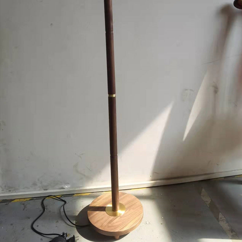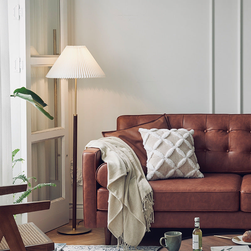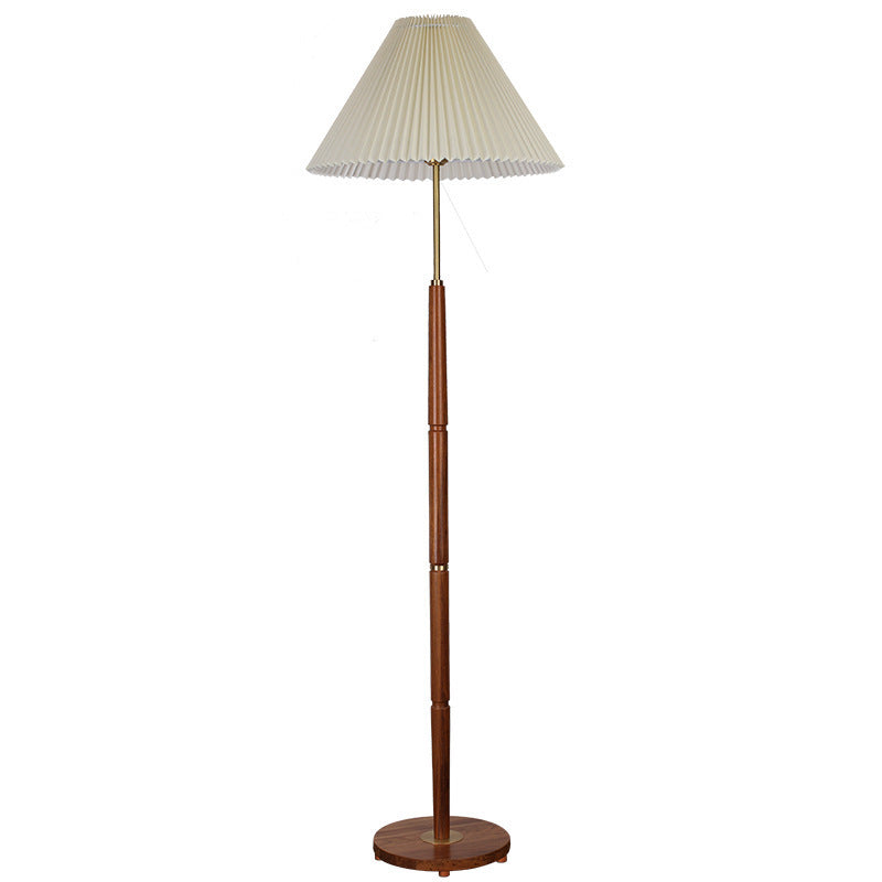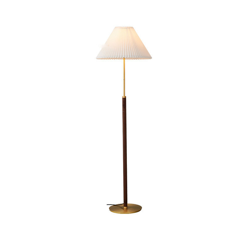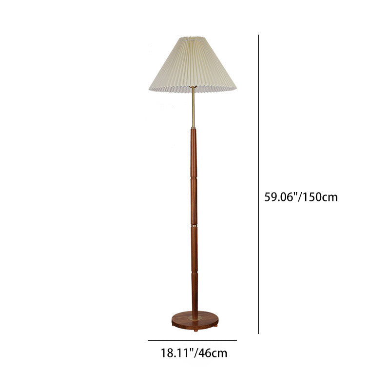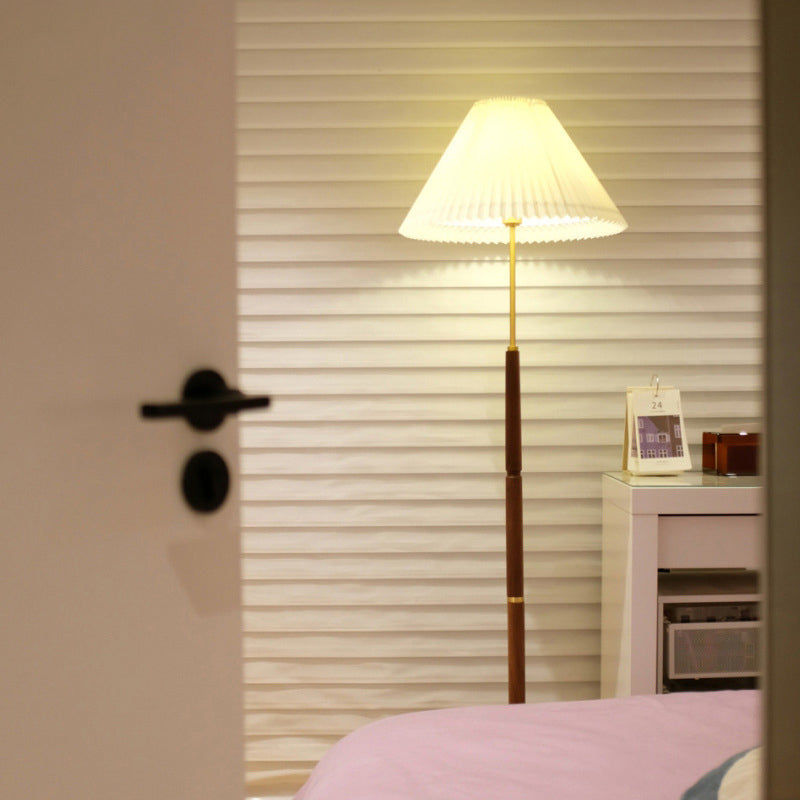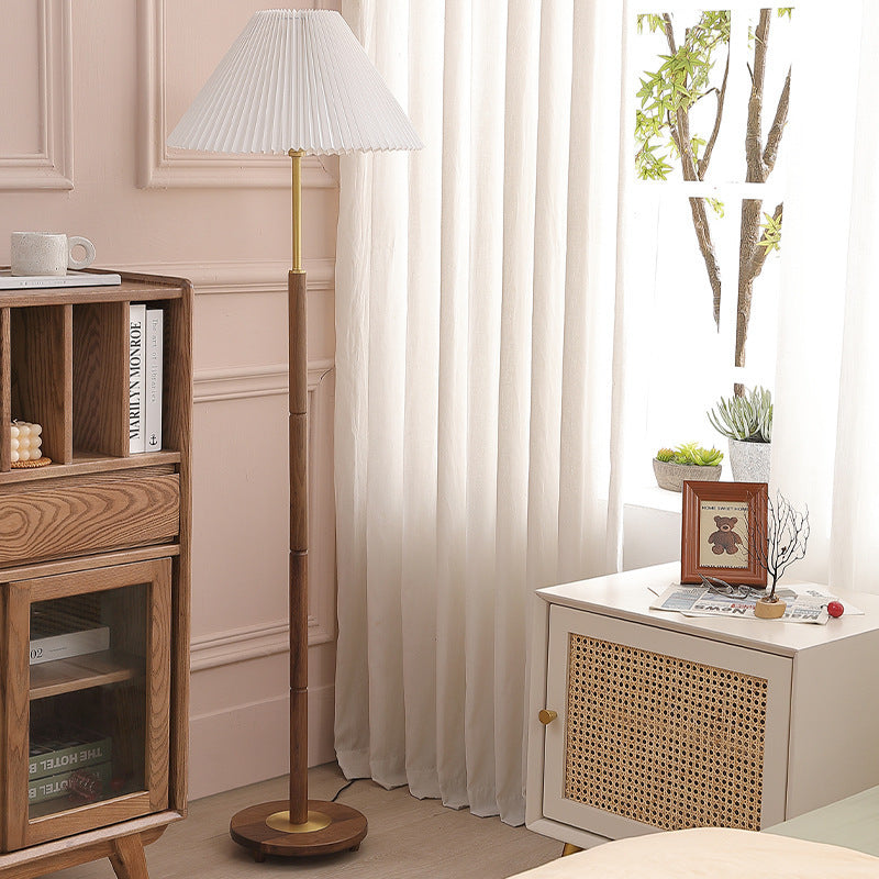 Traditional Vintage Pleated Fabric Shade Brass Walnut Splicing Base 1-Light Standing Floor Lamp For Bedroom