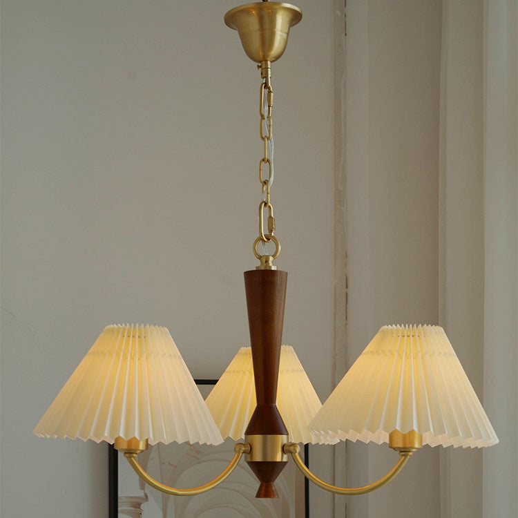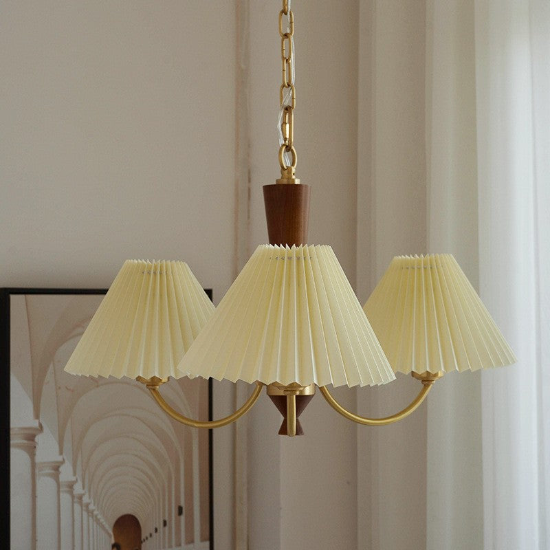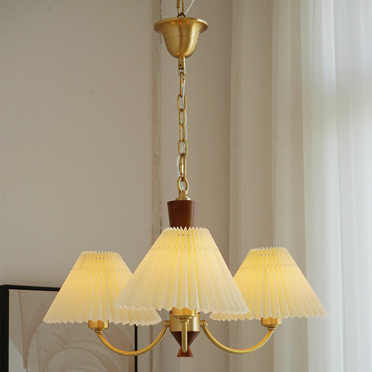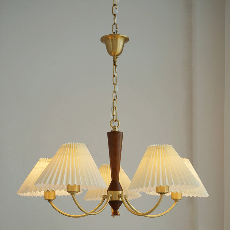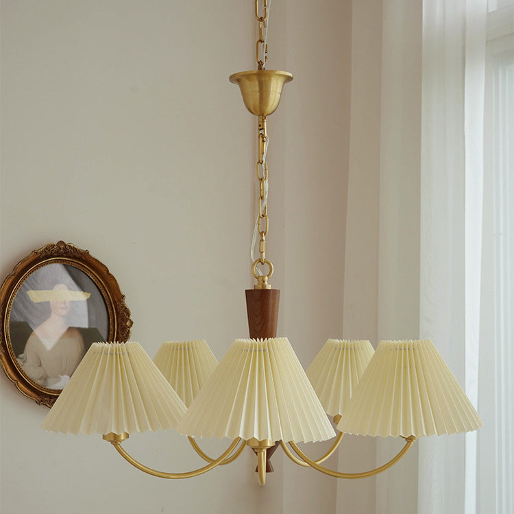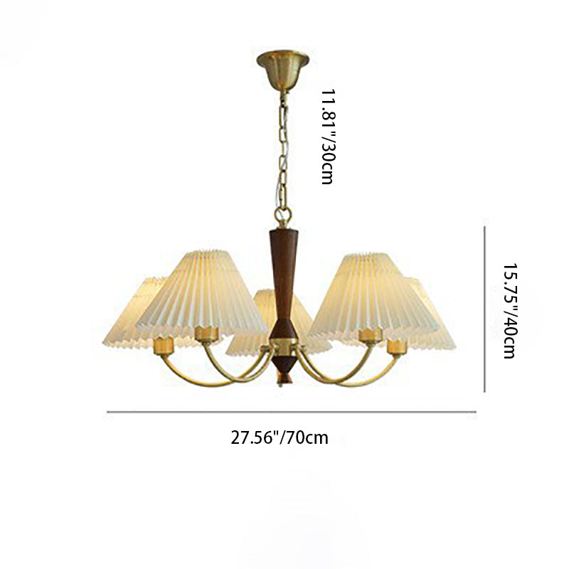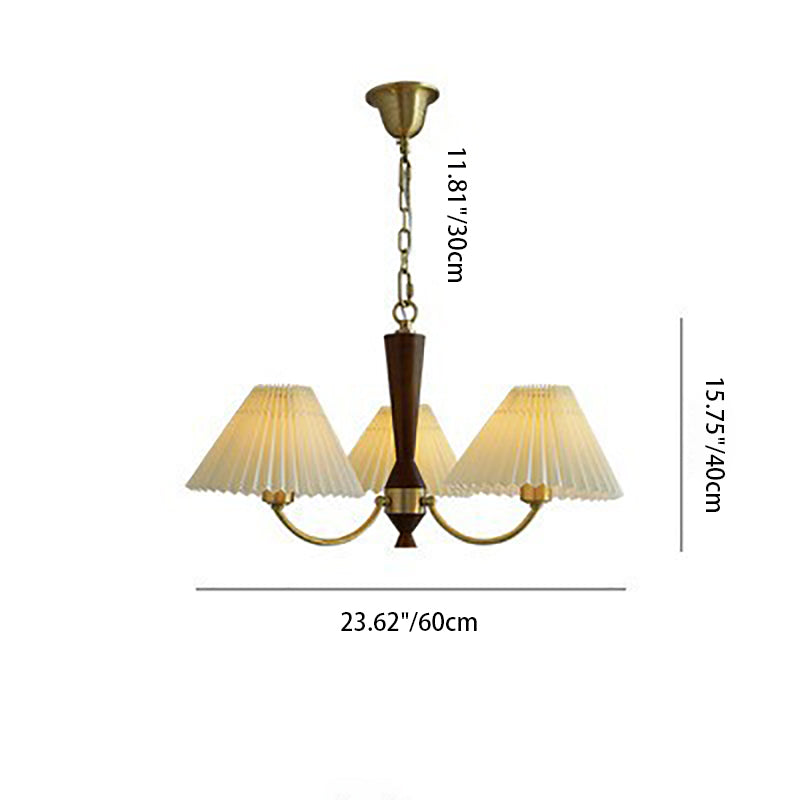 Traditional Vintage Pleated Fabric Shade Wood Brass Frame 3/5-Light Chandelier For Living Room