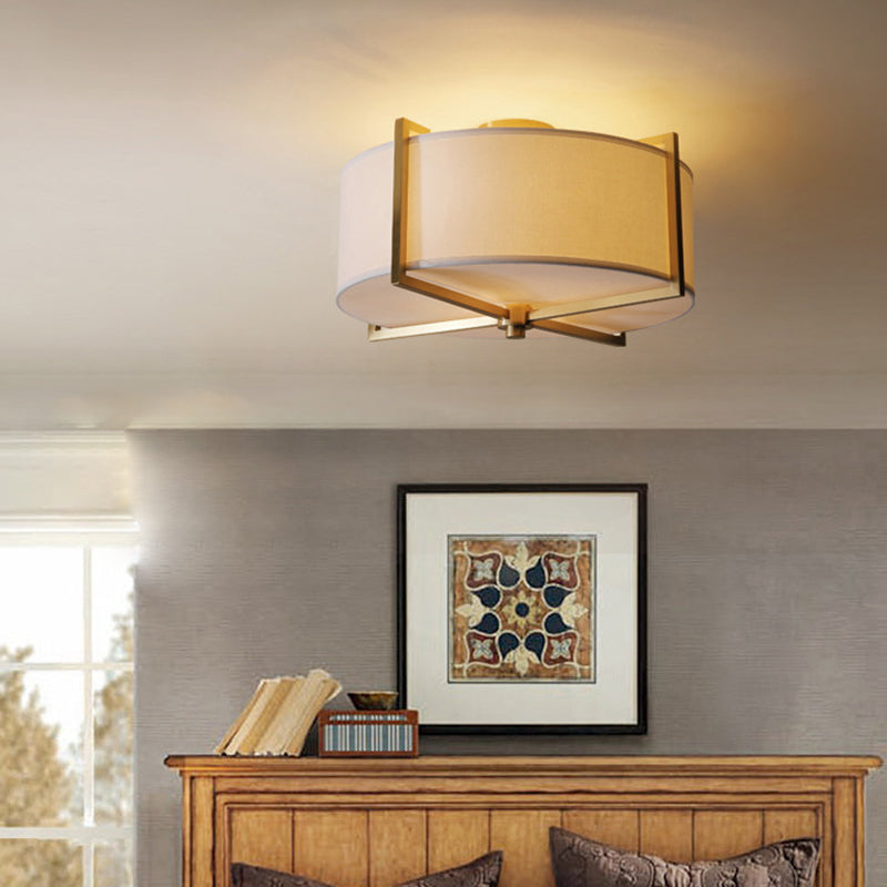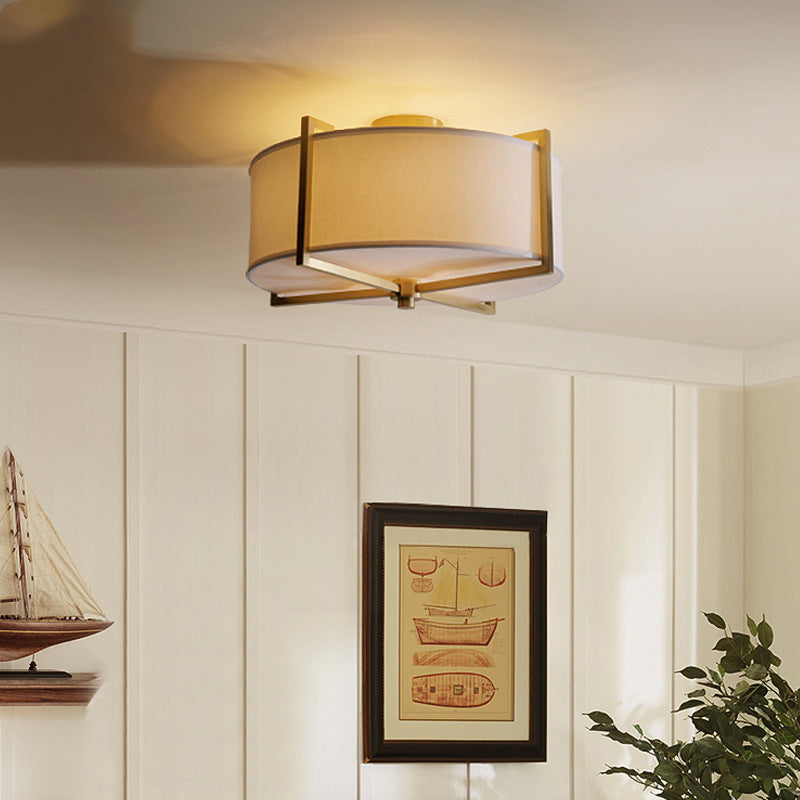 Traditional Vintage Round Cross Shape Fabric Copper 5-Light Semi-Flush Mount Ceiling Light For Living Room