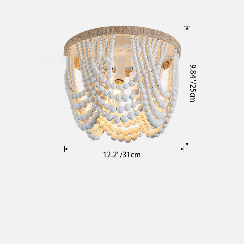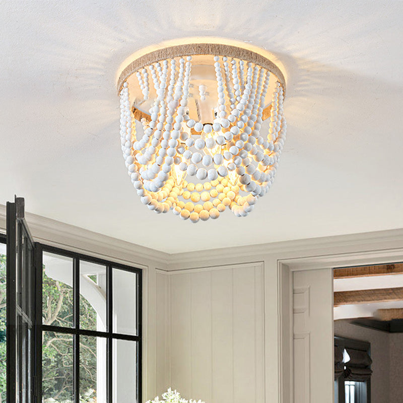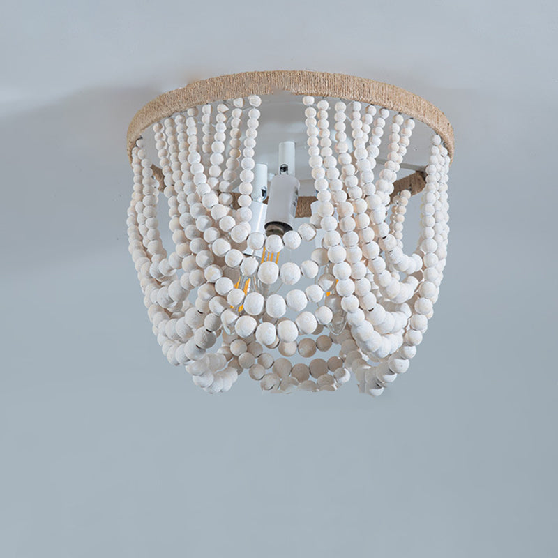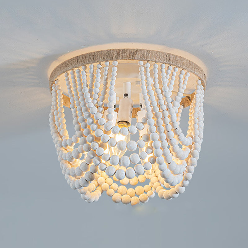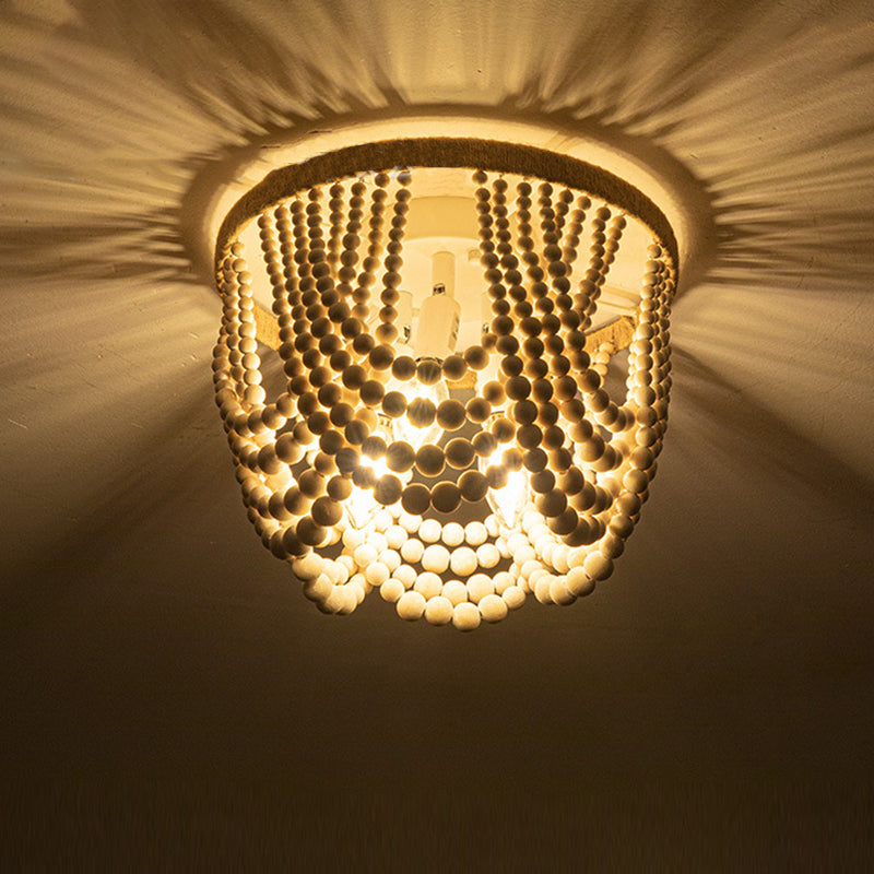 Traditional Vintage Round Curtain Wooden Beads Sisal Hardware 3-Light Flush Mount Ceiling Light For Bedroom