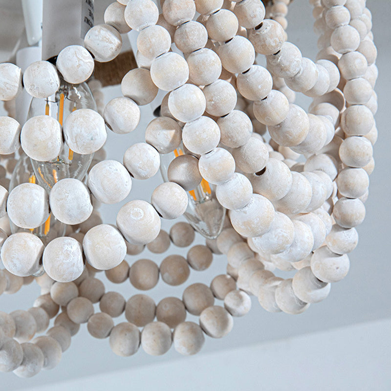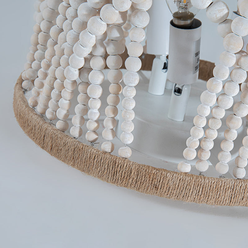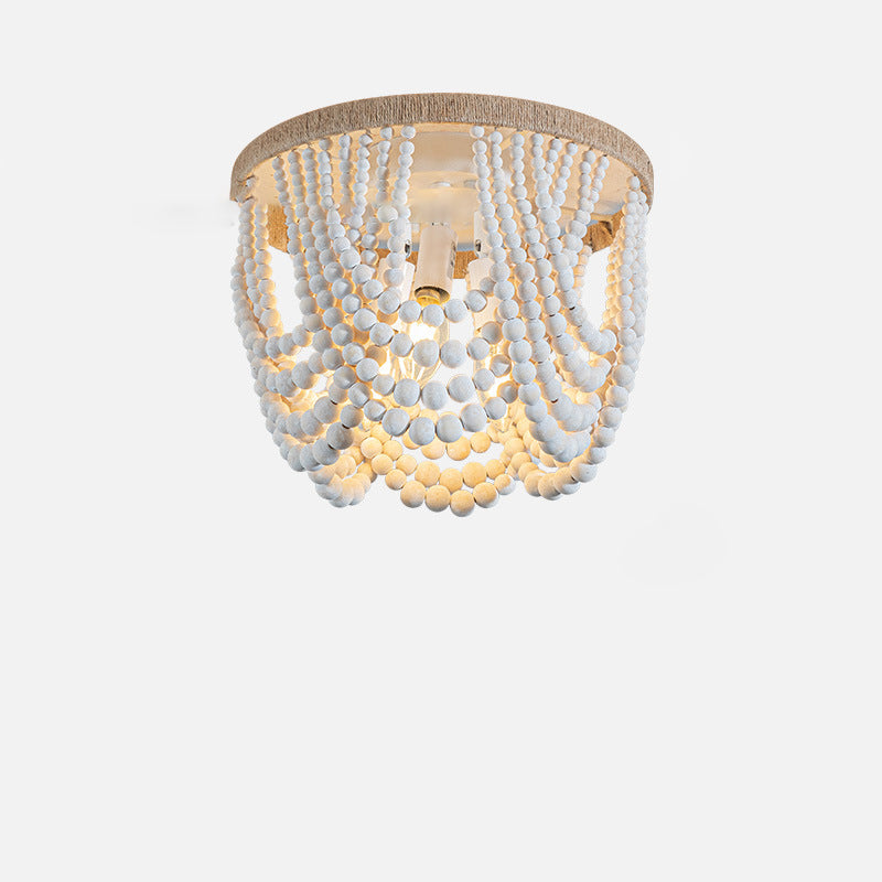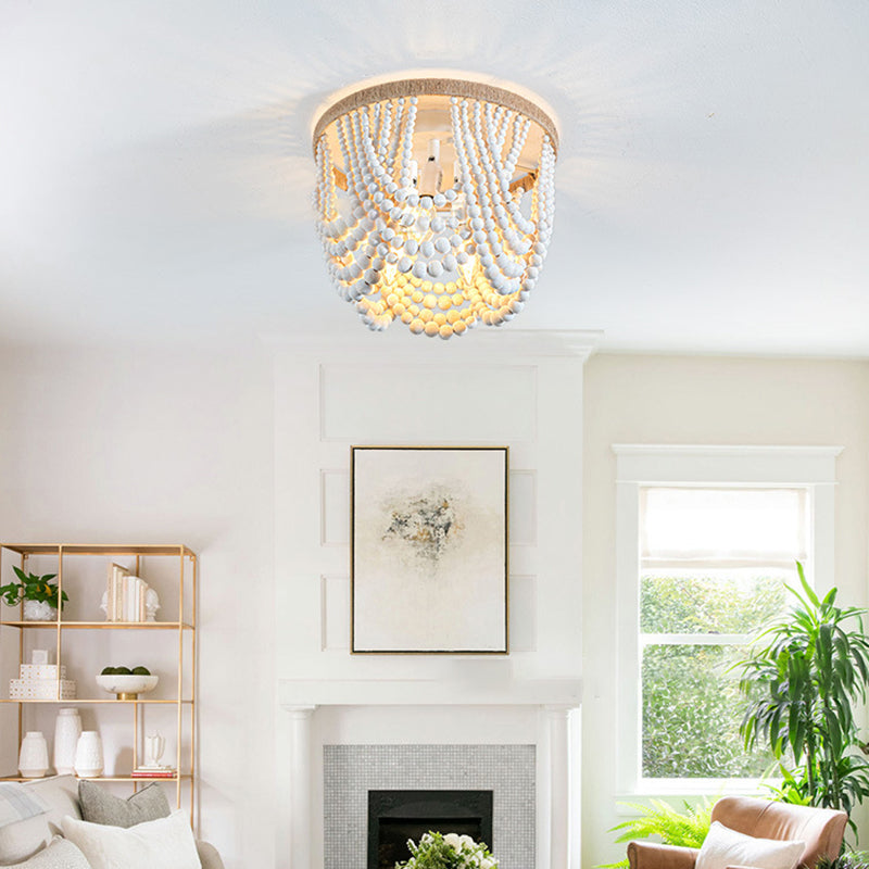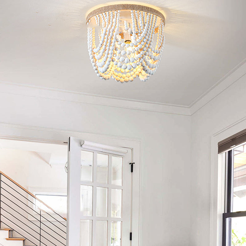 Traditional Vintage Round Curtain Wooden Beads Sisal Hardware 3-Light Flush Mount Ceiling Light For Bedroom