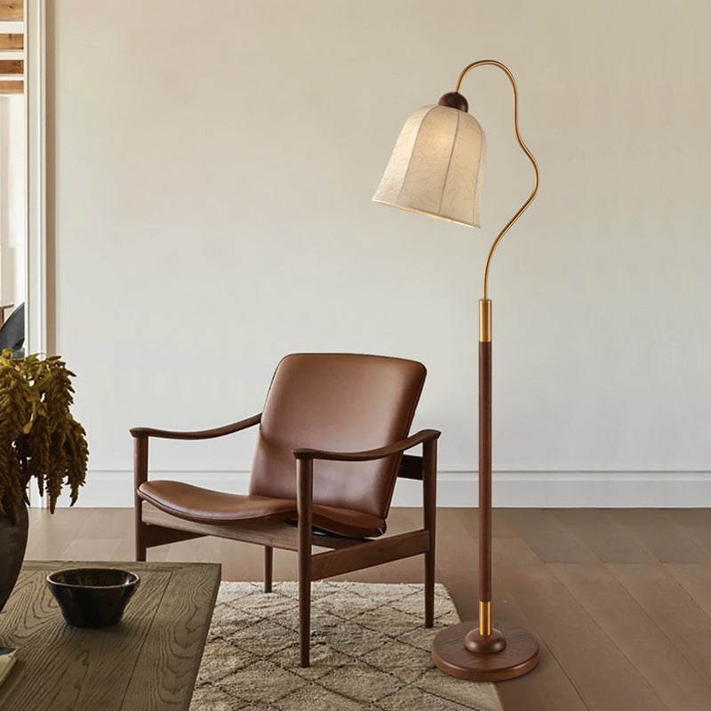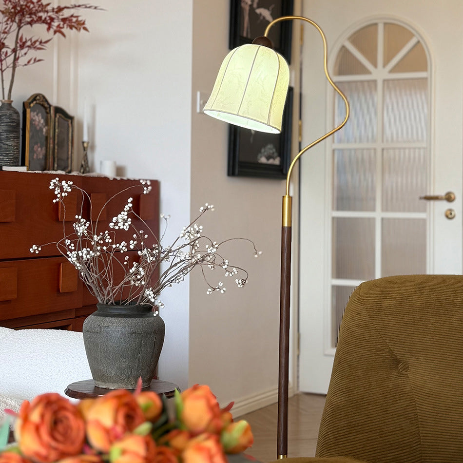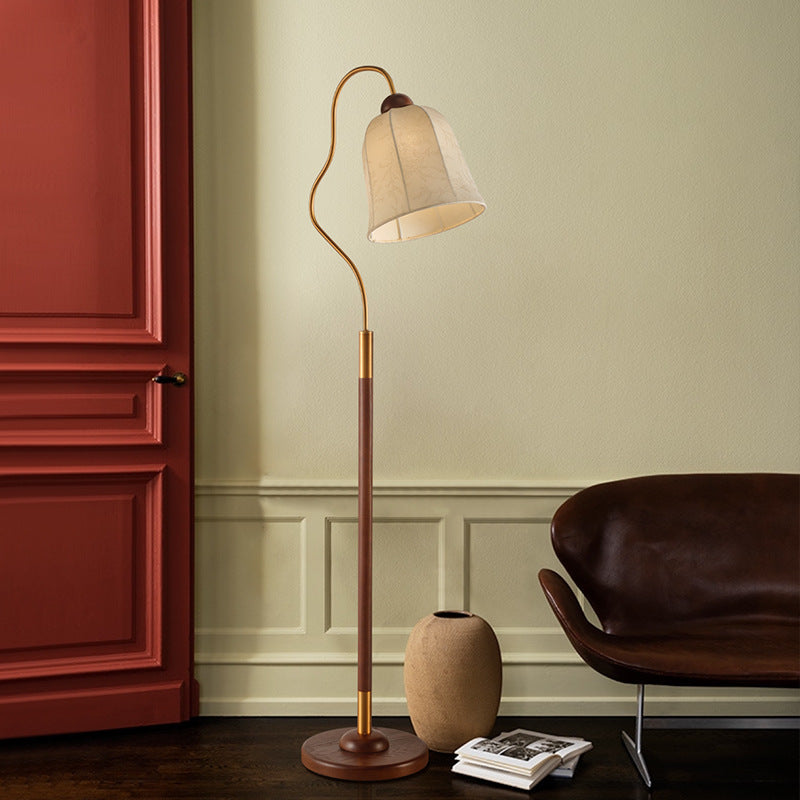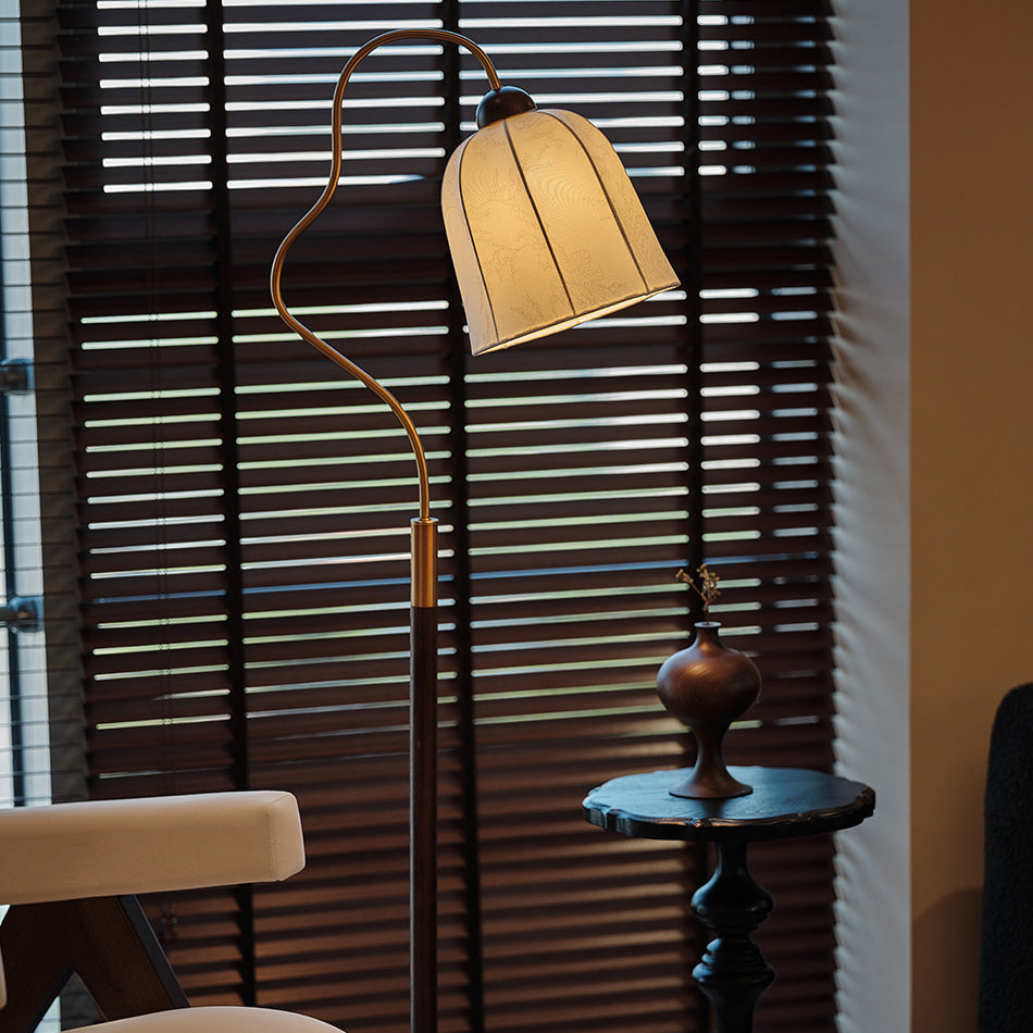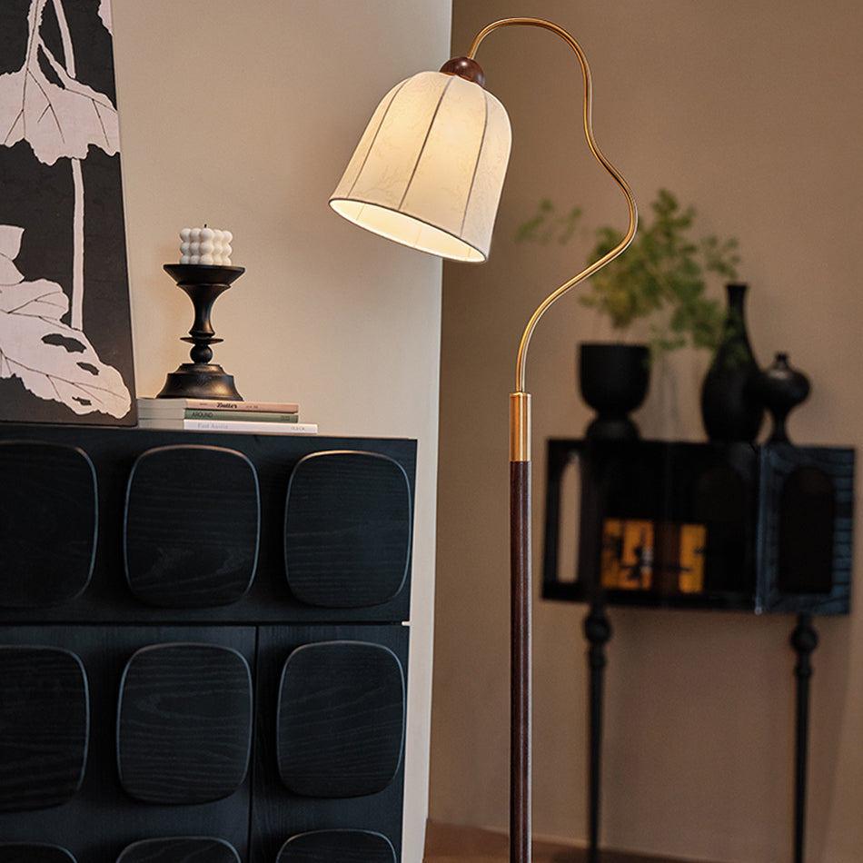 Traditional Vintage Round Curved Wood Fabric 1-Light Standing Floor Lamp For Bedroom
