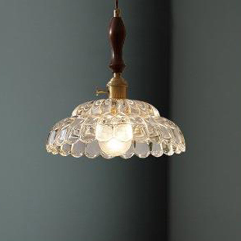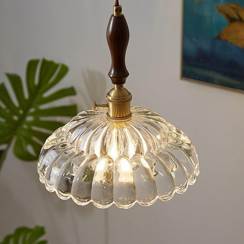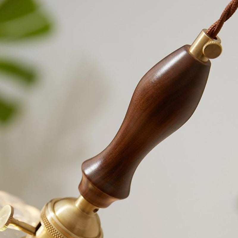 Traditional Vintage Round Floral Glass Shade Wood Brass 1-Light Pendant Light For Living Room
