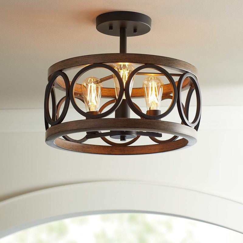 Traditional Vintage Round Iron 3-Light Semi-Flush Mount Ceiling Light For Living Room