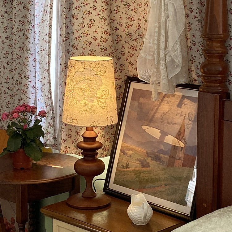 Traditional Vintage Round Solid Wood Base Trapezoidal Floral Fabric Shade 1-Light Table Lamp For Bedroom