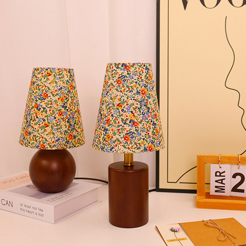 Traditional Vintage Round Table Sphere Cylinder Base Floral Trim Solid Wood Fabric LED Table Lamp For Bedroom