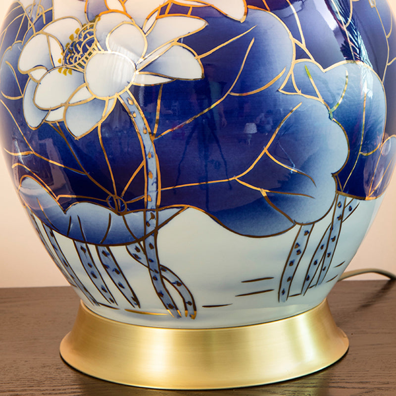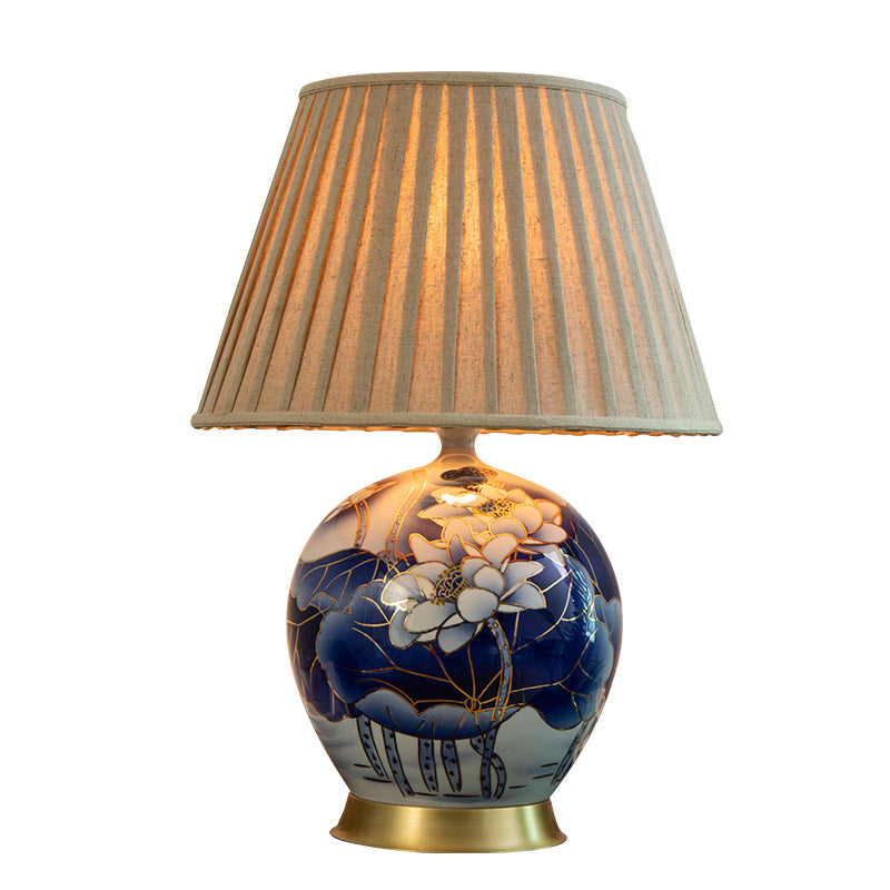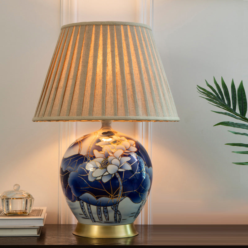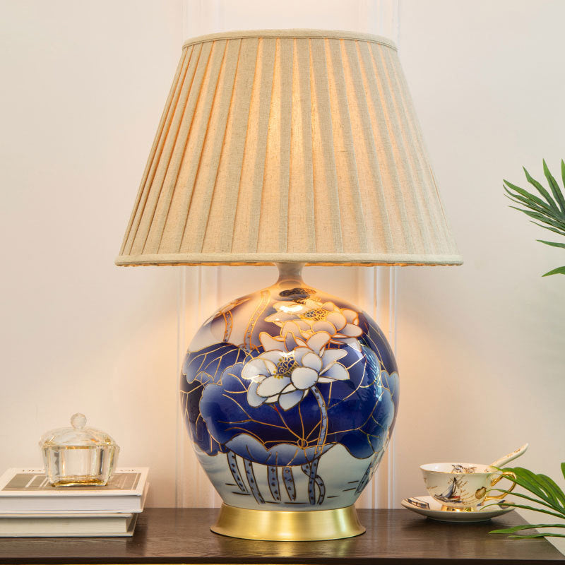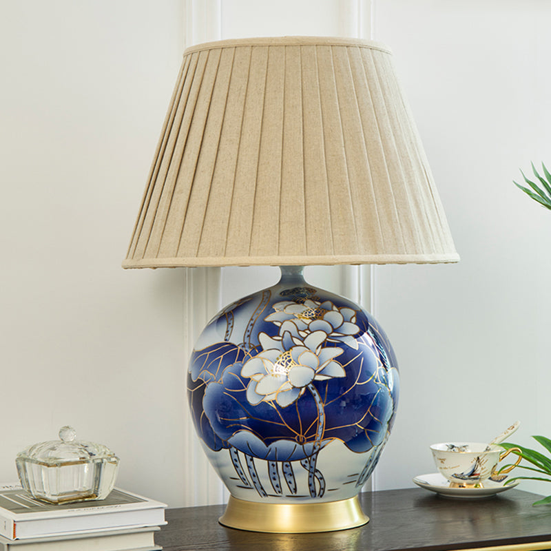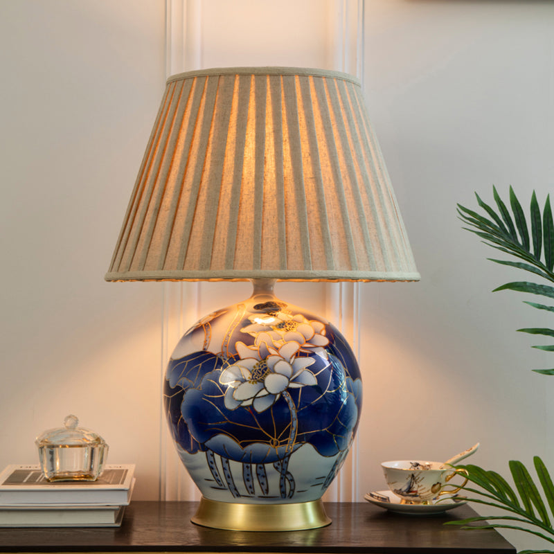 Traditional Vintage Scalloped Round Lotus Flower Fabric Ceramic Metal 1-Light Table Lamp For Living Room