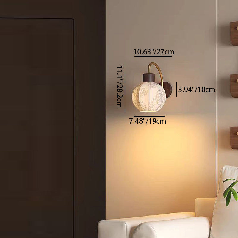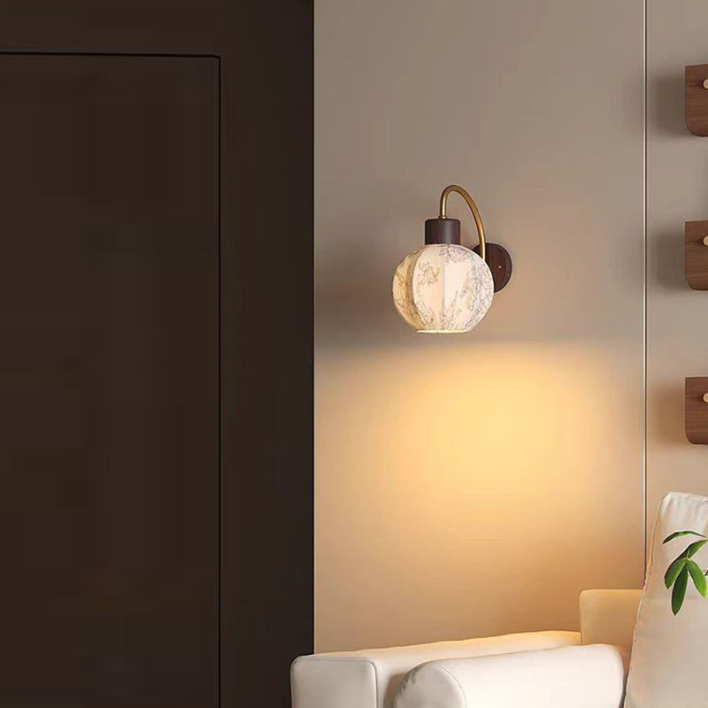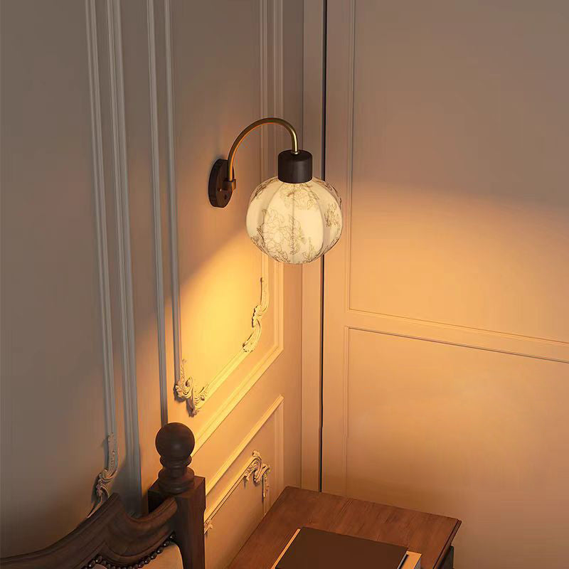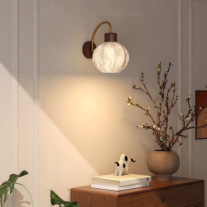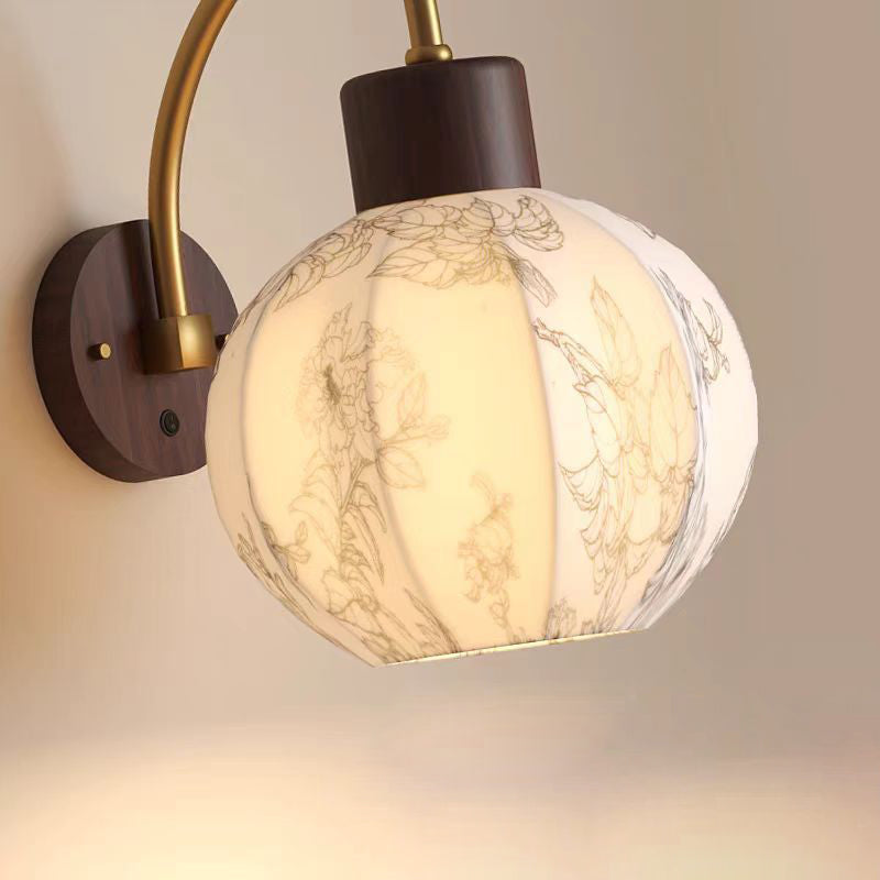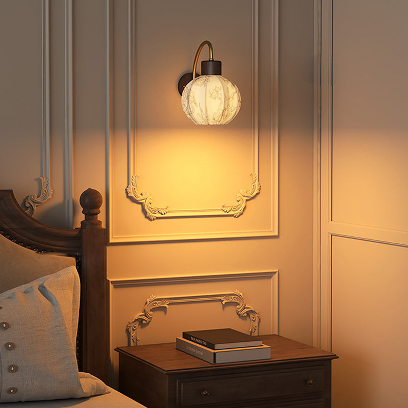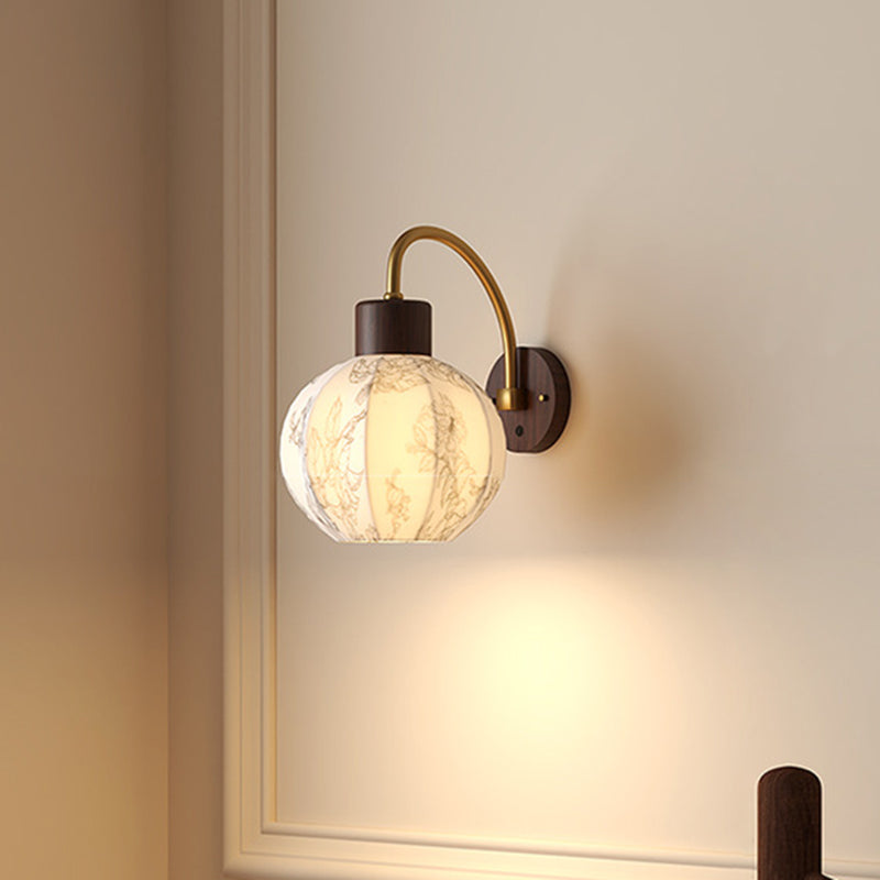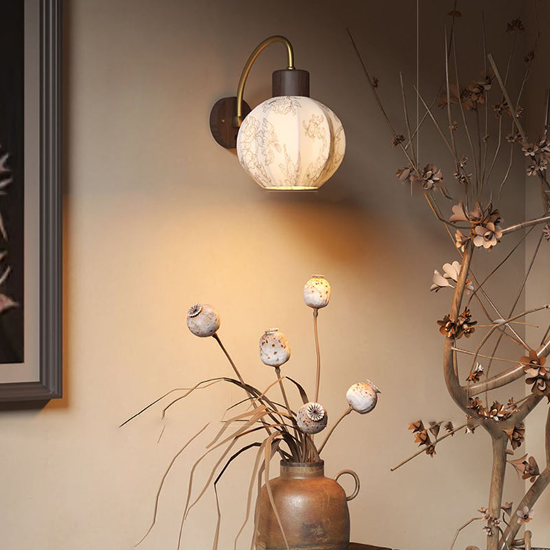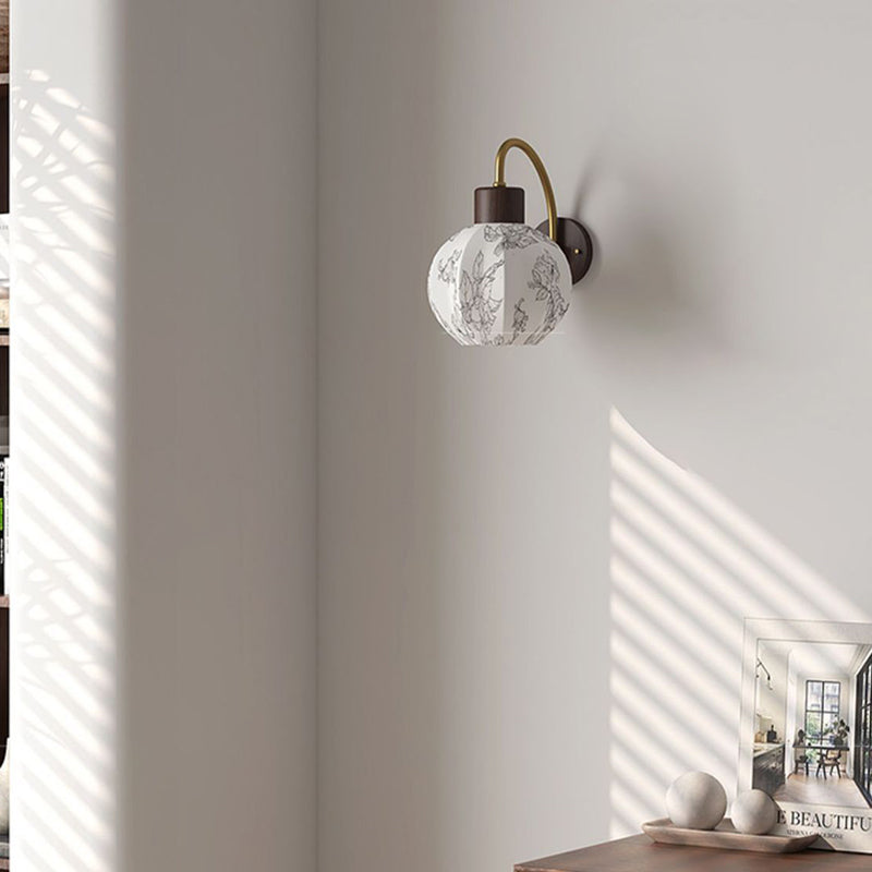 Traditional Vintage Spherical Cylinder Flower Pattern Iron Wooden Fabric 1-Light Wall Sconce Lamp For Bedroom