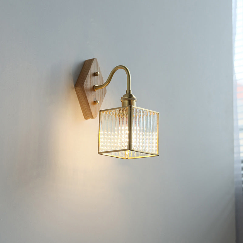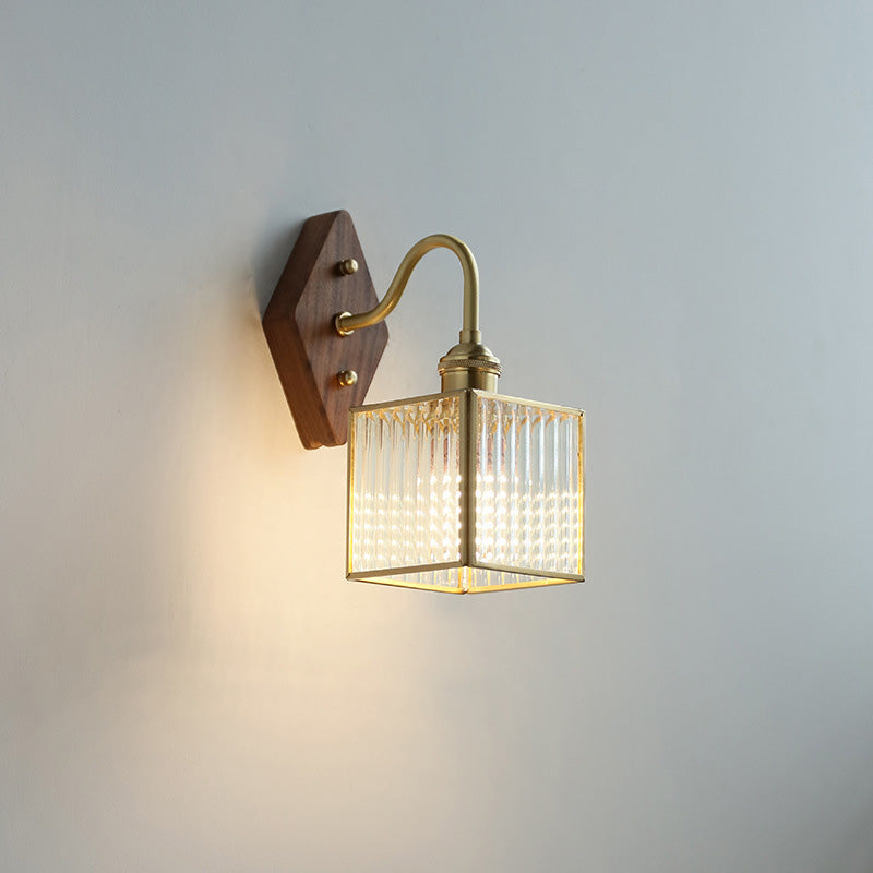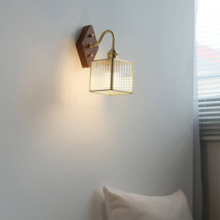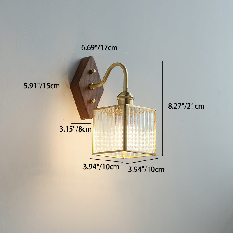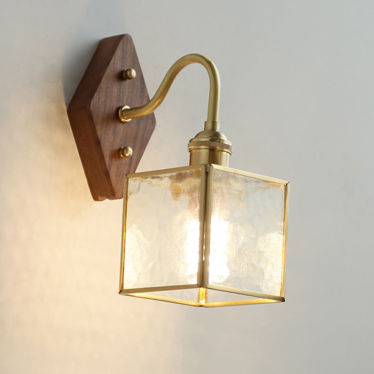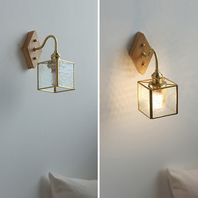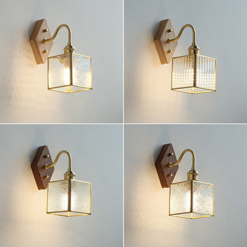 Traditional Vintage Square Copper Glass Wood 1-Light Wall Sconce Lamp For Bedroom