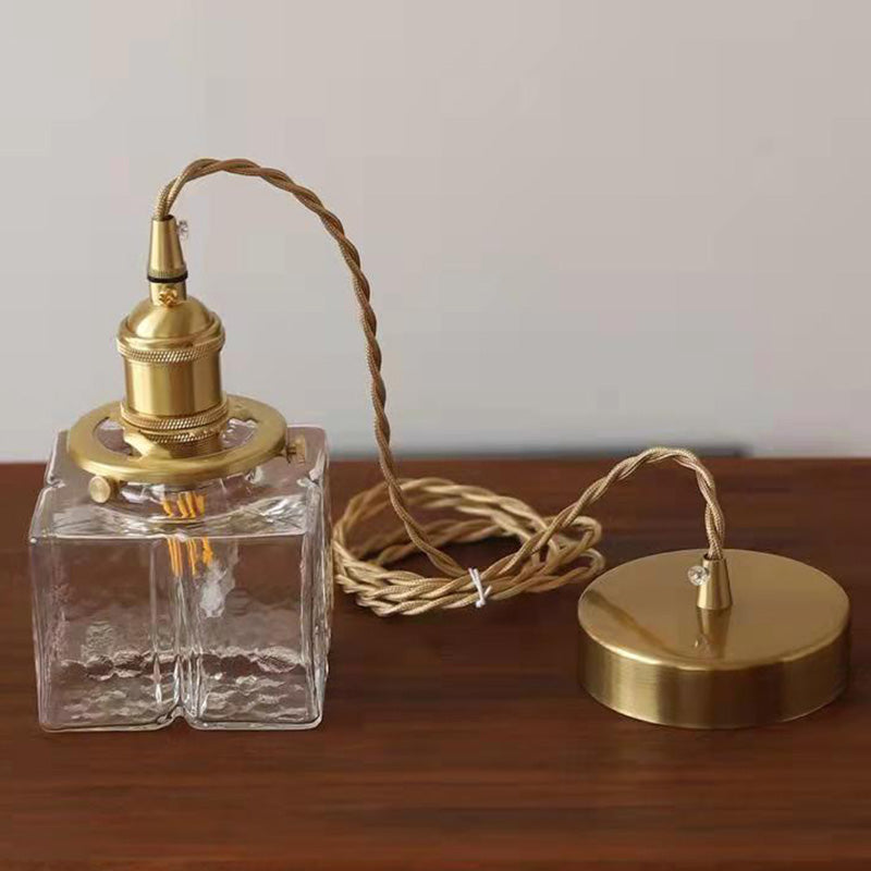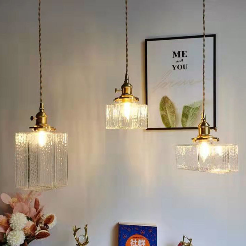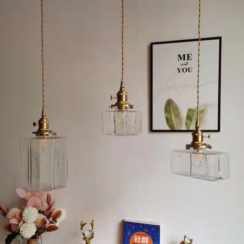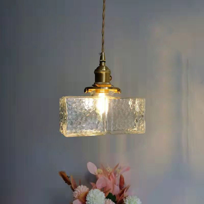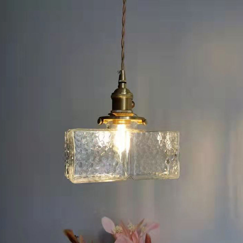 Traditional Vintage Square Rectangle Ripple Glass Iron 1-Light Pendant Light For Living Room