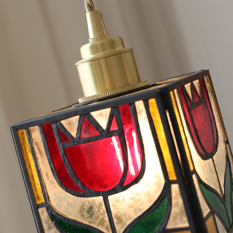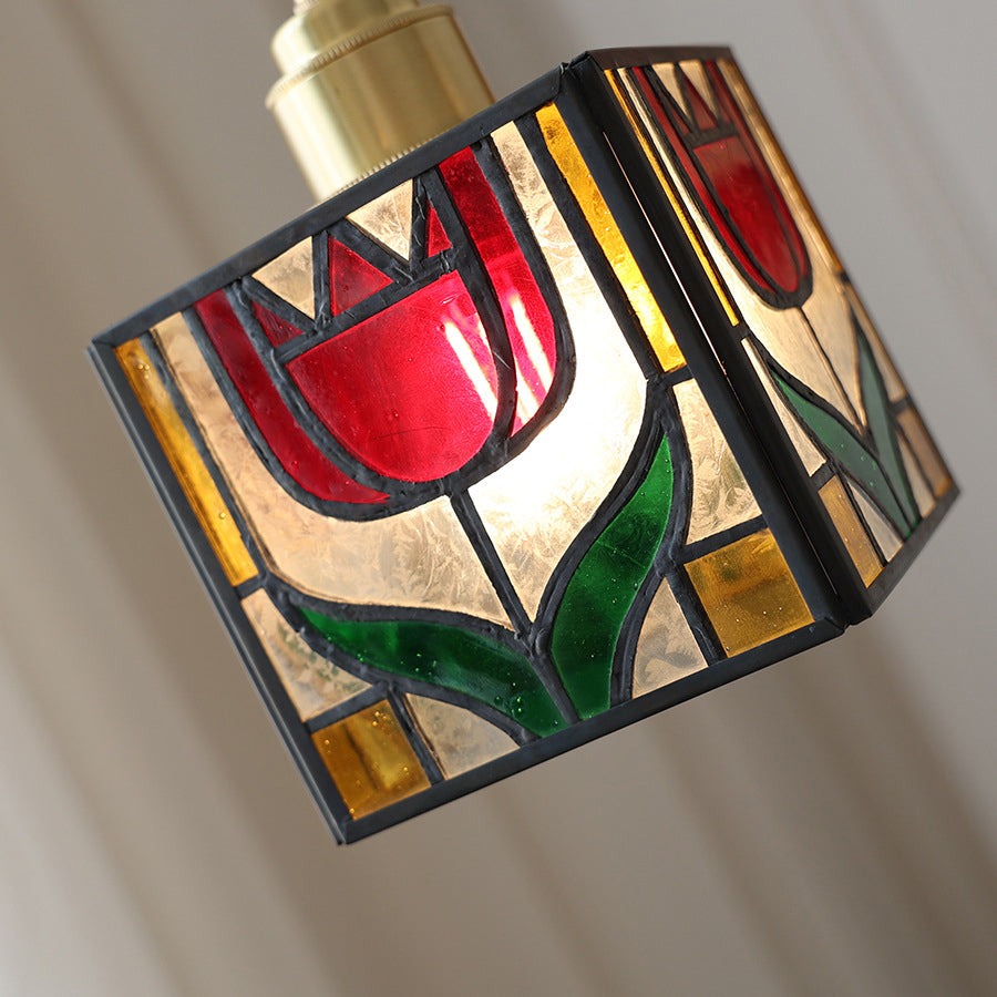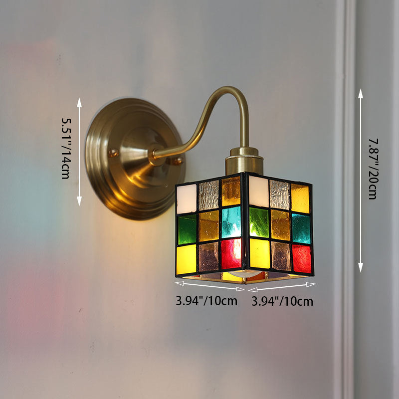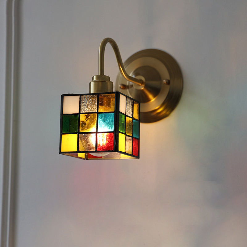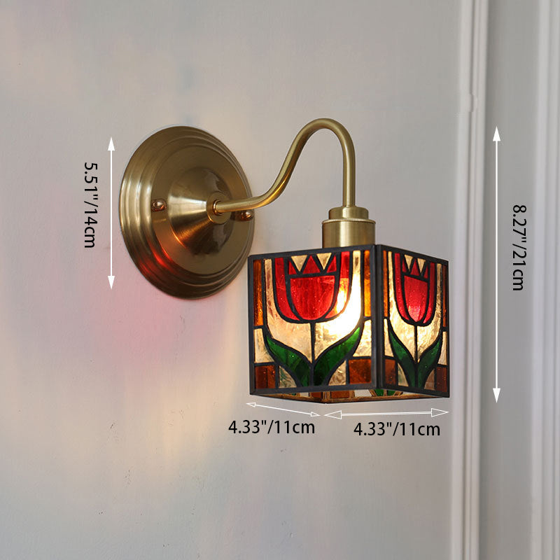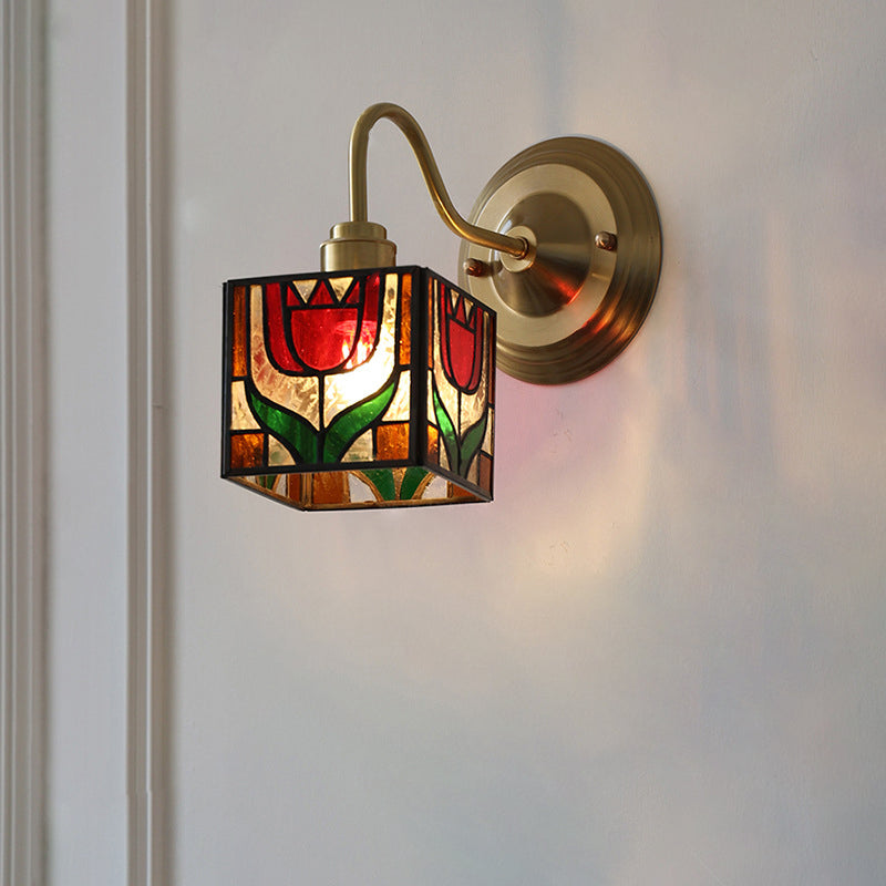 Traditional Vintage Square Rubik's Cube Tulip Brass Glass 1-Light Wall Sconce Lamp For Living Room