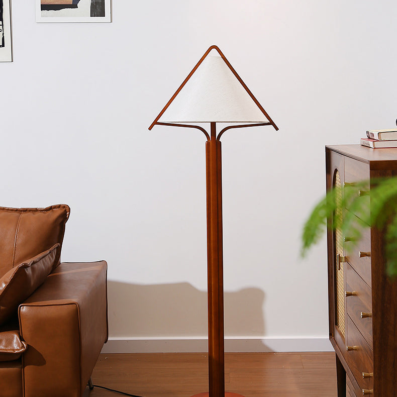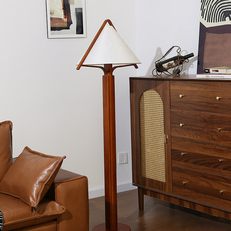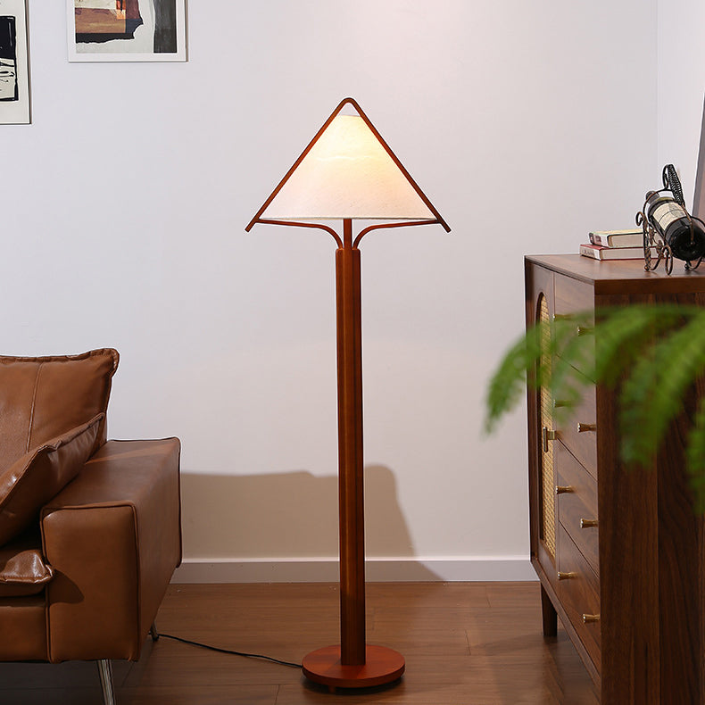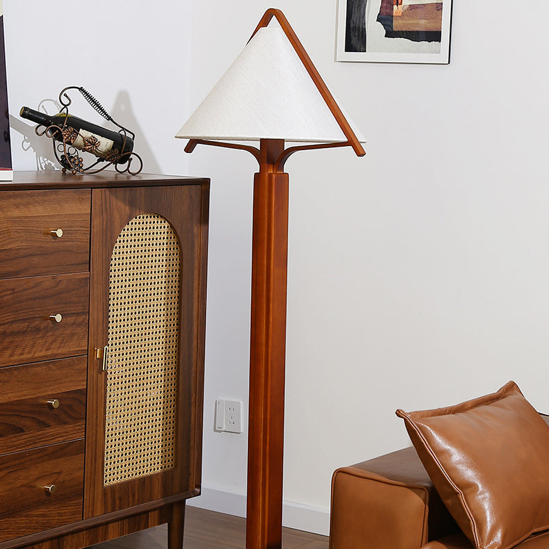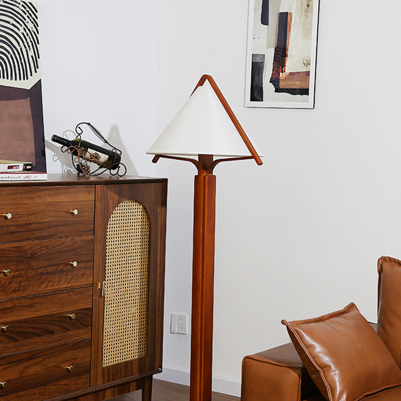 Traditional Vintage Triangle Shape Round Cone Wood Linen 1-Light Standing Floor Lamp For Bedroom