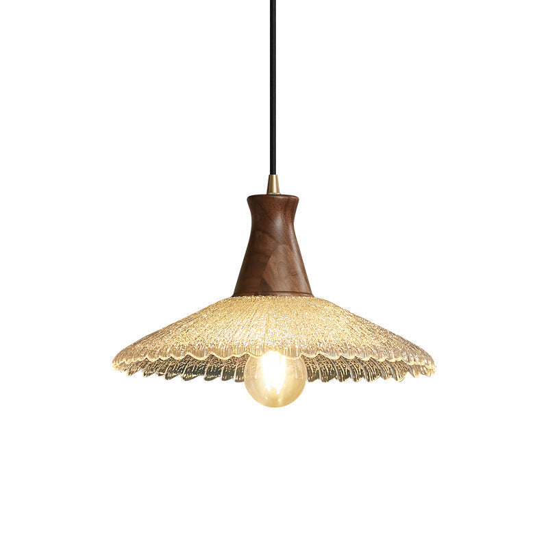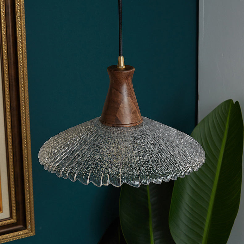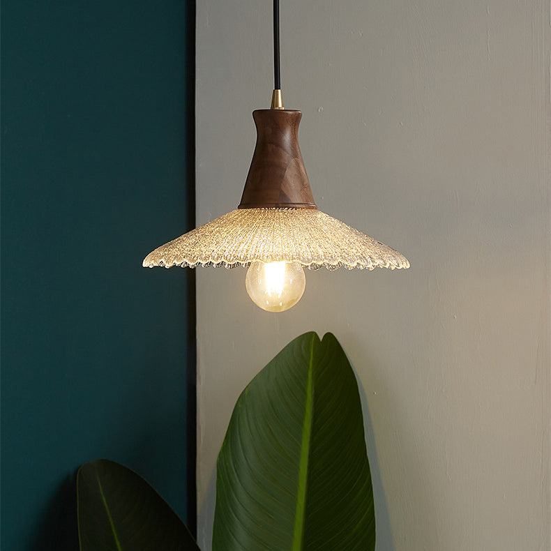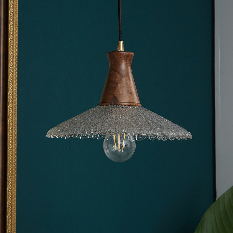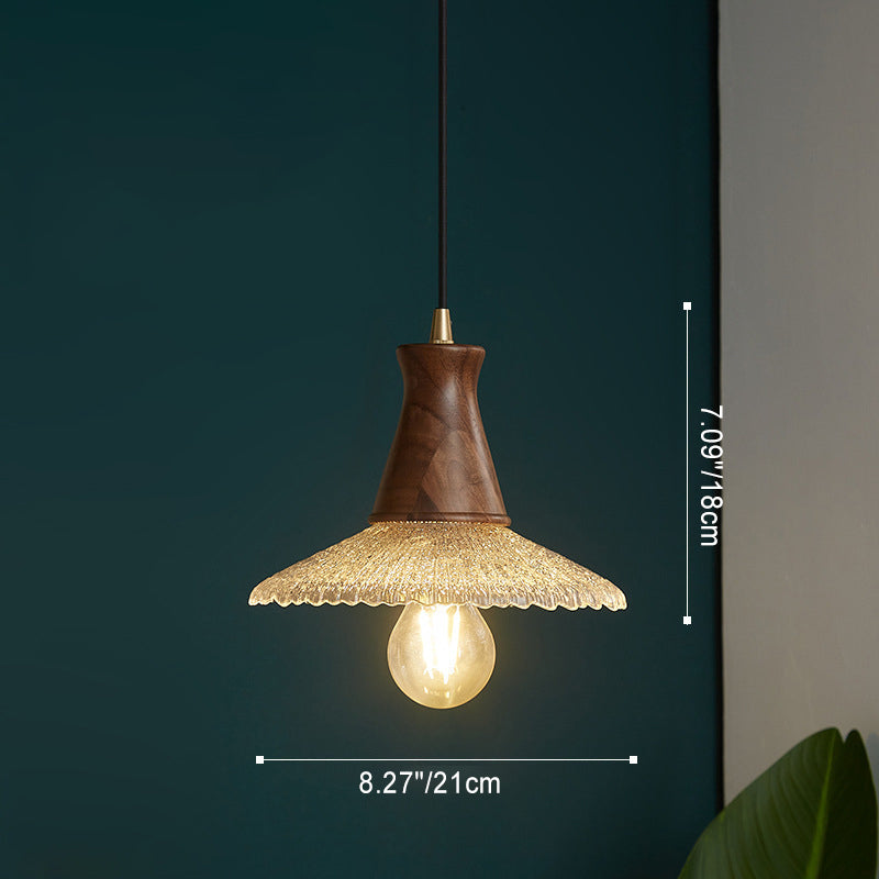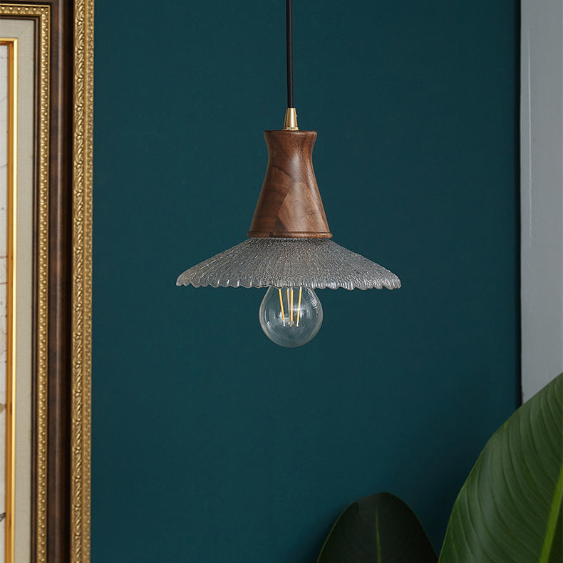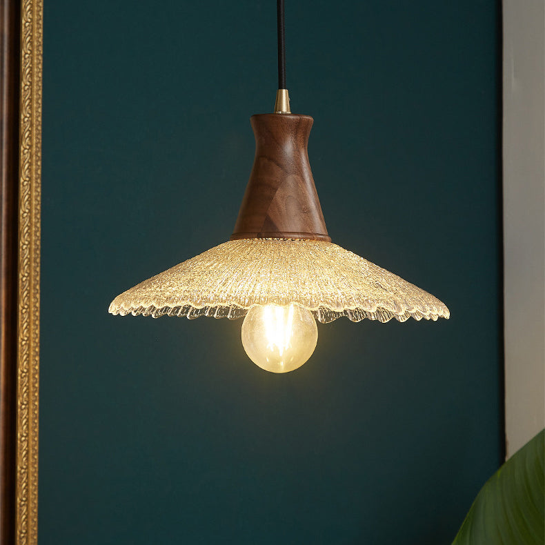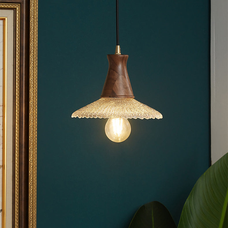 Traditional Vintage Water Ripple Tapered Glass Solid Wood 1-Light Pendant Light For Living Room