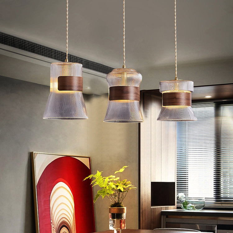 This vintage-inspired pendant light features a unique irregular geometric cylinder design crafted from premium wood, glass, and brass. Available in natural wood and walnut finishes, its adjustable hanging cord allows for customized height, making it a stylish and functional choice for bedrooms and living spaces.