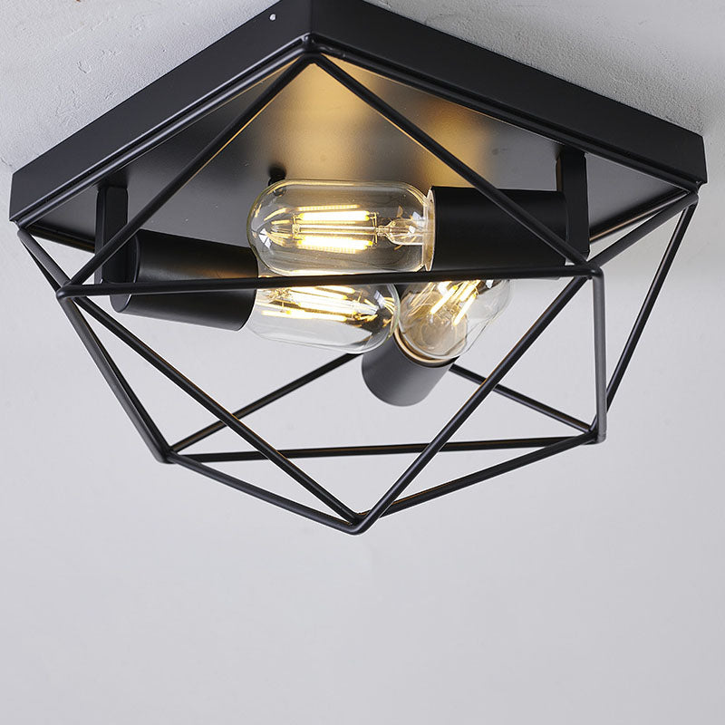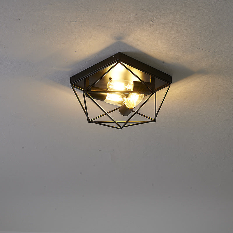 Vintage Industrial Black Iron Diamond Geometry 3-Light Flush Mount Ceiling Light