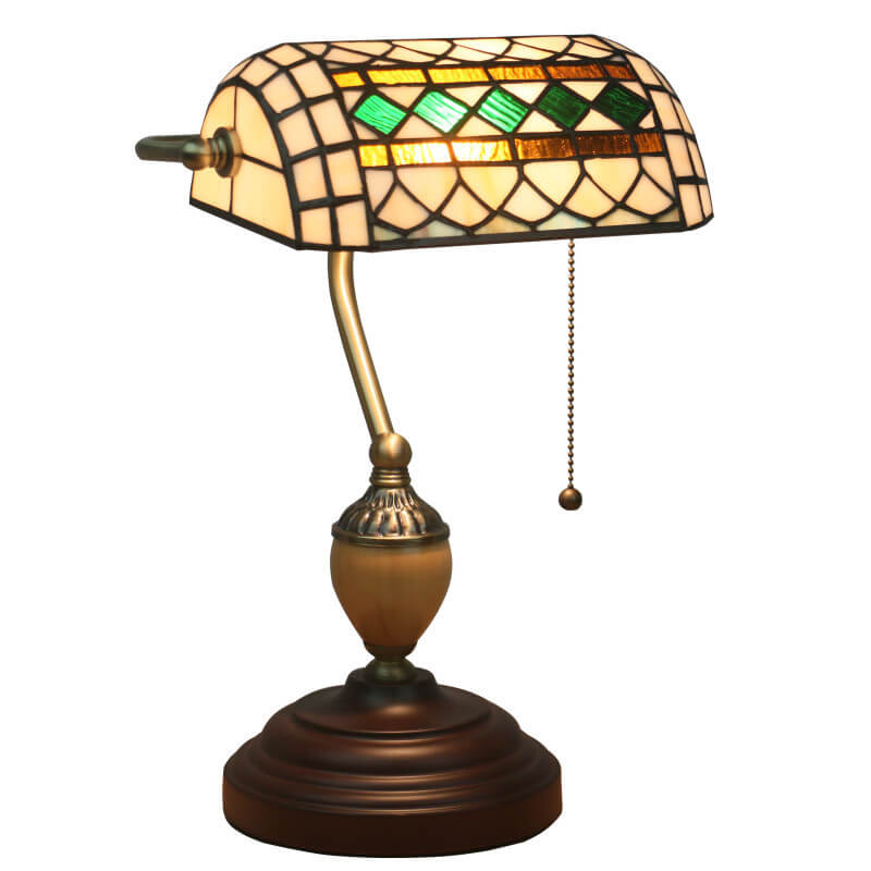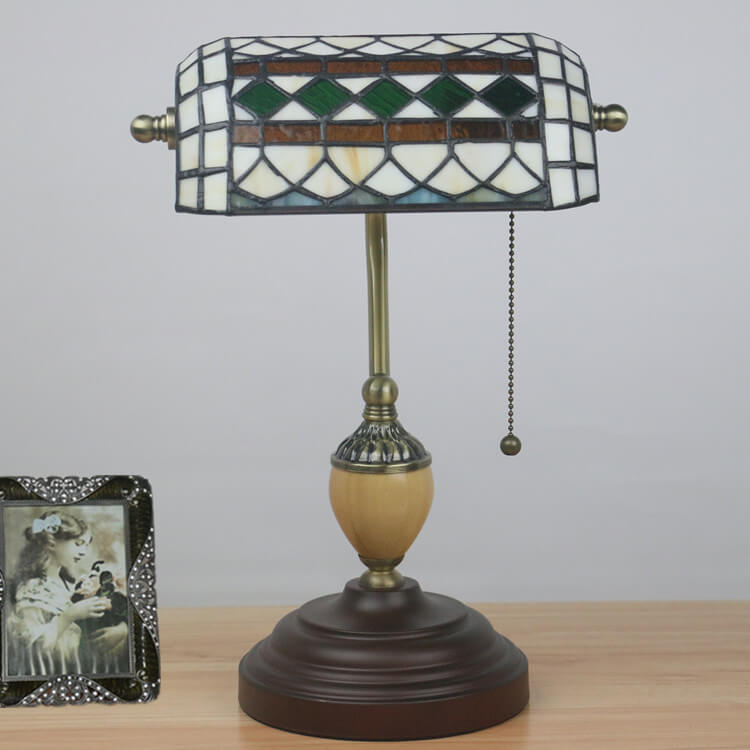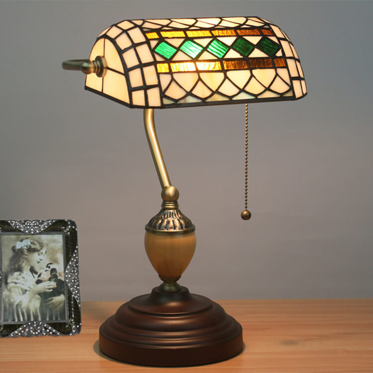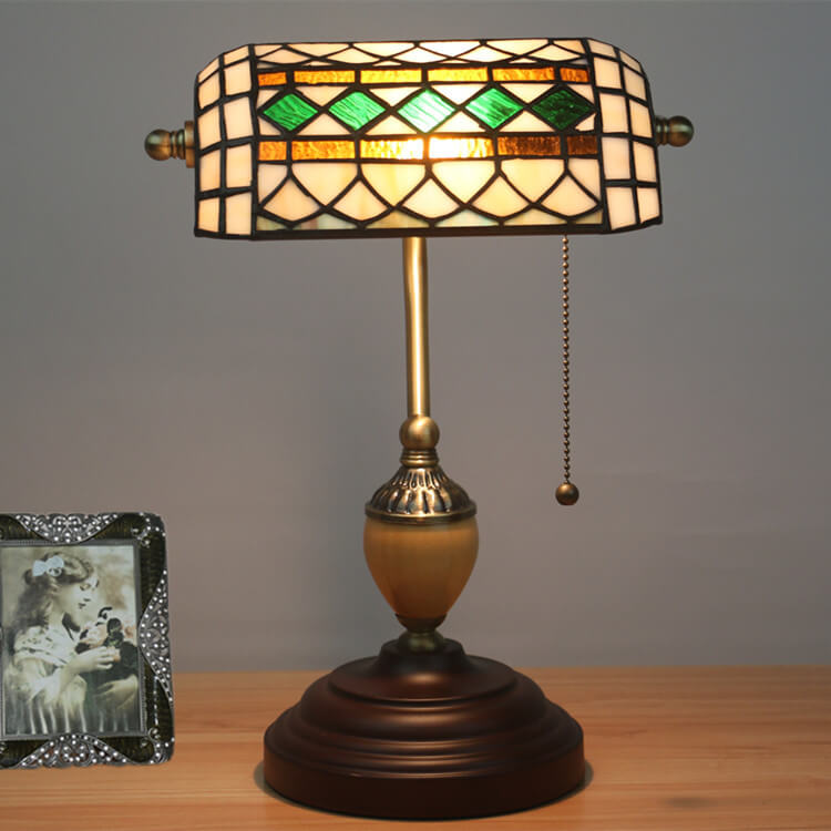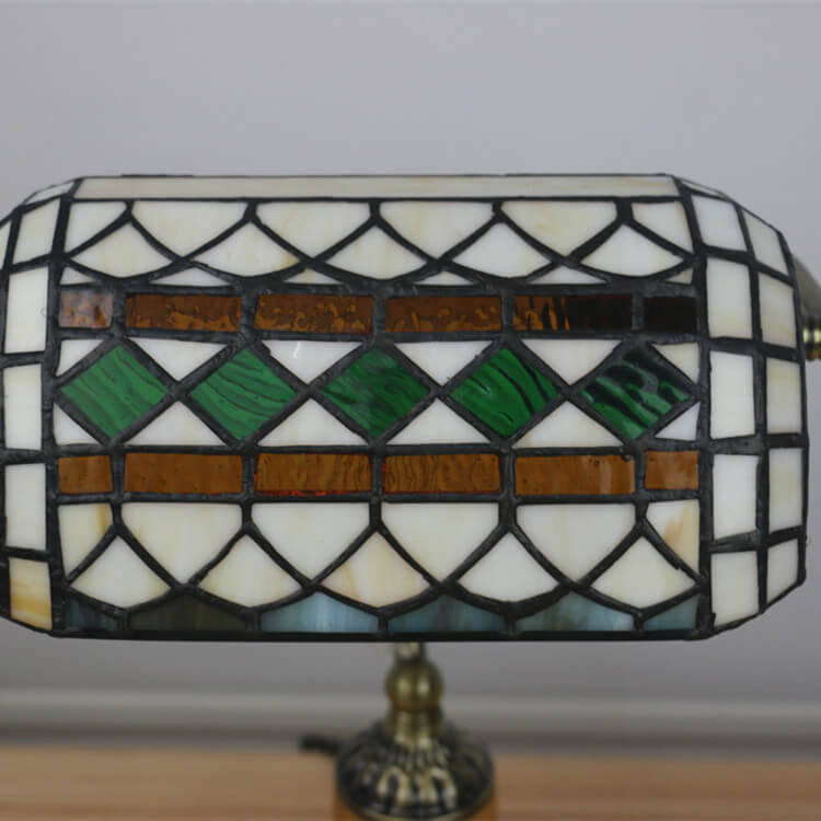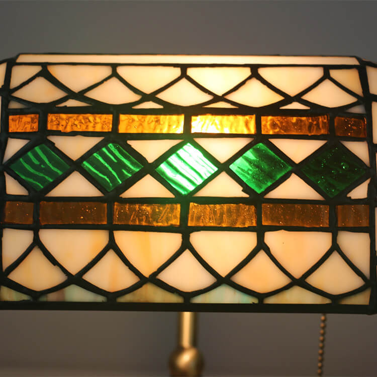 Vintage Tiffany Diamond Line Stained Glass 1-Light Bank Table Lamp