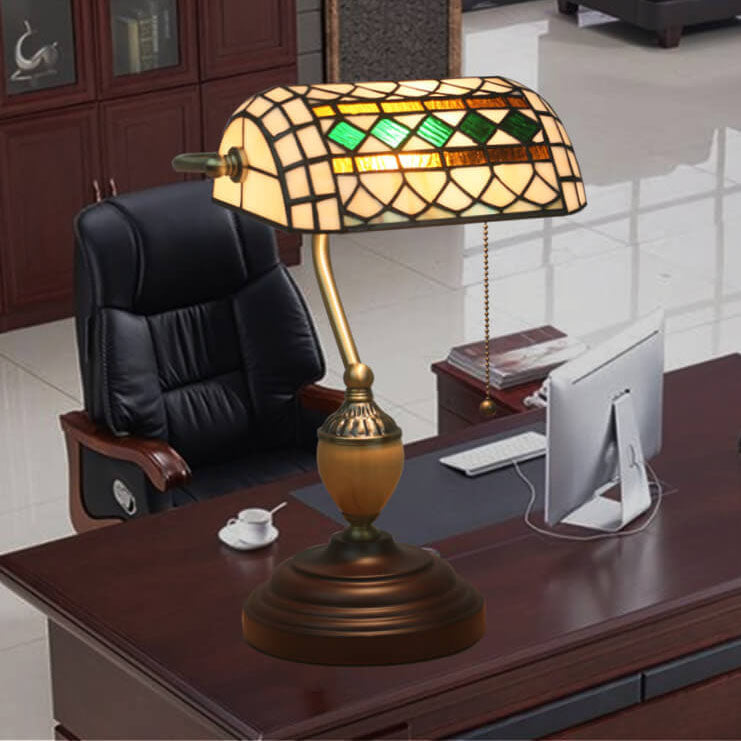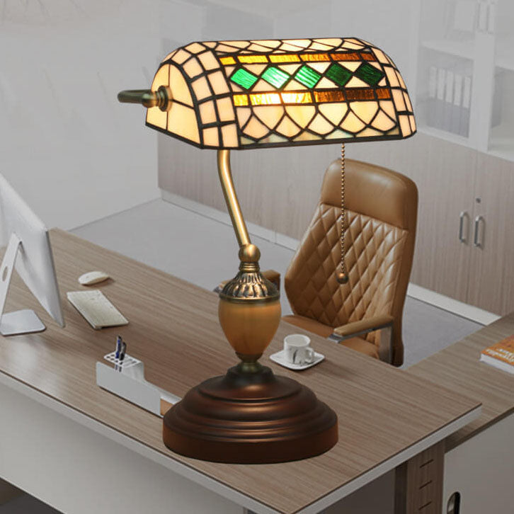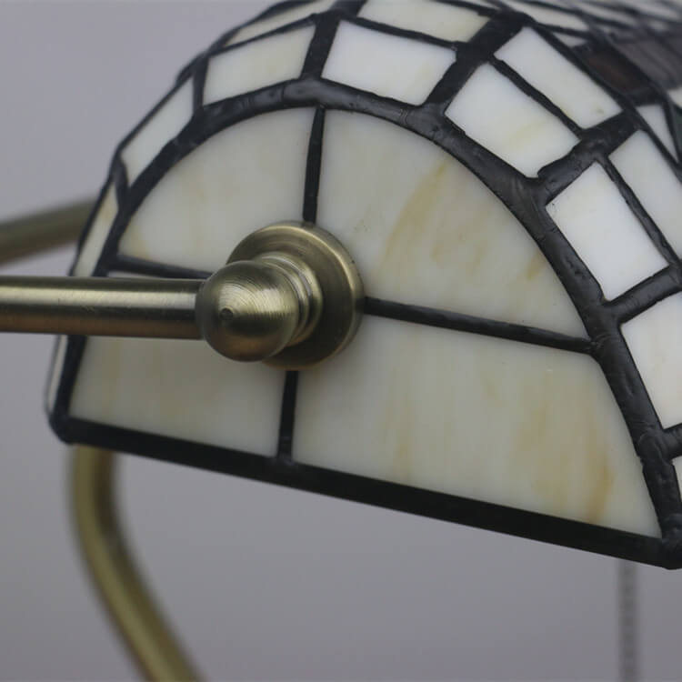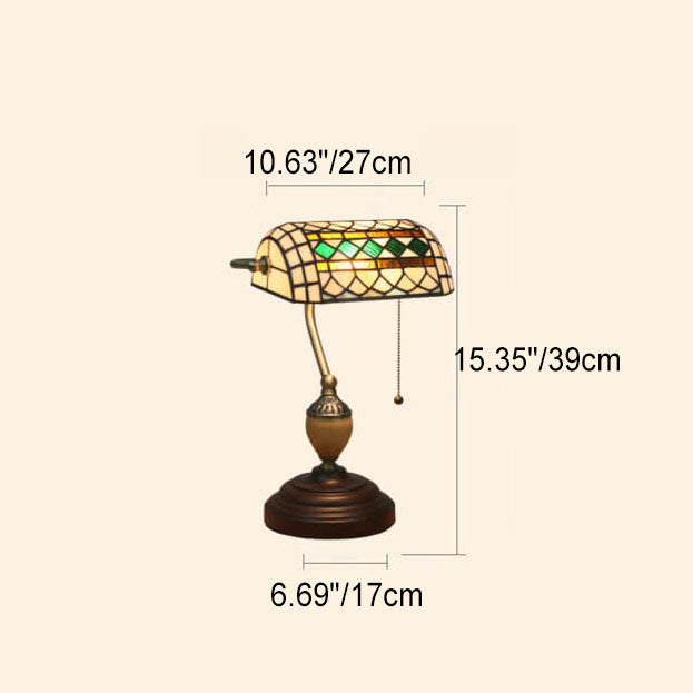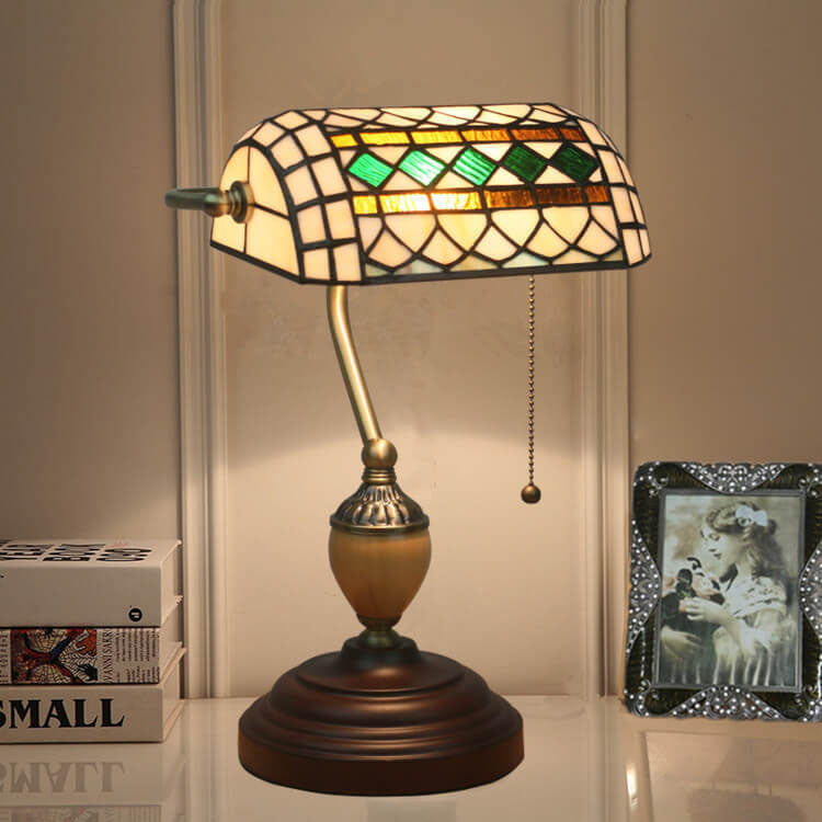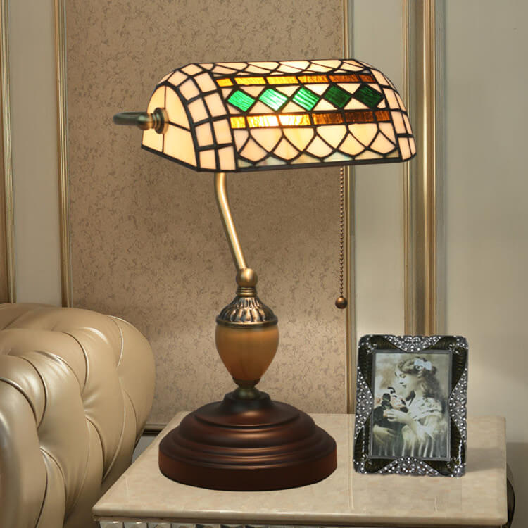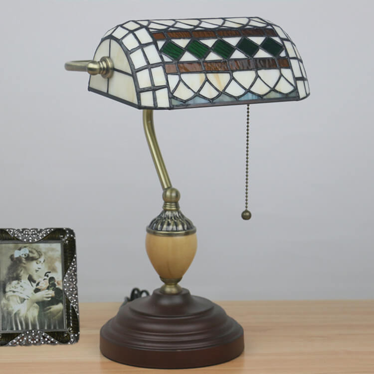 Vintage Tiffany Diamond Line Stained Glass 1-Light Bank Table Lamp